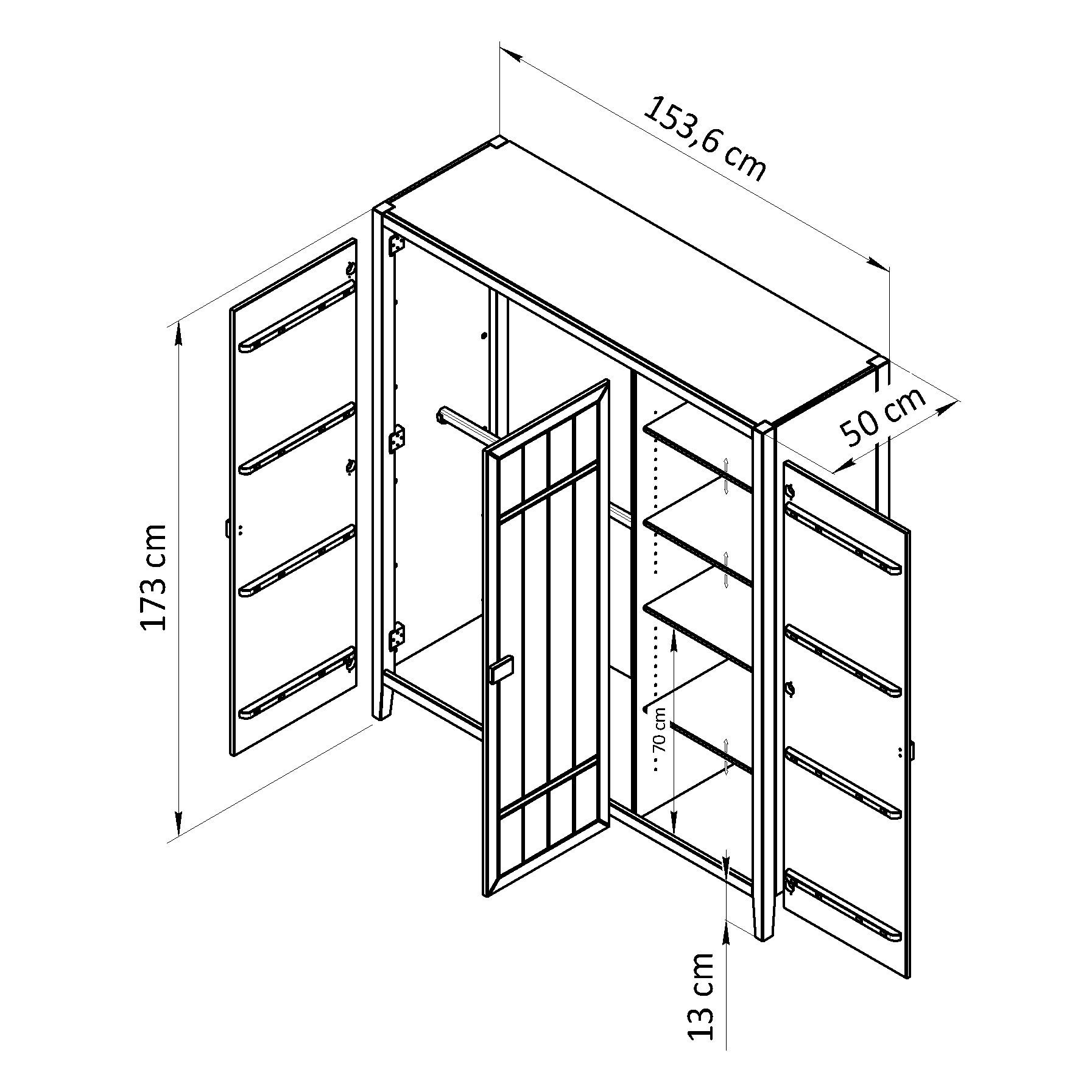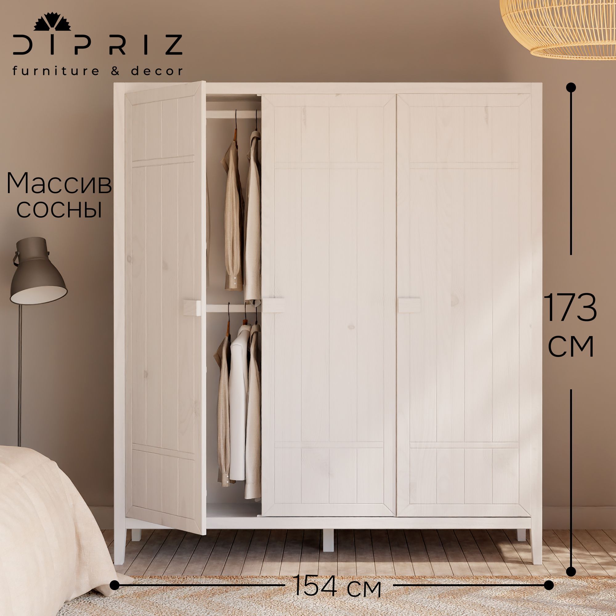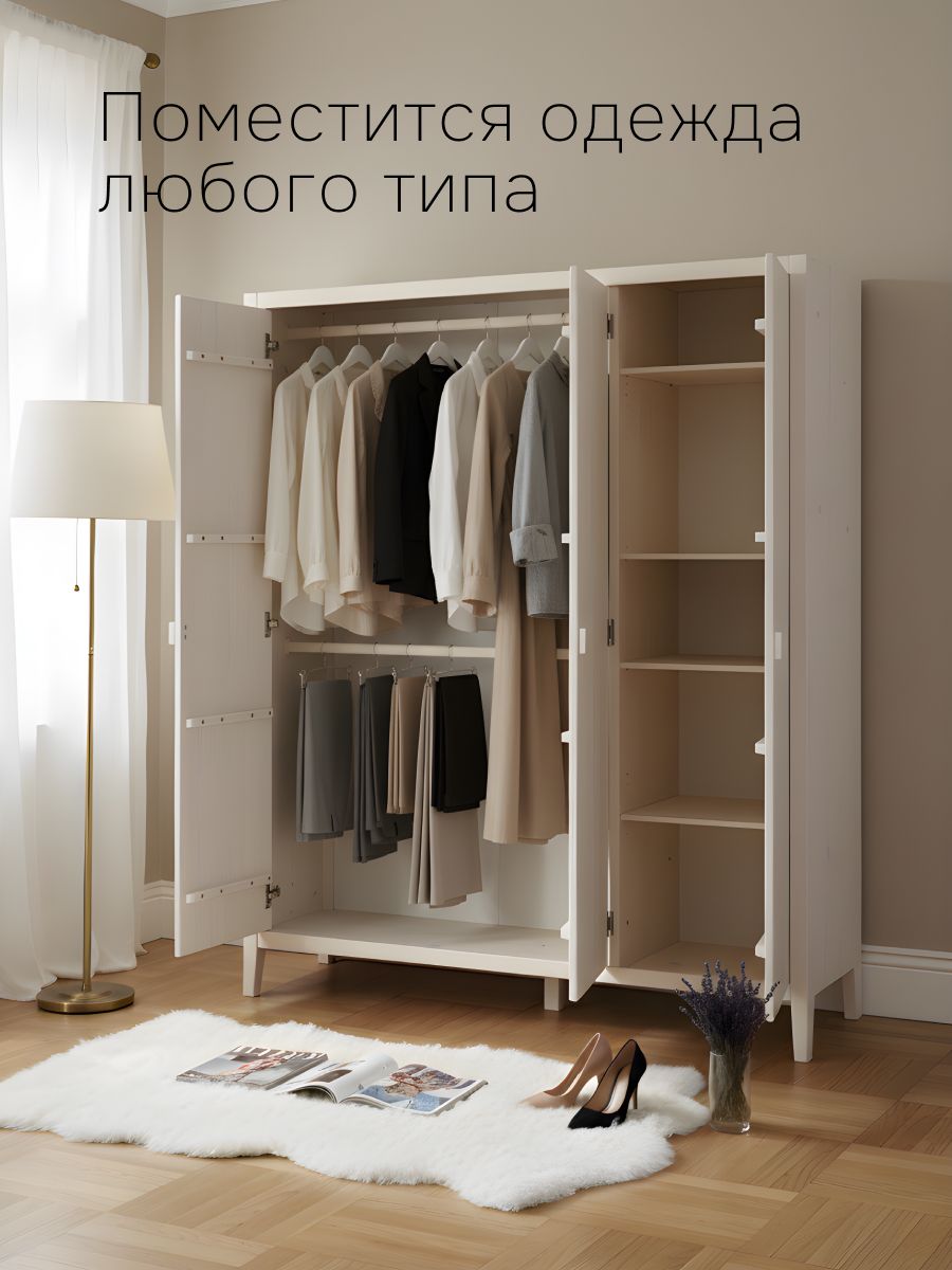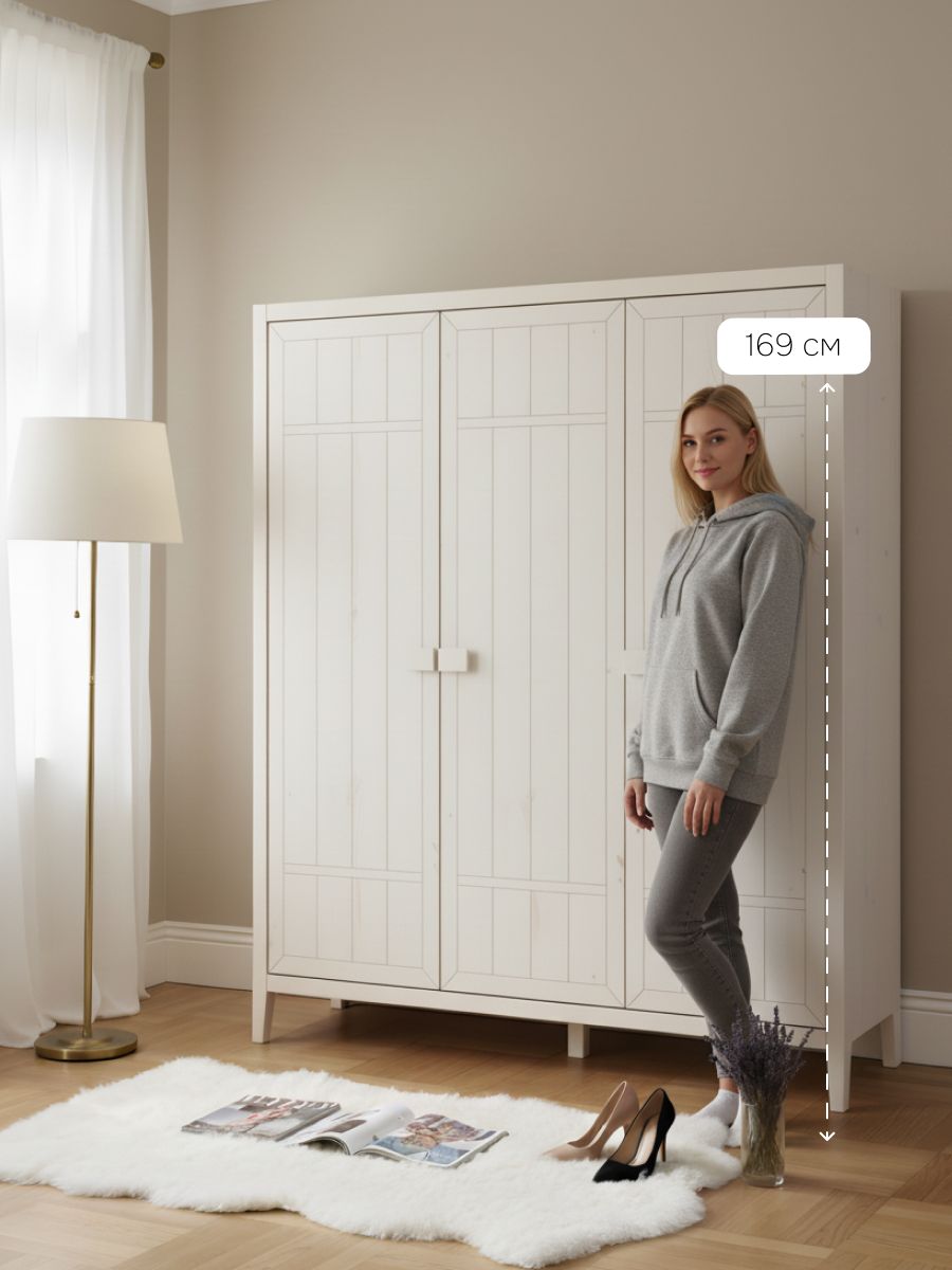 С габаритами 154x50x173 см Карлос легко впишется в любое пространство вашей комнаты, а высота ножек в 13 см обеспечит надежную стабильность и удобство использования. Напольный белый шкаф для спальни изготовлен из натурального массива сосны, корпус, фасады, ручка - из массива сосны толщиной t=18 мм, стенки, полик, перегородки толщиной t=14 мм, задняя стенка из ДВП толщиной t=3 мм, сечение ножек - 50х40 мм.