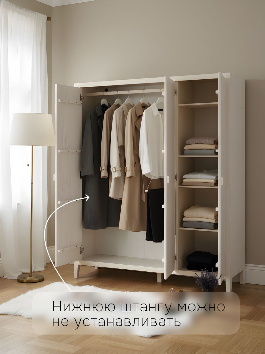 Распашные двери с декоративными фасадами подчеркнут ваш индивидуальный стиль и придадут интерьеру неповторимый шарм. Дверные ручки в стиле прованс добавляет изысканности и завершают образ шкафа. Конструкция распашного шкафа на ножках включает в себя 3 распашные двери с декоративным фасадом, за которыми расположены: 2 штанги для одежды (одна вверху, вторая по центру) и 4 полки (устанавливаемые в разных положениях). Петли шкафа оснащены плавным закрыванием с доводчиком. Максимальная допустимая нагрузка на полку составляет до 5 кг и позволяет хранить любые предметы.