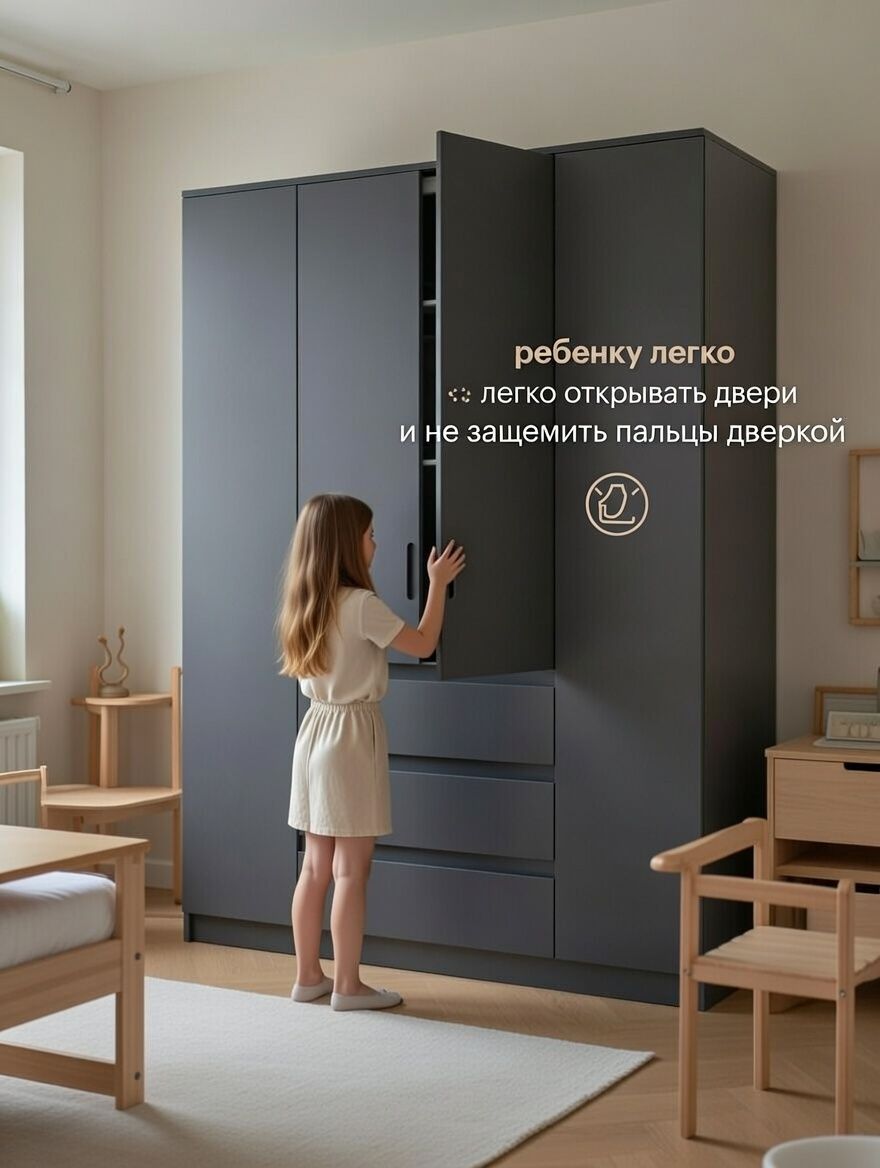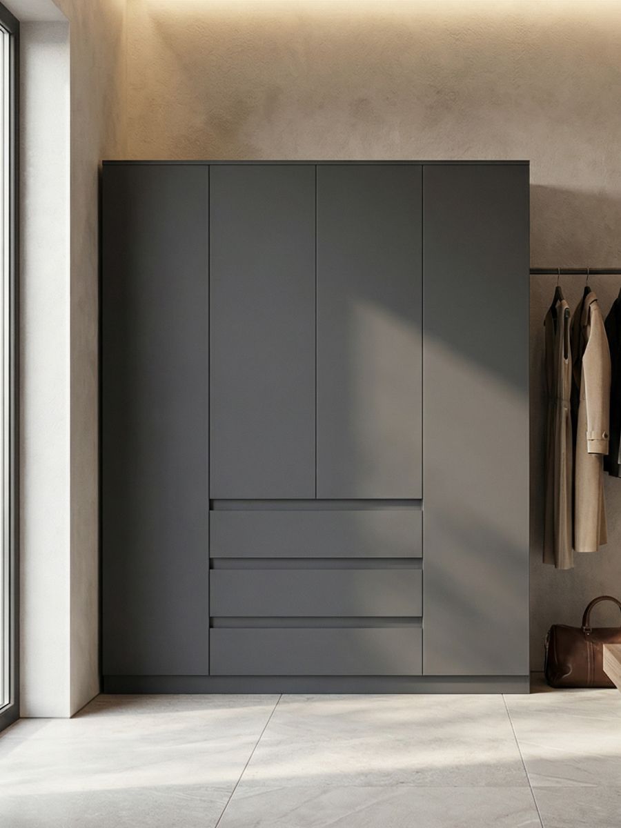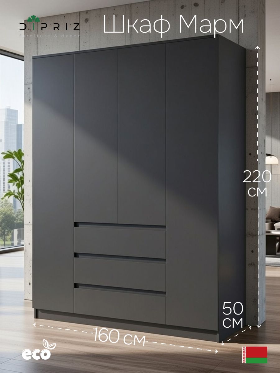 Шкаф распашной серии «Марм» от Dipriz сочетает практичность и современный дизайн. Его компактные размеры (160x50x220 см) обеспечивают вместительность для хранения одежды, аксессуаров и других предметов. Четыре двери с доводчиками и стопорами, три ящика с фиксаторами, регулируемые полки и встроенная штанга позволяют организовать пространство максимально эффективно.