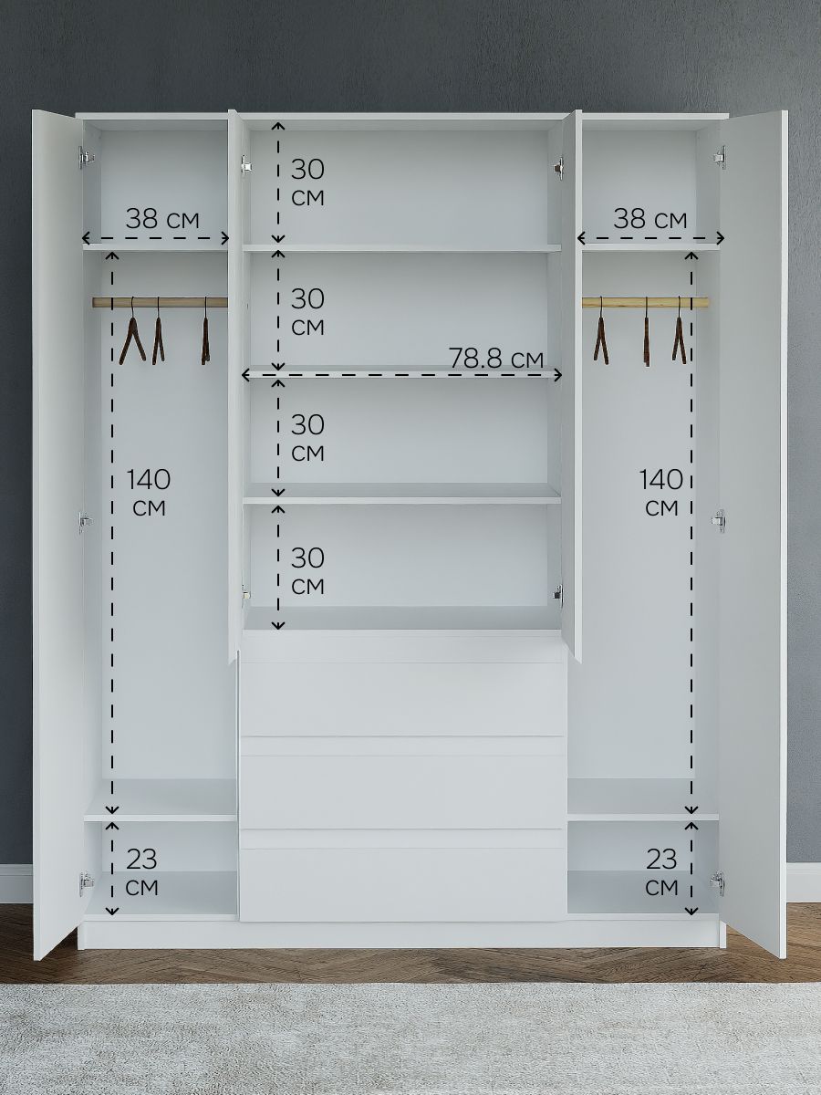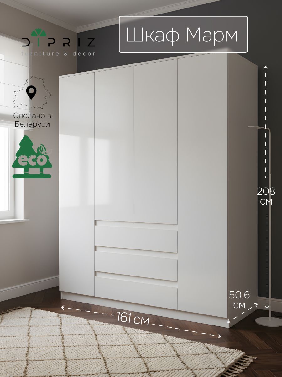 Шкаф для одежды Марм от белорусского производителя Dipriz - отличное дополнение скандинавского интерьера. Четырехдверный распашной шкаф с 3 ящиками создаст порядок в любой комнате, будь то прихожая, спальня, гостиная, ванная или детская комната.