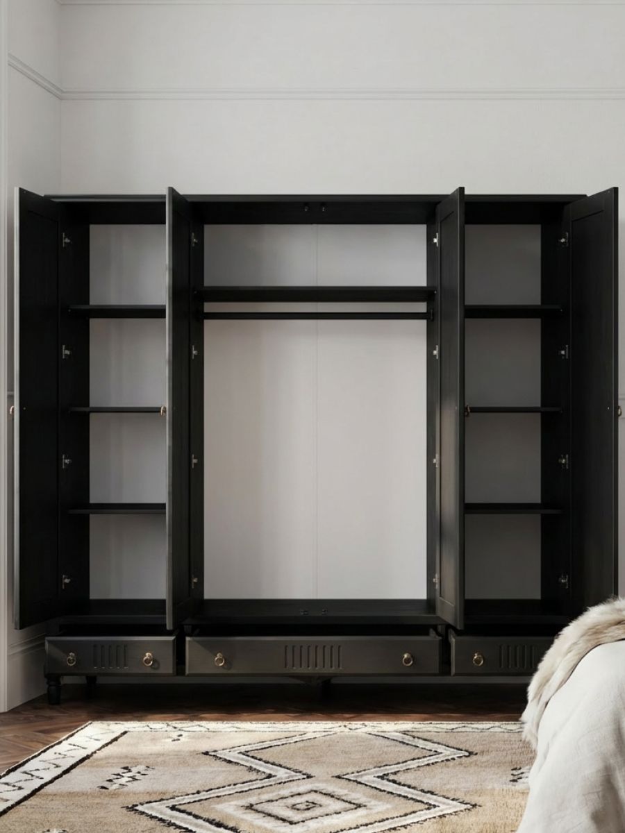 Элегантный четырехдверный шкаф выполнен из массива березы и дерева, что гарантирует долговечность и естественную красоту. Черный цвет фасада дополняет классический итальянский дизайн, идеально подходящий для спальни или гостиной.