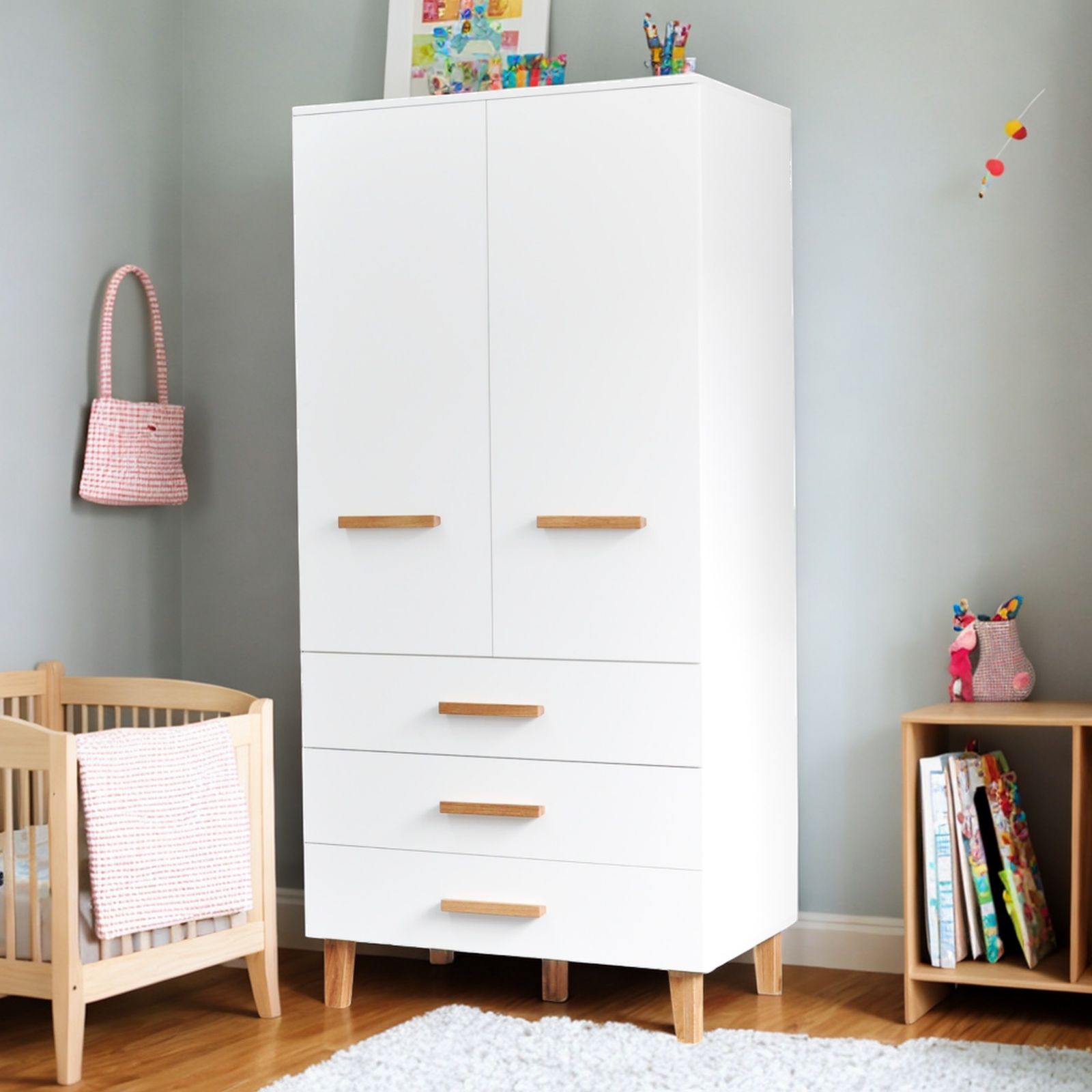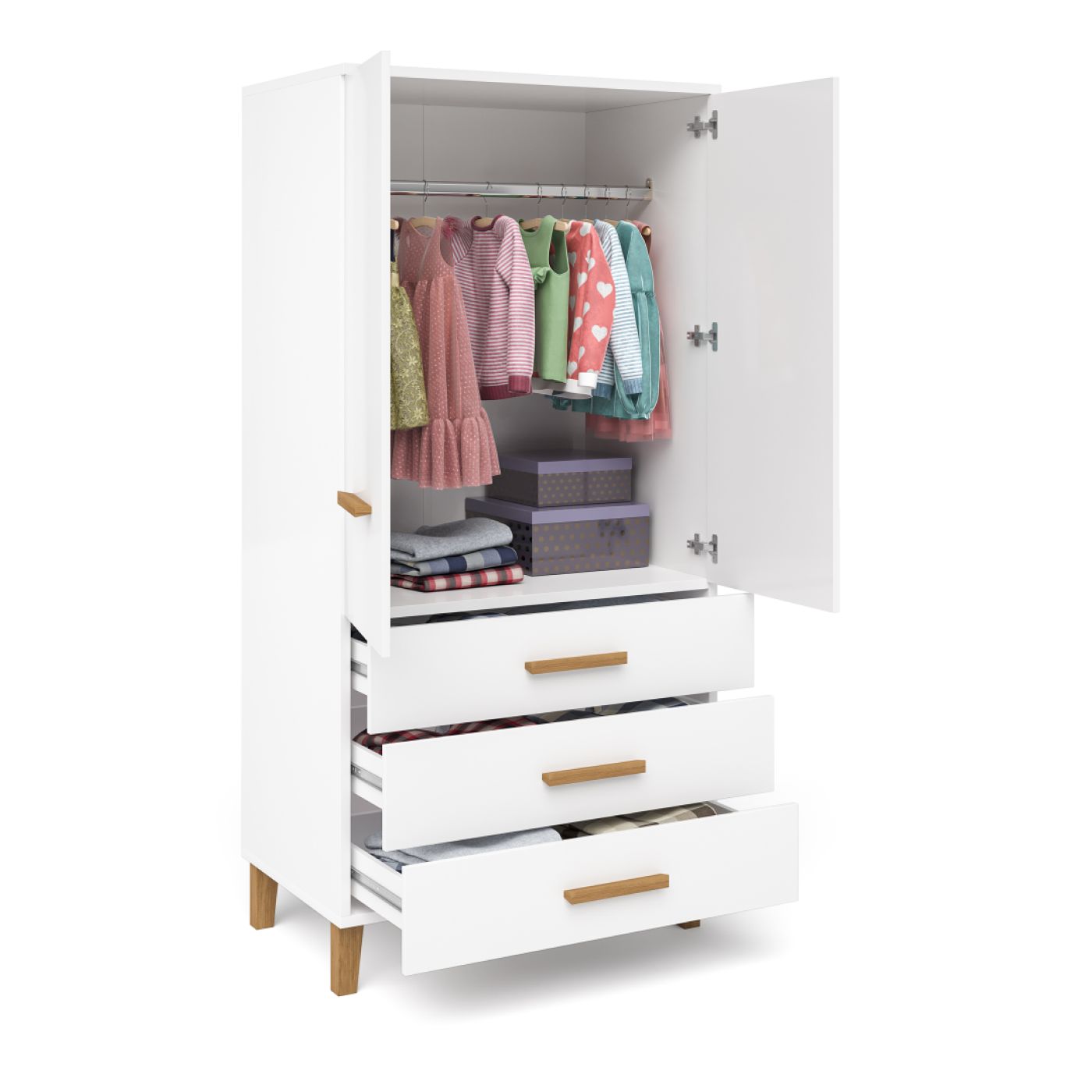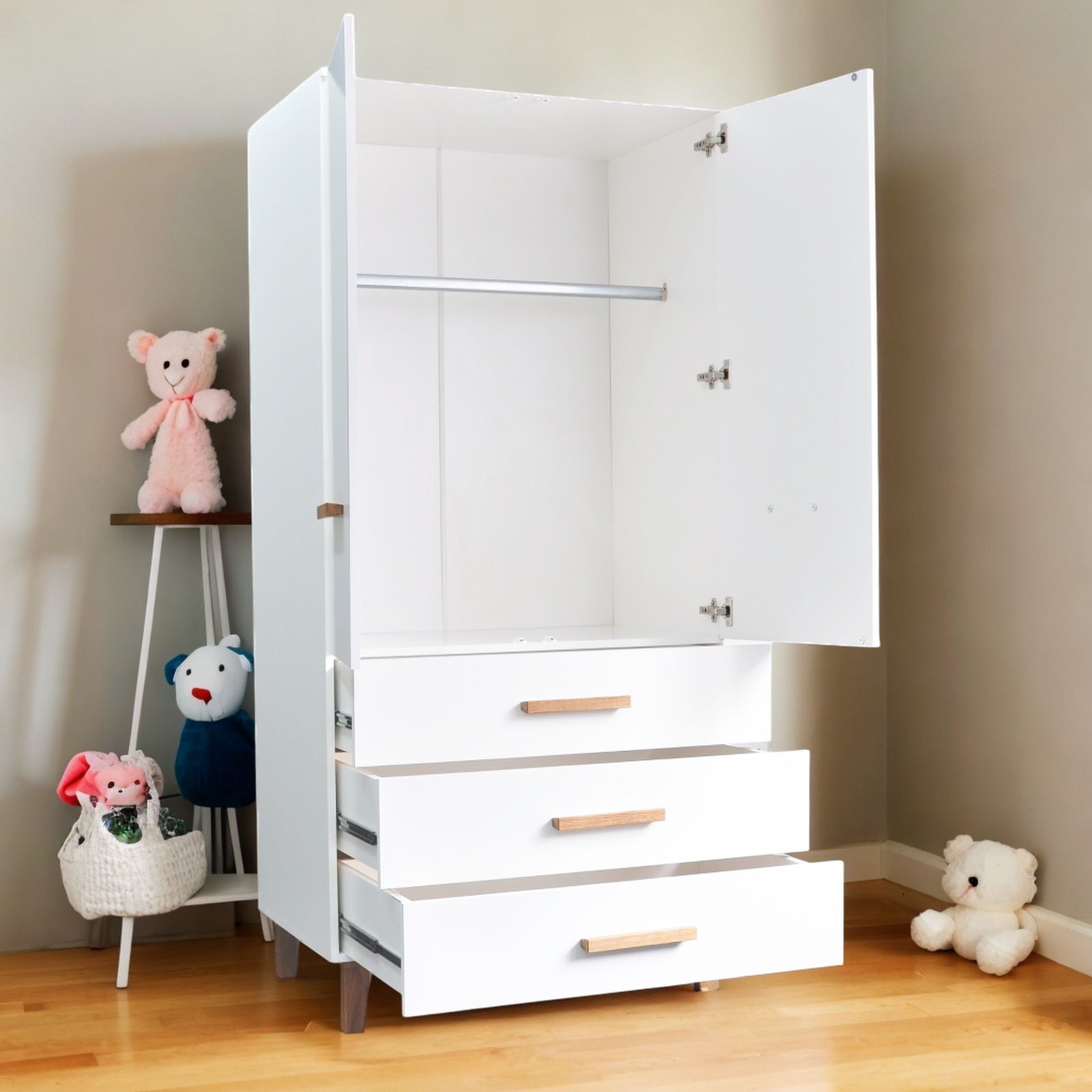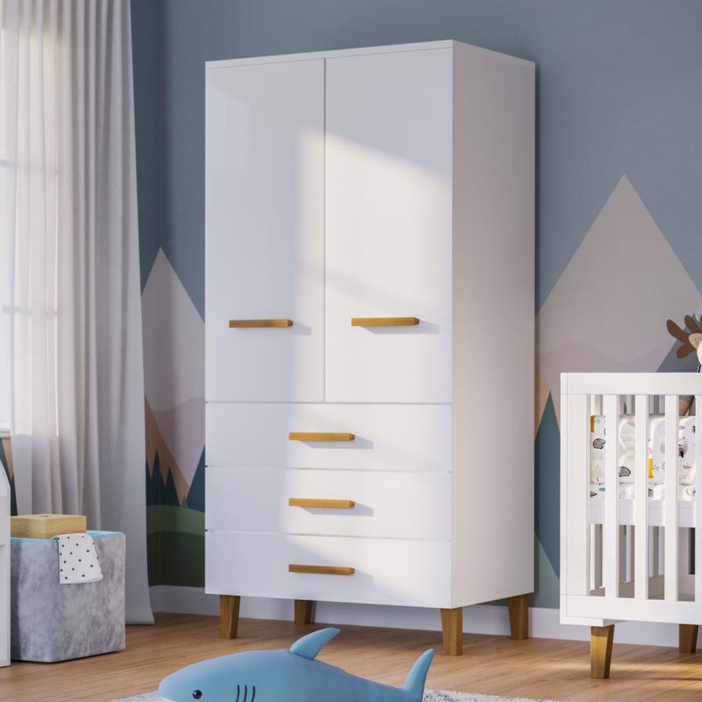 Шкаф для одежды с двумя дверями и тремя ящиками из коллекции — это совершенное сочетание функциональности и элегантности для вашей детской комнаты. Продуманный дизайн и удобная система хранения делают этот шкаф идеальным решением для организации пространства.