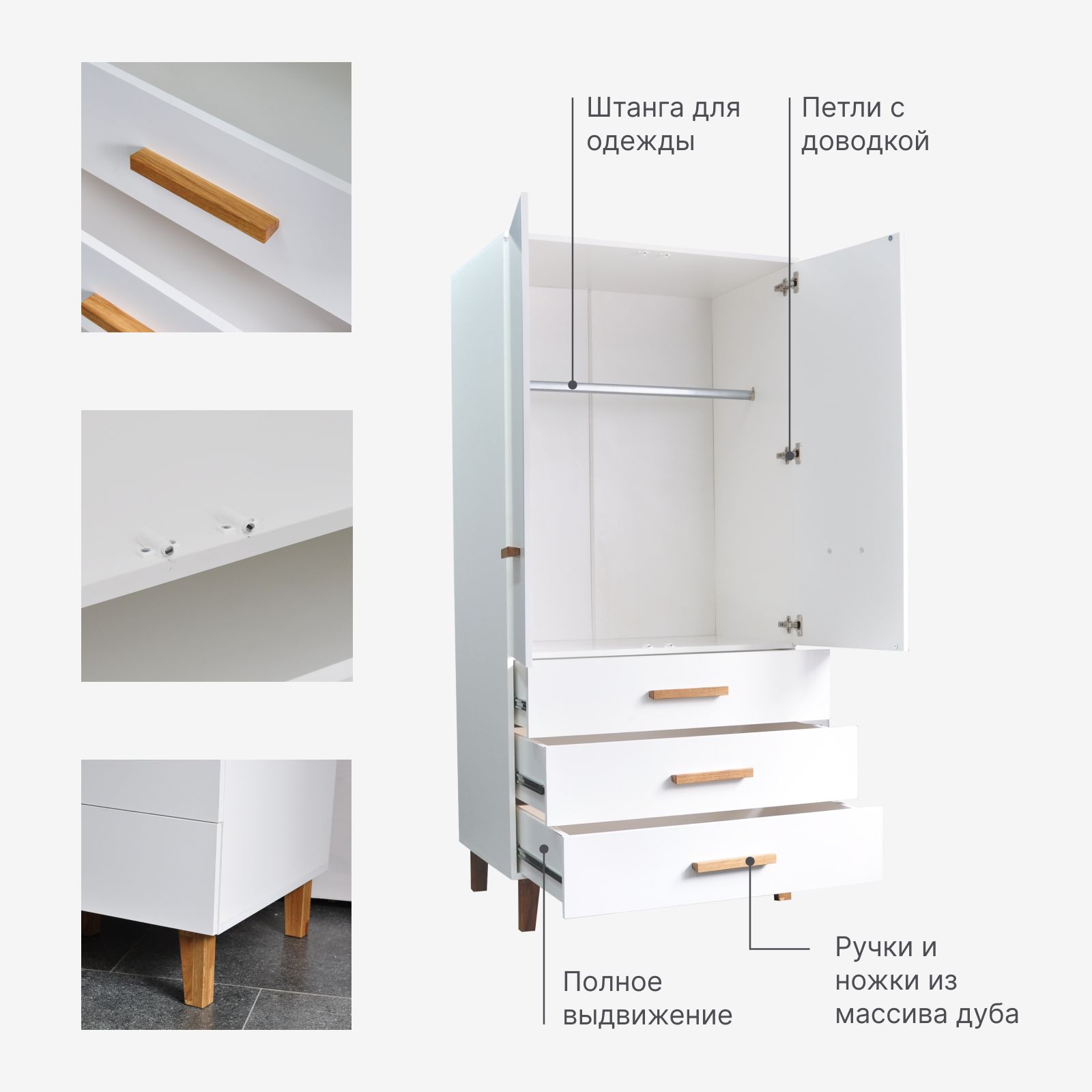 Шкаф изготовлен из высококачественных материалов, ЛДСП и ДВП, обеспечивая долговечность и надежность. Ножки и ручки, выполненные из массива дуба и покрыты лаком, что добавляет природную красоту и утонченность изделию. Для ящиков и петель используется фурнитура , которая гарантирует долгий срок службы фурнитуры. Ящики выдвигаются полностью, благодаря чему вам легко будет использовать даже самые отдаленные части ящика, а для организации порядка легко использовать органайзер в шкаф. Петли оснащены доводчиками, благодаря чему двери будут плавно и тихо закрываться и не создадут никакого шума.