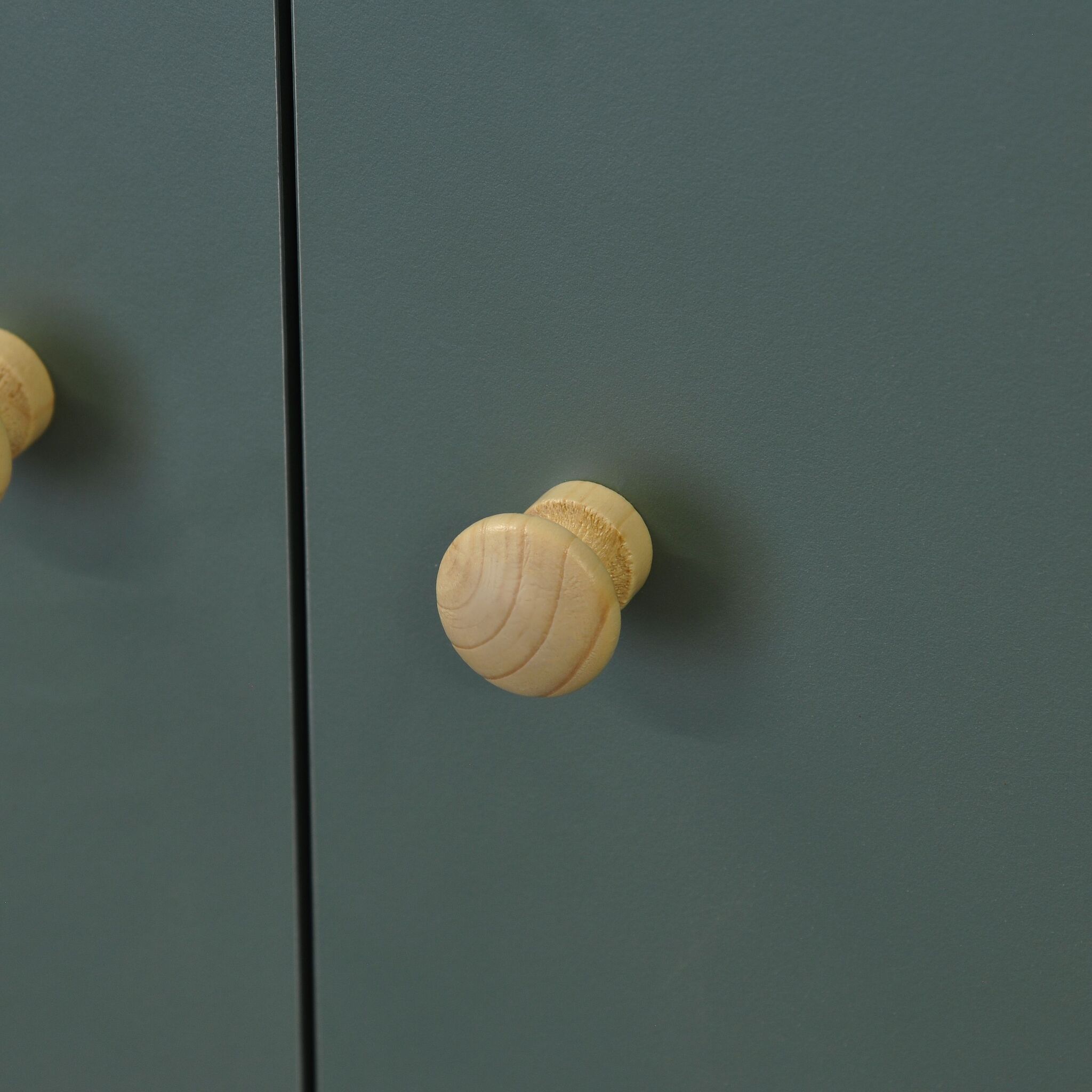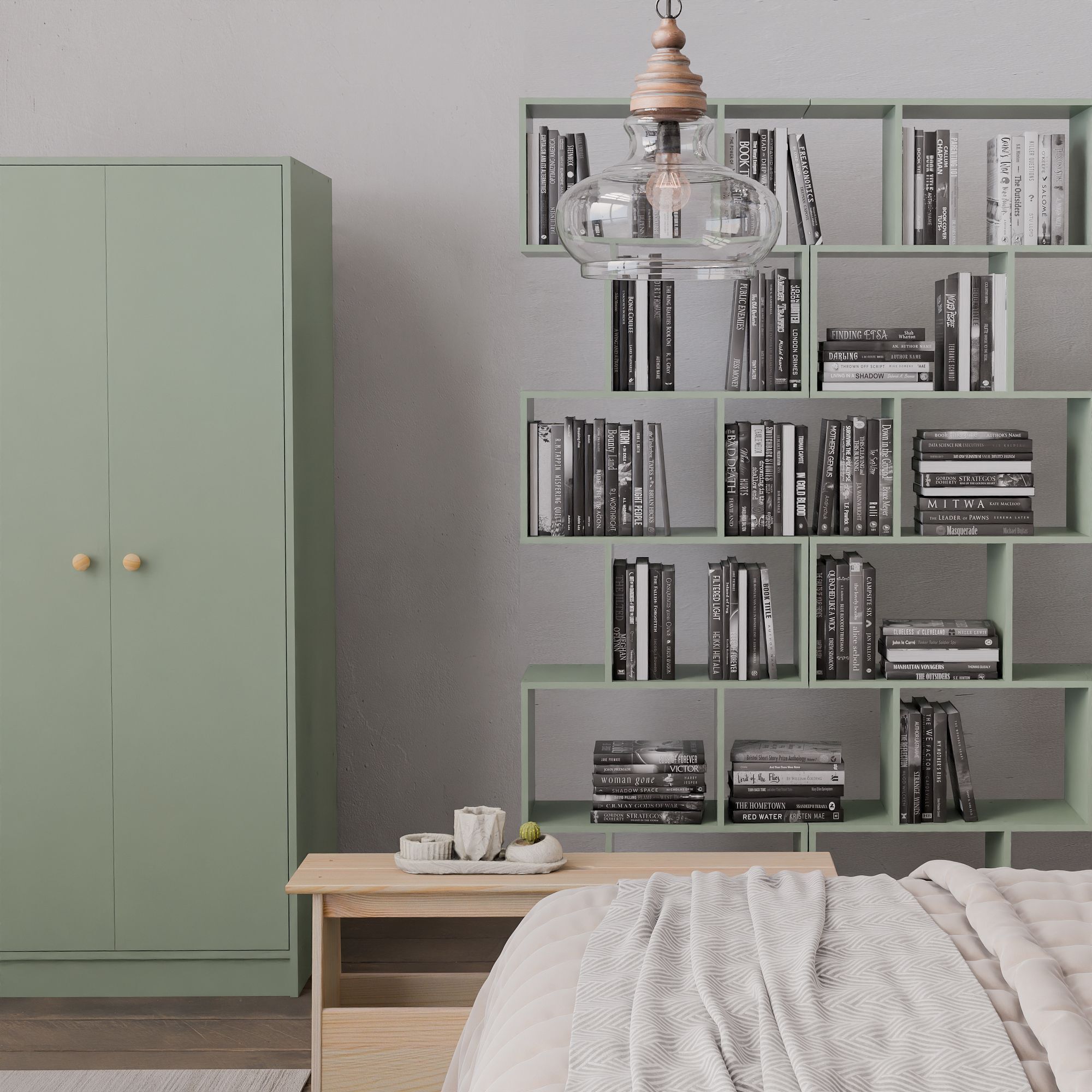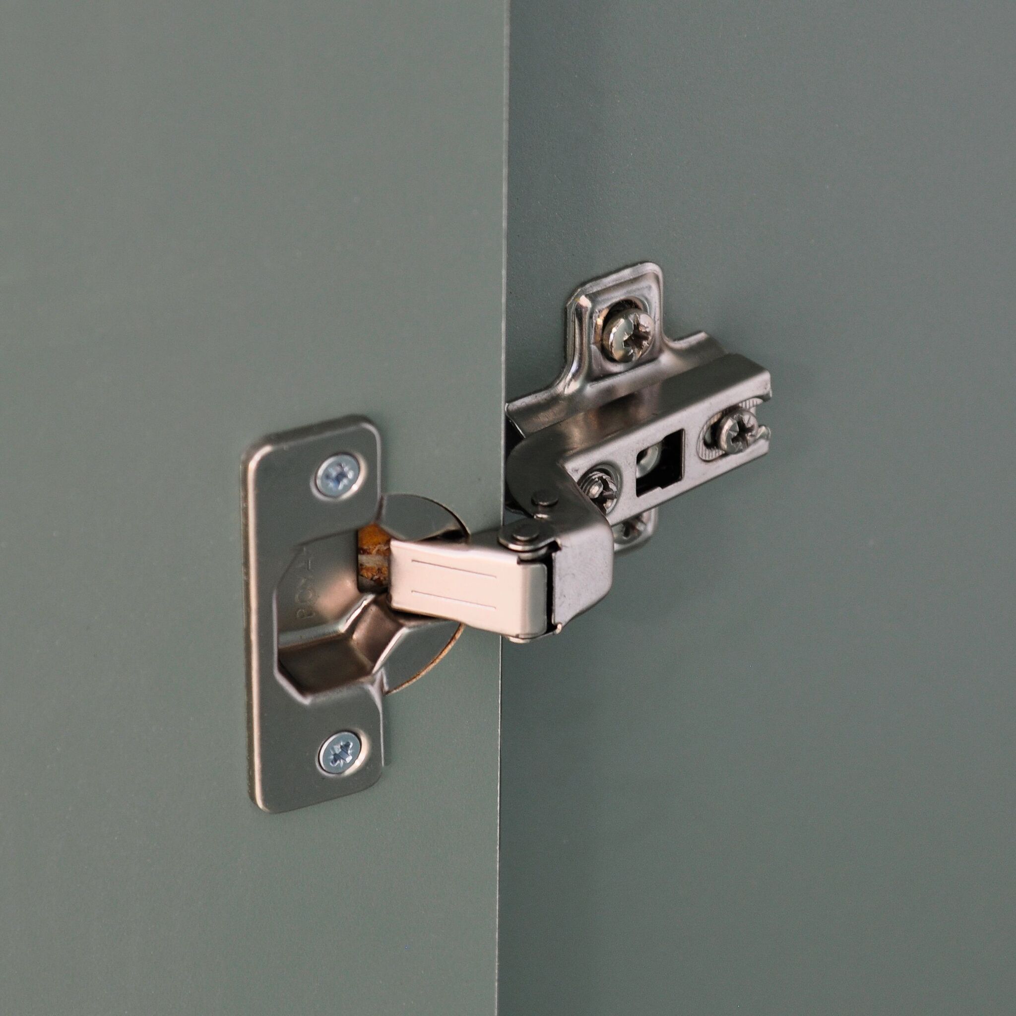 Цвет - зеленый самшит, напоминает эвкалиптовый зеленый, что подойдет для комнат в приглушенных тонах. Шкаф выполнен на высокоточном оборудовании, все кромки изделия обработаны аккуратно, промышленным методом на современных станках, что обеспечивает ее плотное прилегание и прочность древесного слоя. Для задней стенки использовалось ДВП белого цвета.