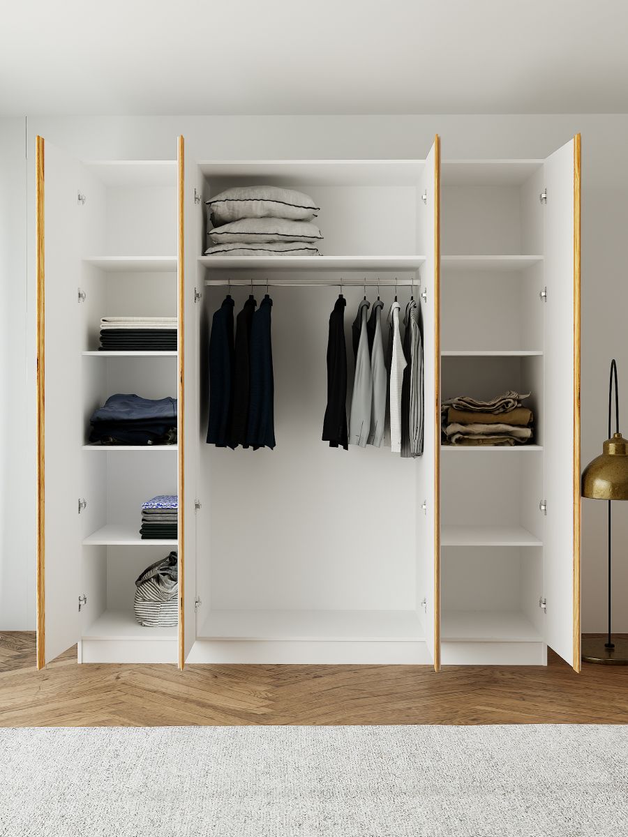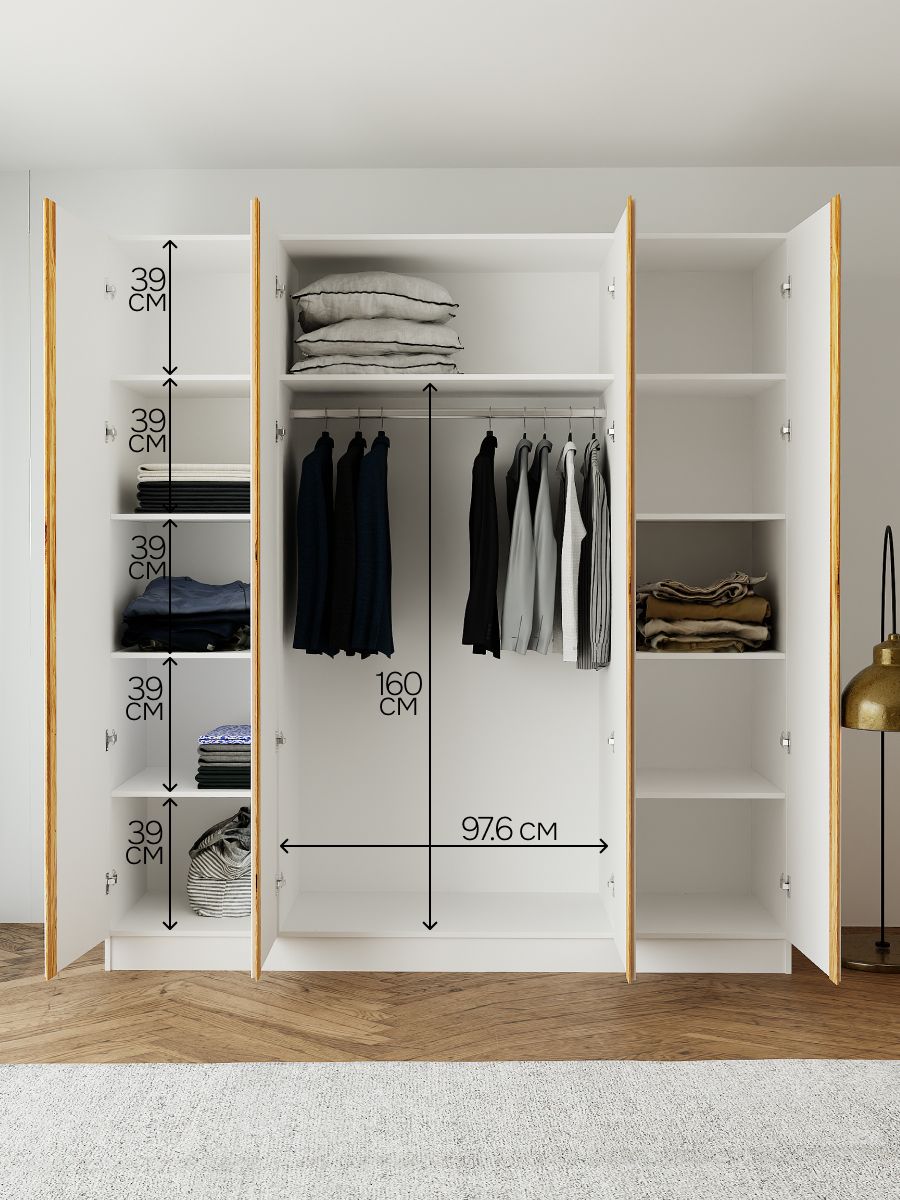 Благодаря габаритам 215×160×45 см шкаф вмещает всё необходимое, при этом оставаясь достаточно компактным для размещения в спальне, гардеробной или прихожей. Внутреннее пространство удобно организовано: отделения с полками и штангой позволяют хранить как сложенные, так и висящие вещи.