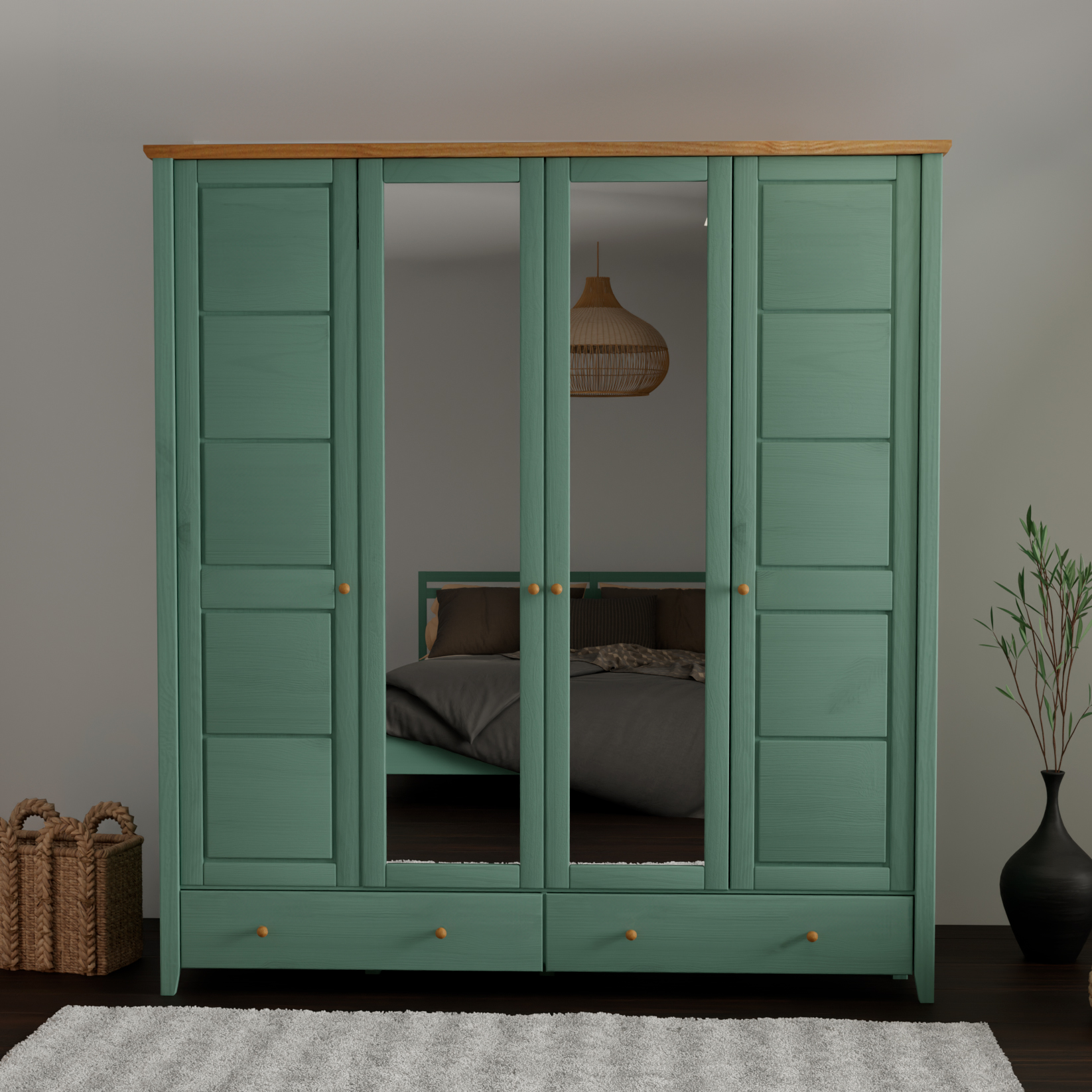 - Конструкция: Просторный 4-х дверный шкаф. Внутри — удобная штанга для плечиков и регулируемые полки для максимальной организации пространства.