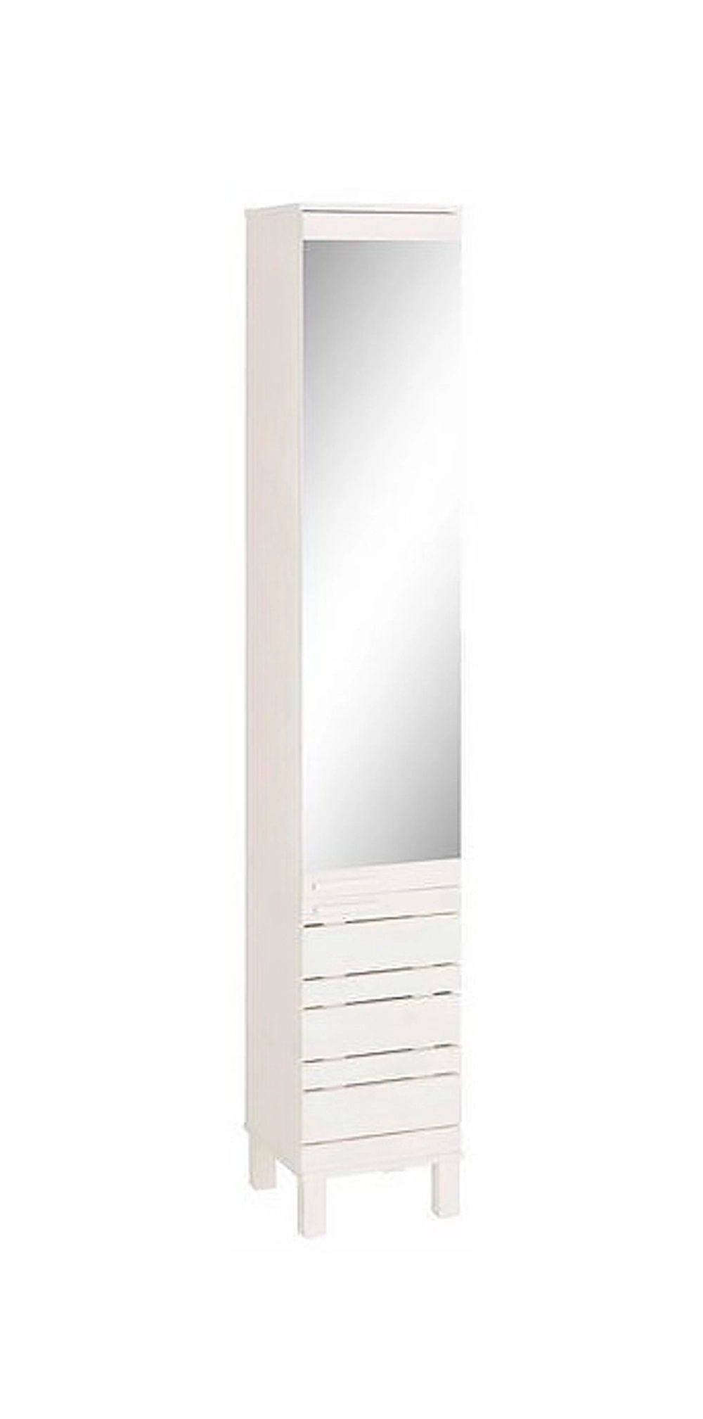 На фасаде шкафа расположена зеркальная панель средней высоты, удобно размещённая для использования при ежедневных гигиенических процедурах. Под зеркалом находятся выдвижные ящики и дверцы, за которыми скрываются вместительные отделения для хранения полотенец, бытовой химии и других предметов повседневного использования.