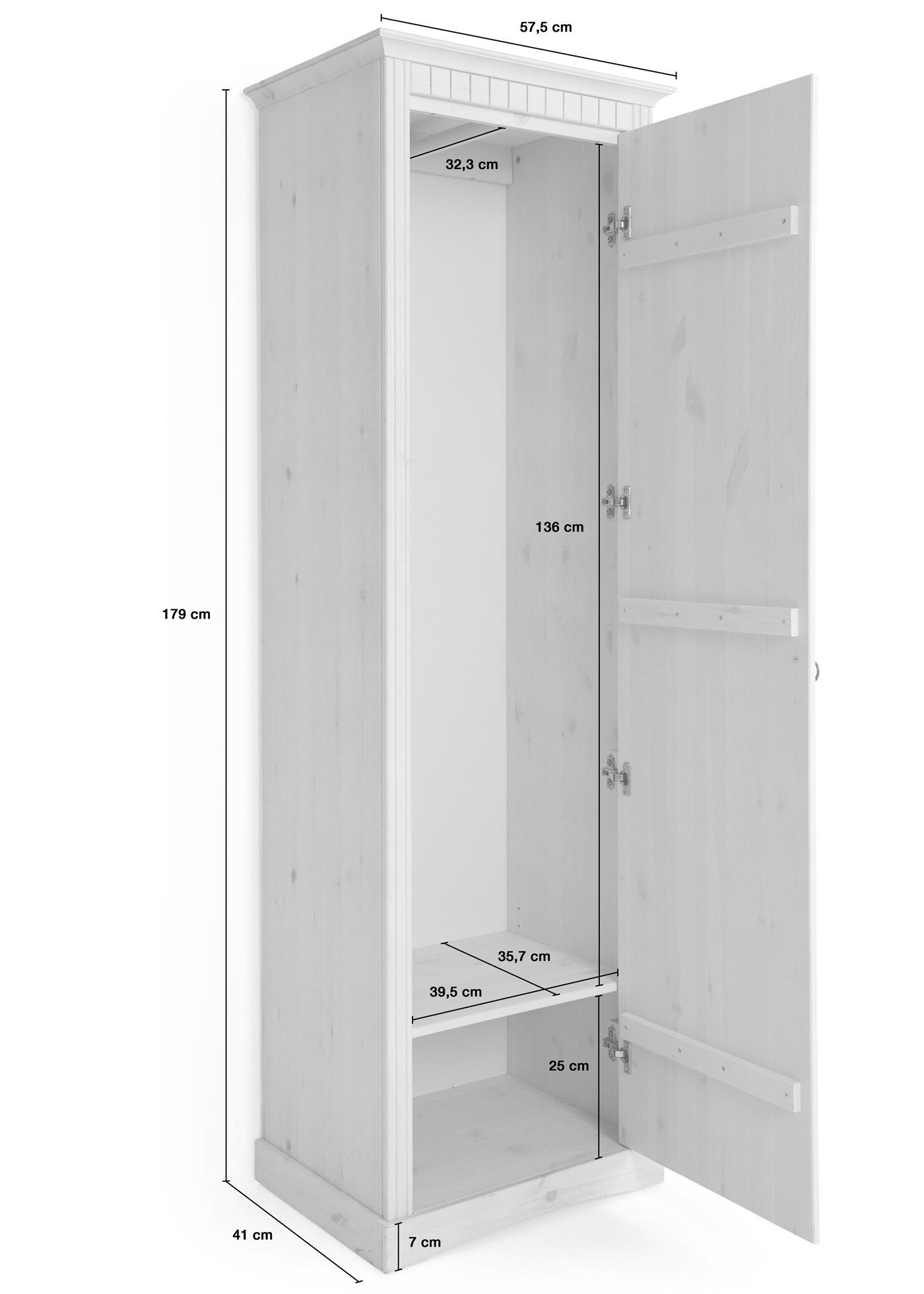 Особенностью является наличие деревянной штанги для одежды и удобной полки внизу шкафа. Размеры шкафа 58х41х179 см делают его компактным, а распашная дверь обеспечивает удобный доступ к содержимому.