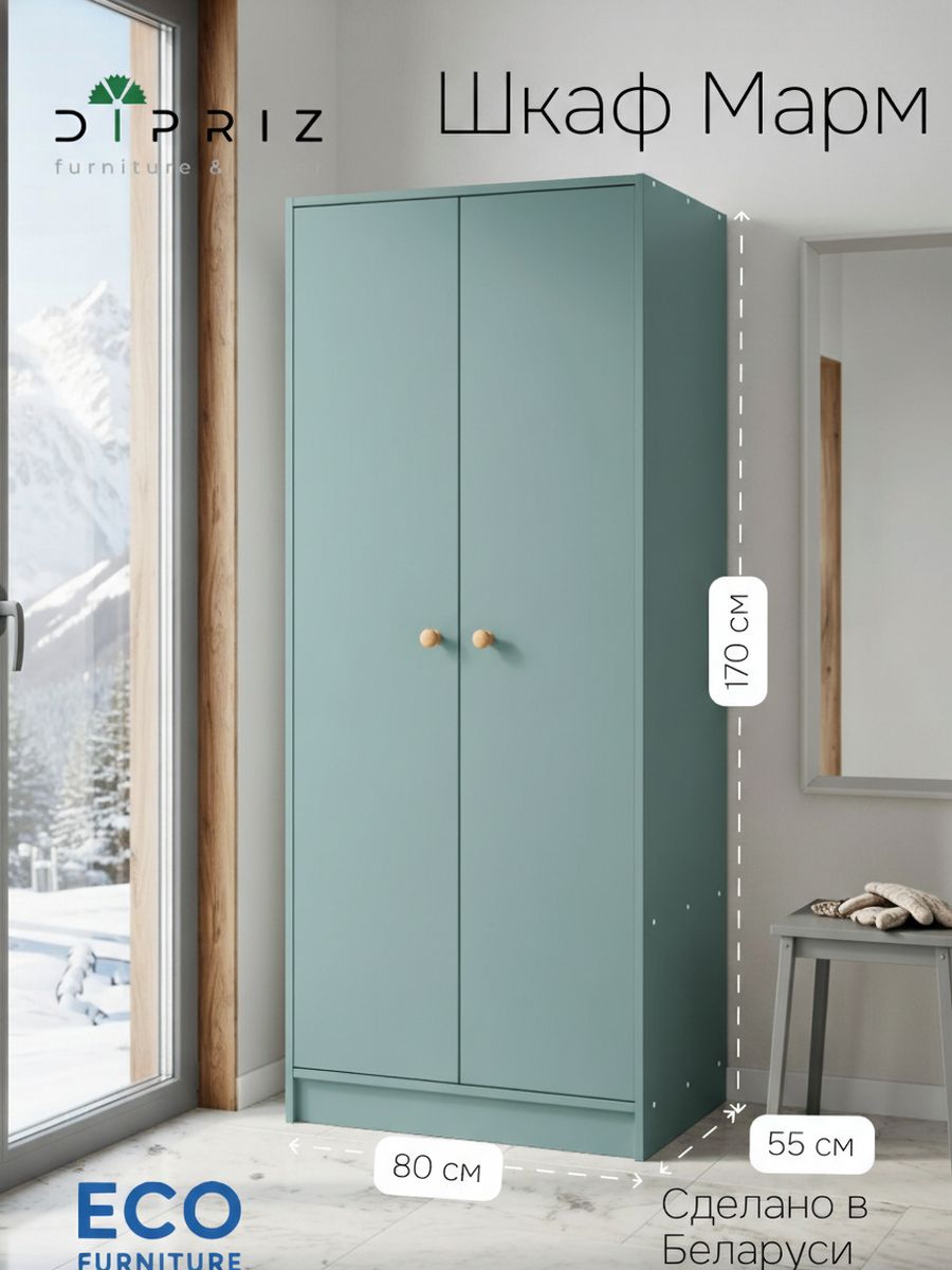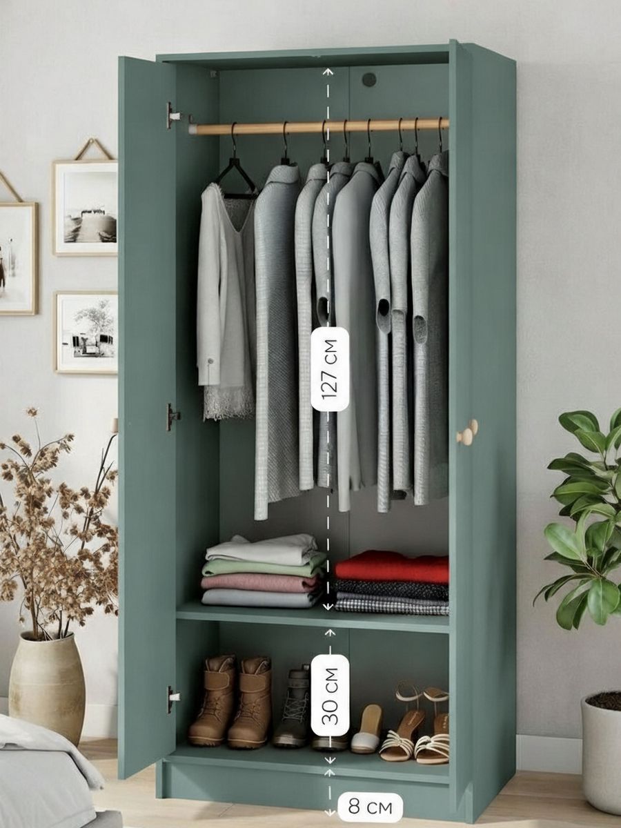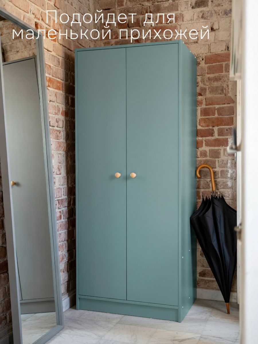 Его нежный зеленый оттенок из высококачественного ЛДСП (толщиной 16 мм, по европейским нормам безопасности — формальдегид не больше 10 мг на 100 г) делает комнату визуально больше и светлее. Задняя стенка из ДВП (3,2 мм) добавляет прочности, а все кромки аккуратно обработаны на станках — шкаф не боится влаги, не деформируется и долго выглядит как новый. Размеры 80×55×170 см идеальны для прихожей, спальни, гостиной, ванной или детской комнаты — компактно, но вместительно.