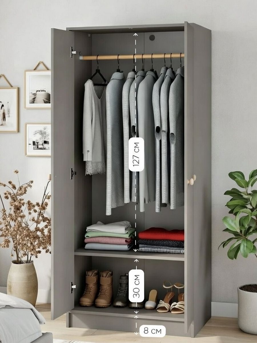 Его нежный серый оттенок из высококачественного ЛДСП (толщиной 16 мм, по европейским нормам безопасности — формальдегид не больше 10 мг на 100 г) делает комнату визуально больше и светлее. Задняя стенка из белого ДВП (3,2 мм) добавляет прочности, а все кромки аккуратно обработаны на станках — шкаф не боится влаги, не деформируется и долго выглядит как новый. Размеры 80×55×170 см идеальны для прихожей, спальни, гостиной, ванной или детской комнаты — компактно, но вместительно.