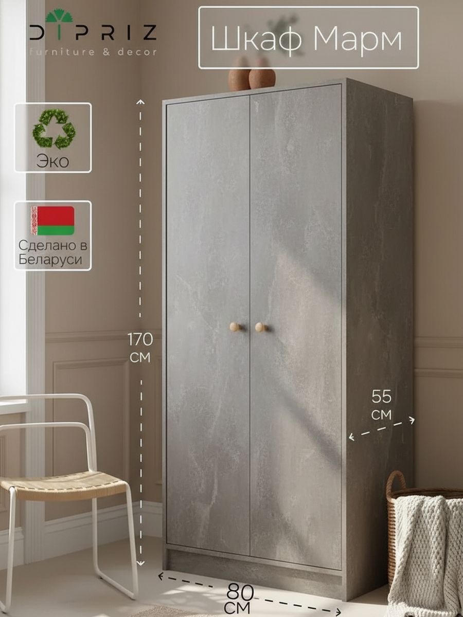 Шкаф для одежды Марм - отличное дополнение скандинавского интерьера. Двухдверный распашной шкаф со штангой и вместительной полкой создаст порядок в любой комнате, будь то прихожая, спальня, гостиная, ванная или детская комната.