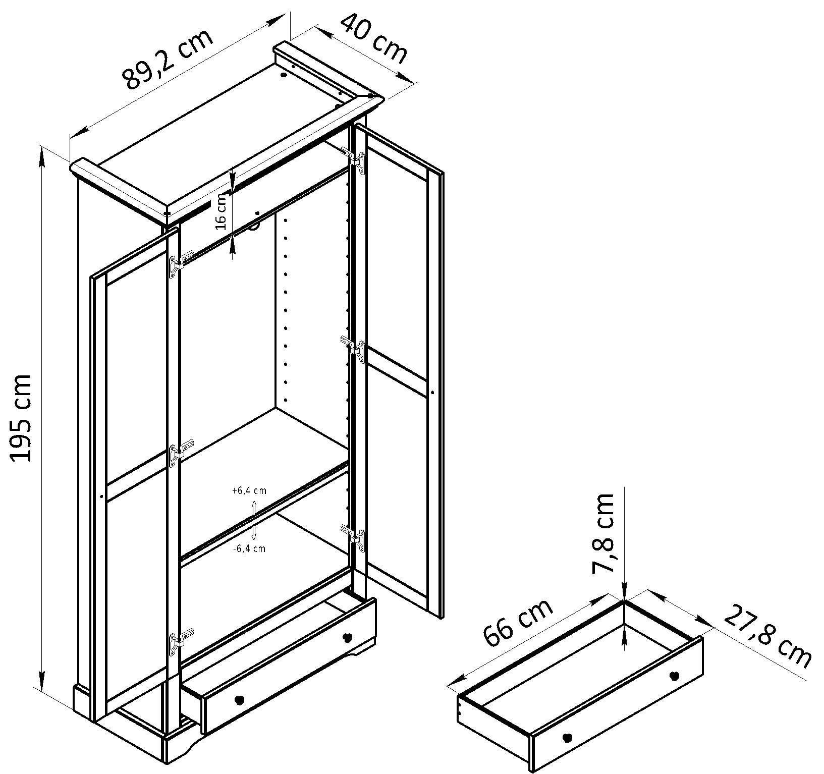 Функциональность: шкаф оснащен двумя распашными дверями, одним ящиком и двумя полками (одна стационарная и одна съемная), которые можно регулировать по высоте с шагом 64 мм. Максимальная нагрузка на ящик составляет 5 кг.