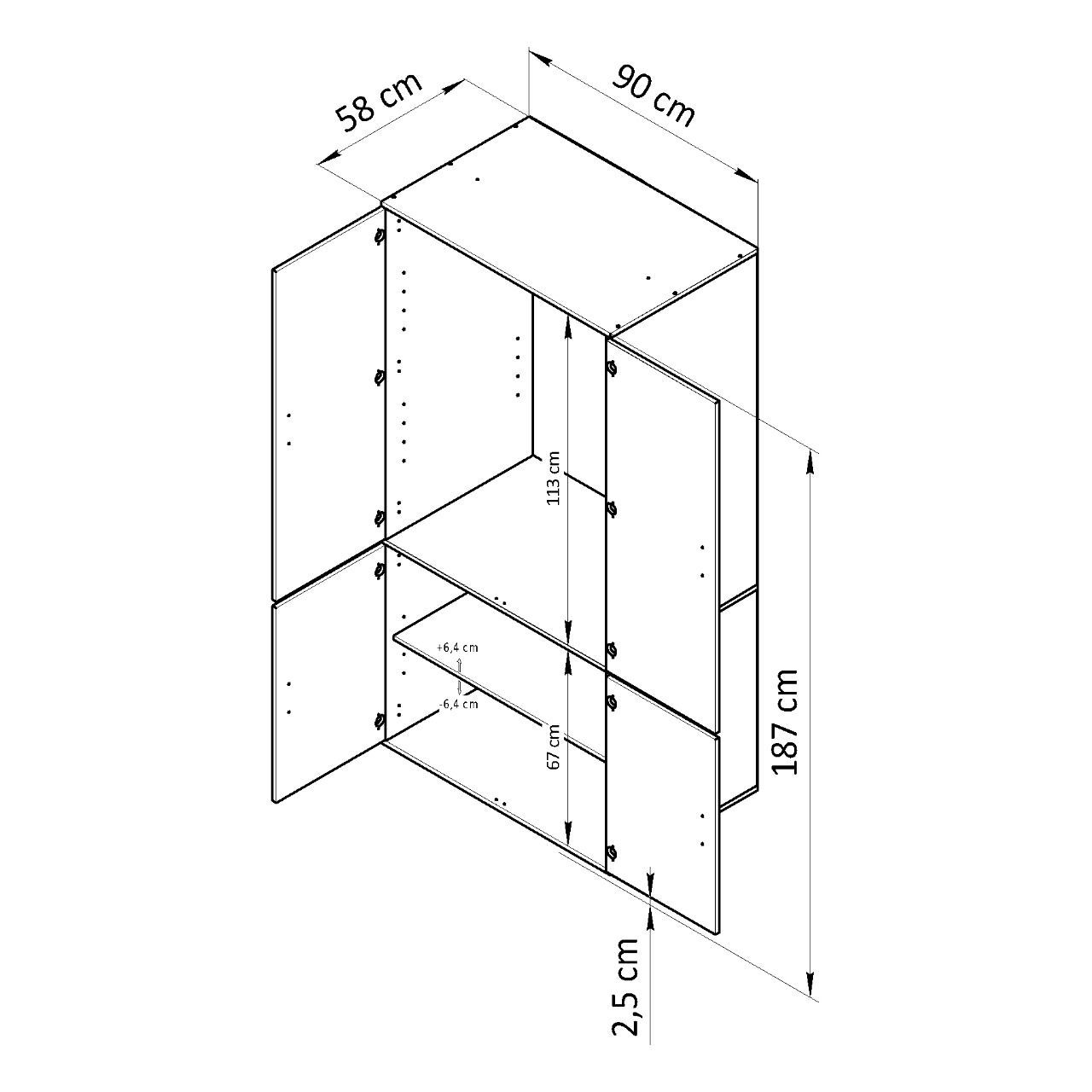 - Дополнительные возможности: предусмотрена установка дополнительных полок внутри и антресоли сверху шкафа (90 см), которые приобретаются отдельно; универсальная дверь — подходит для левого или правого открывания.