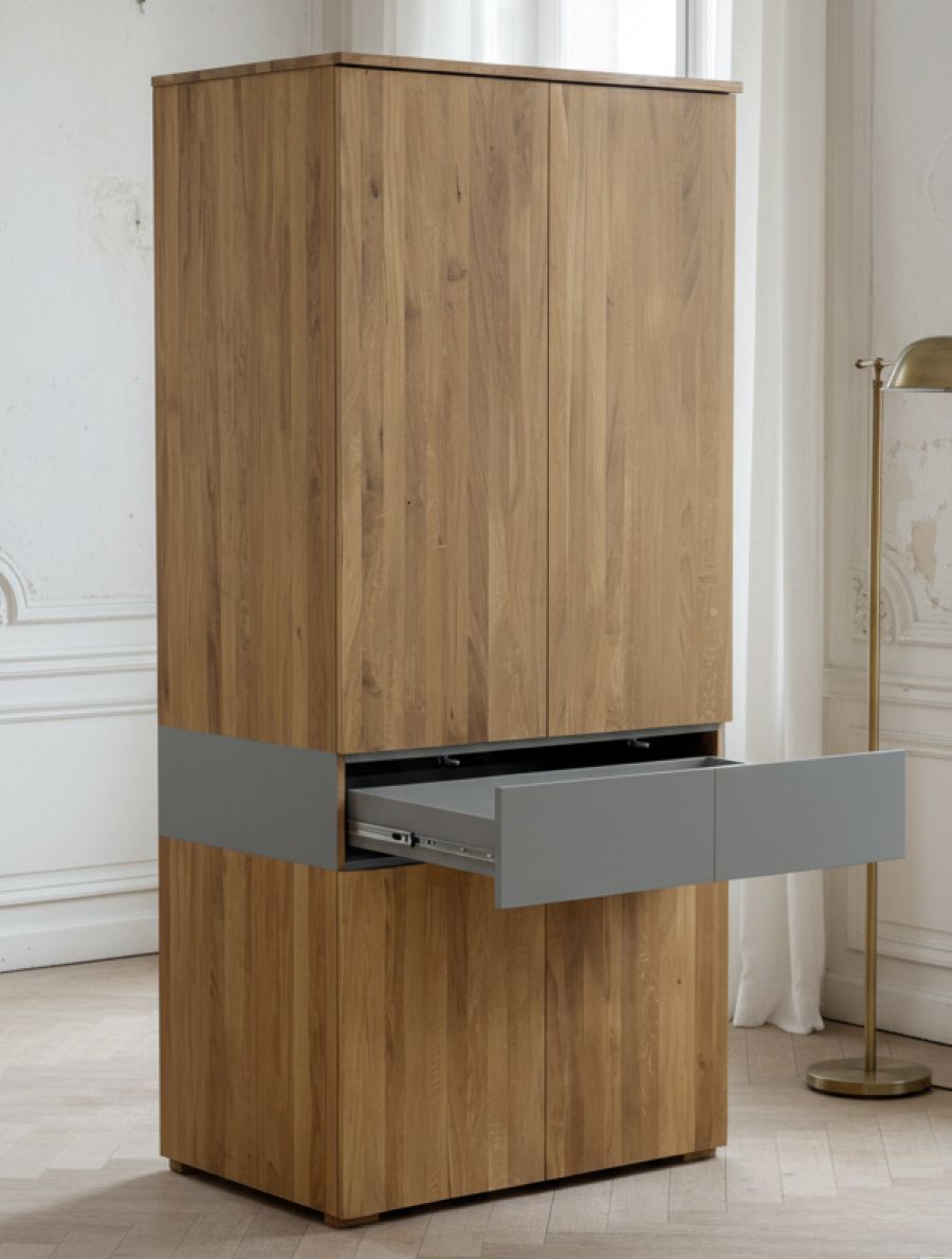 Когда мебель становится произведением искусства, а каждое прикосновение дарит удовольствие — это шкаф «Кристиан». Созданный из благородного массива дуба с элегантными серыми вставками, он воплощает философию современной жизни: натуральность, технологичность и безупречный вкус в каждой детали.