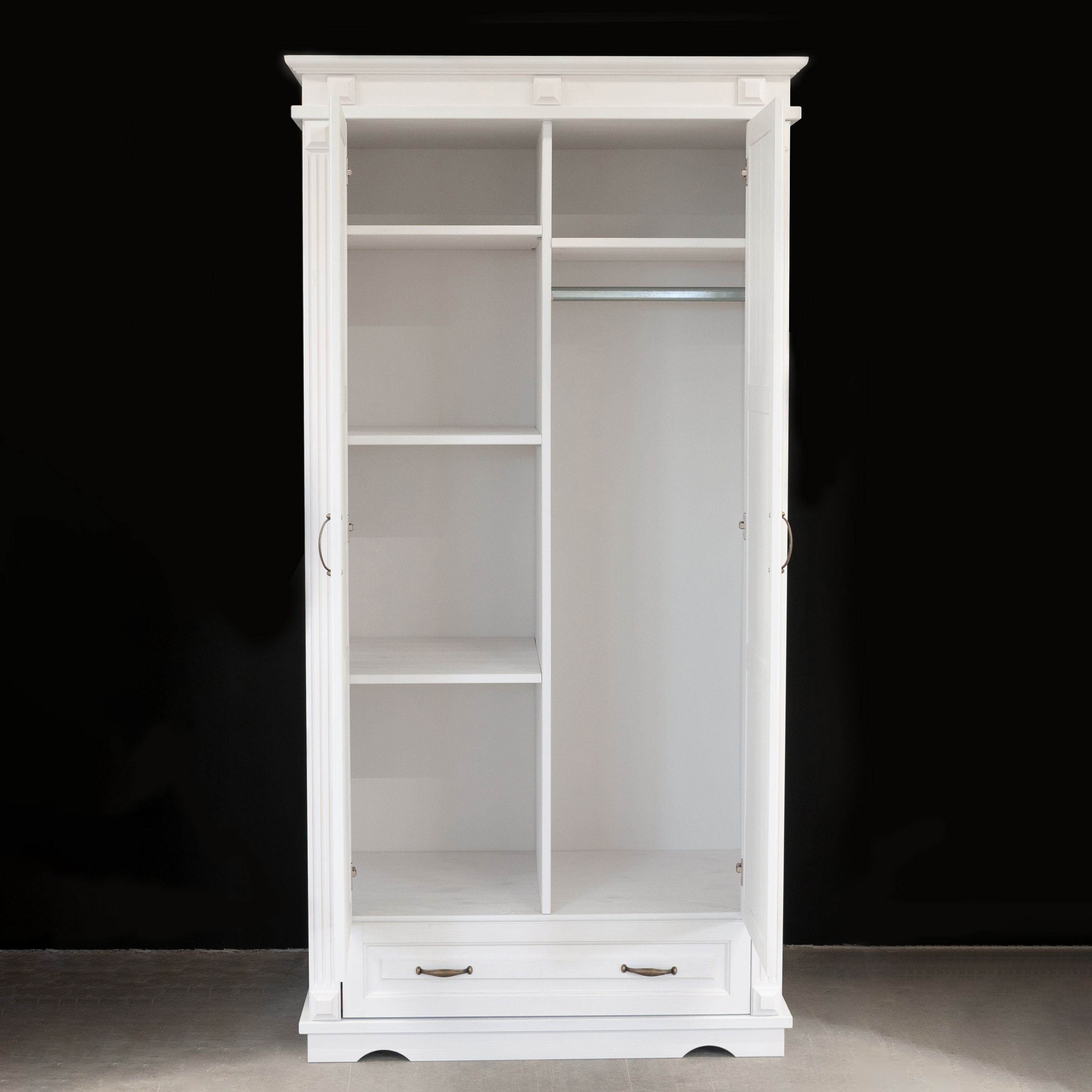 Шкаф для одежды распашной белый Харви двухдверный из массива сосны с ящиком, со штангой и полками для создания элегантности и шарма в любом помещении.