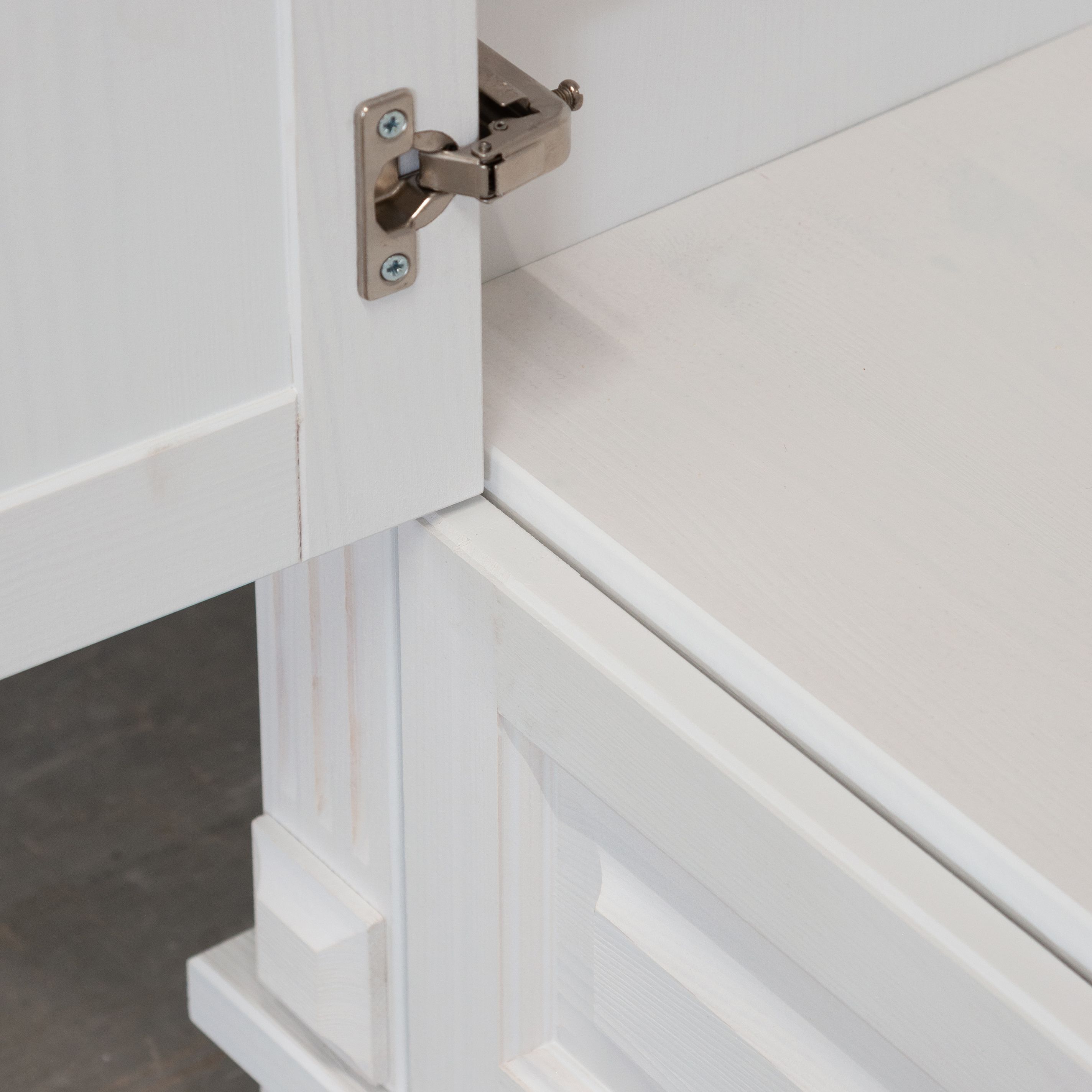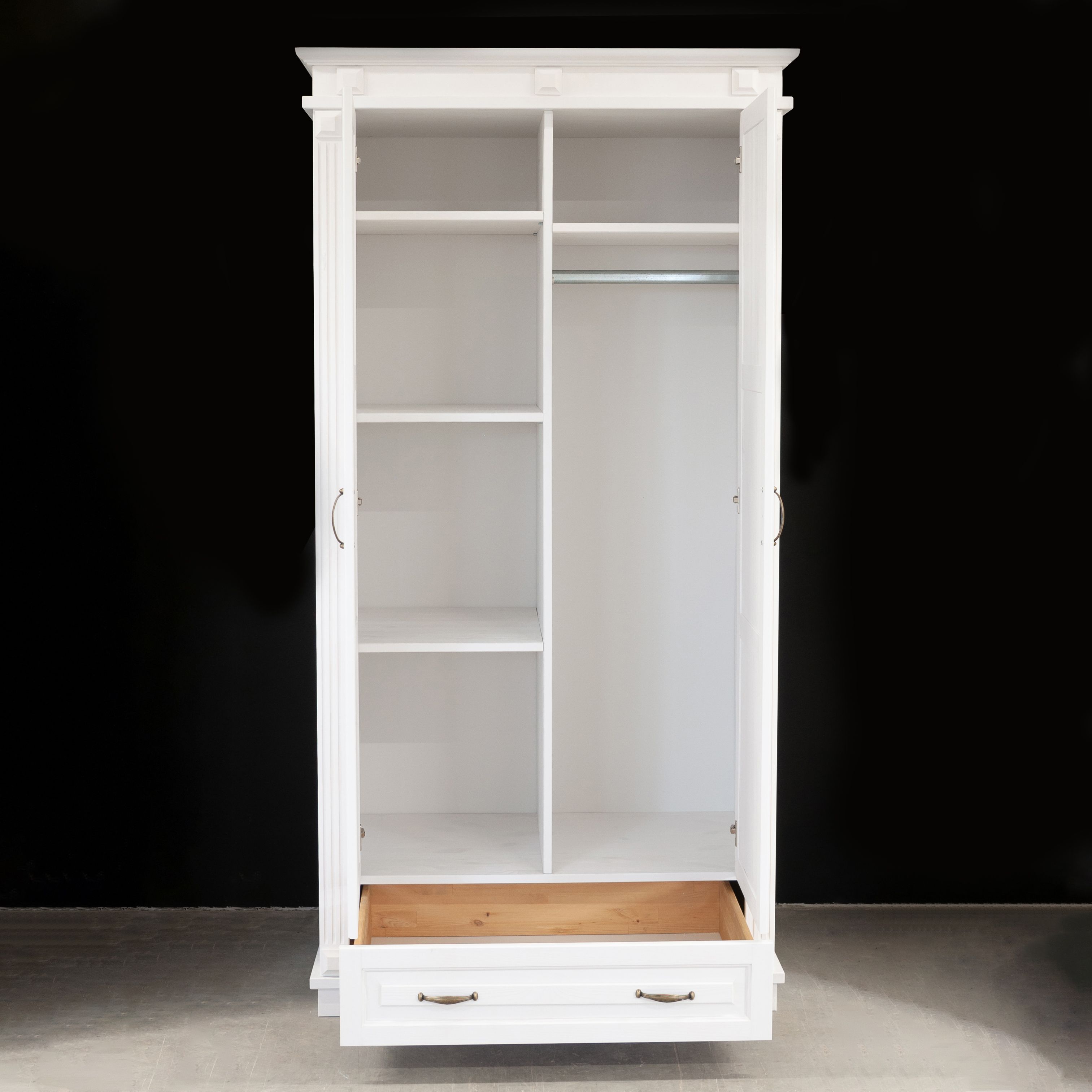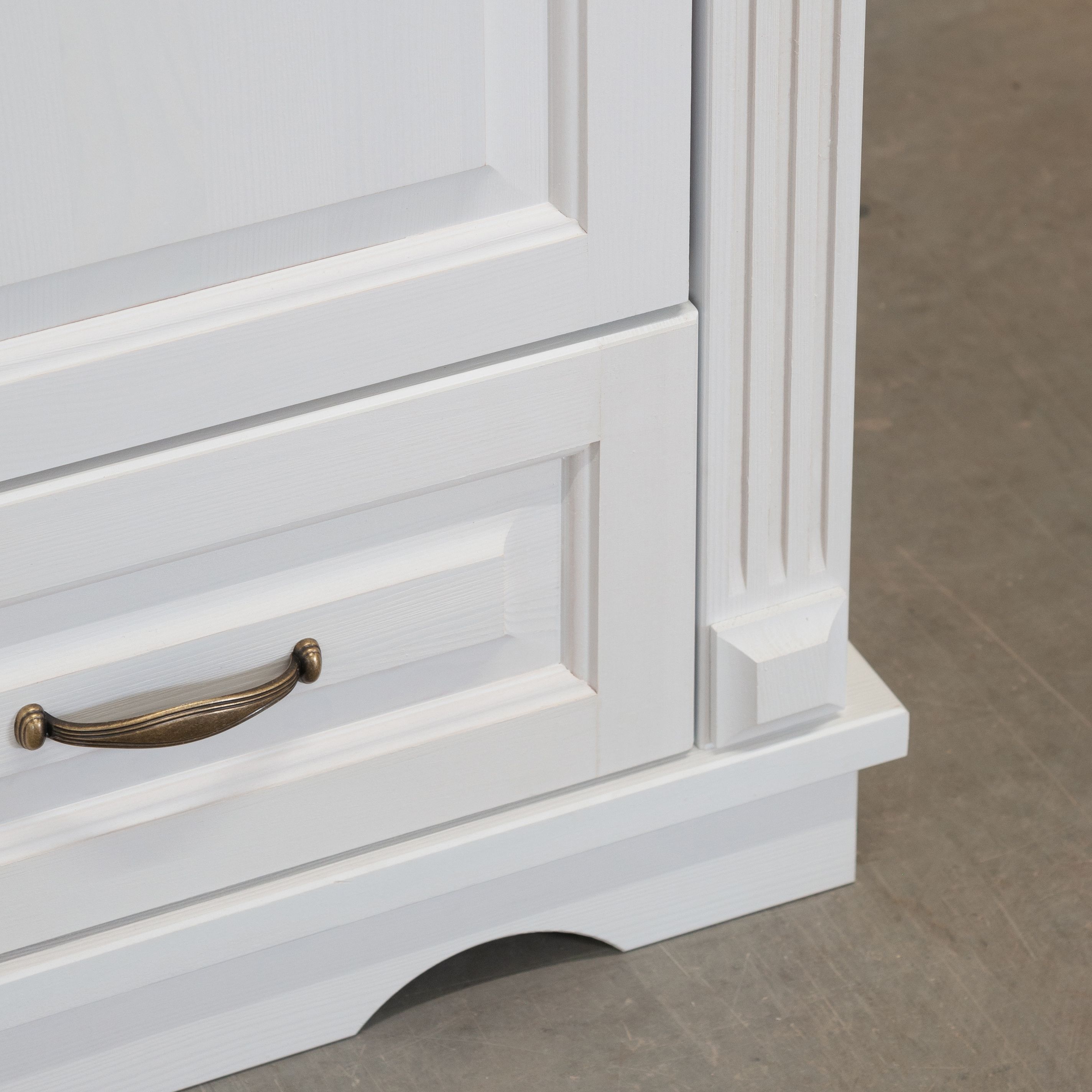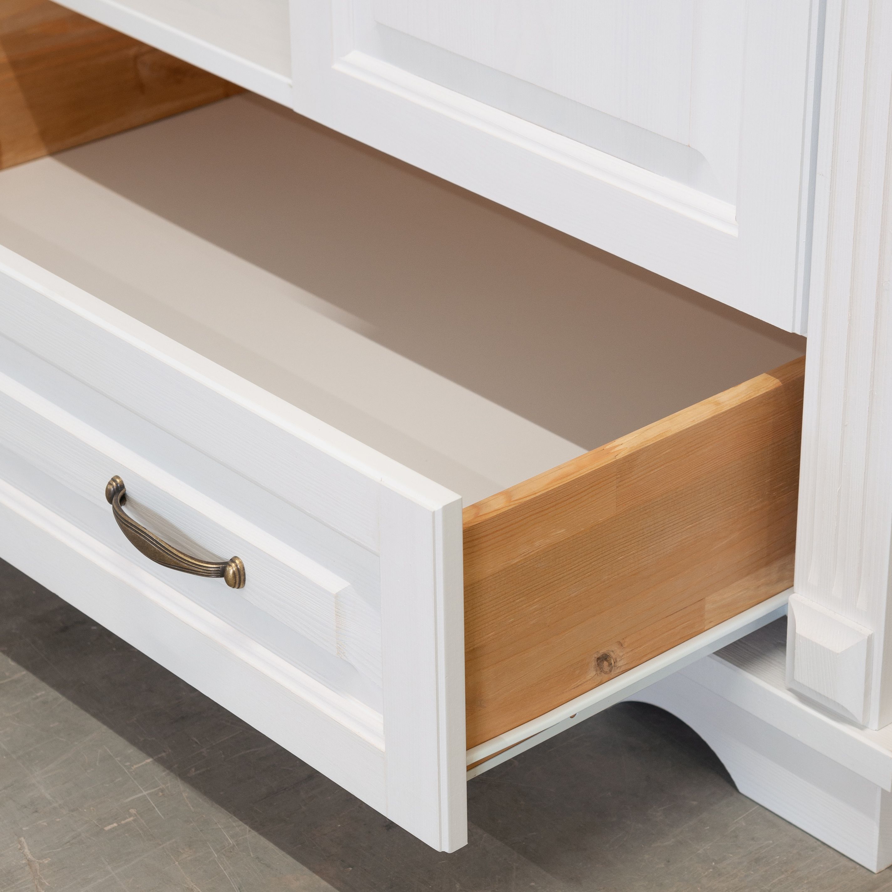 Мы использовали массив сосны для создания корпуса и фасадов шкафа, обеспечивая надежность и стойкость к внешним воздействиям. Задняя стенка и дно ящика выполнена из белого ДВП.