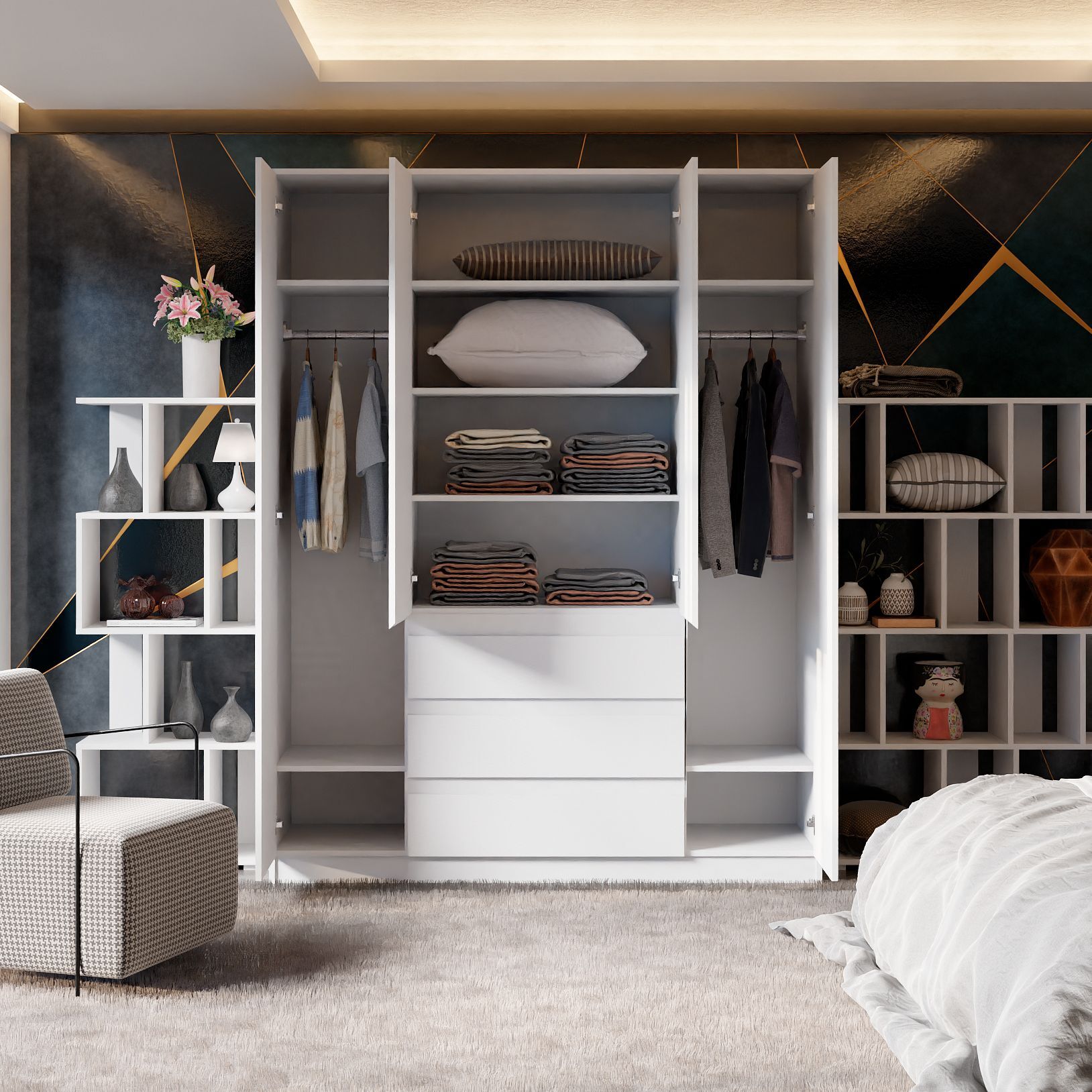 Шкаф для одежды Марм от белорусского производителя Dipriz - отличное дополнение скандинавского интерьера. Четырехдверный распашной шкаф с 3 ящиками создаст порядок в любой комнате, будь то прихожая, спальня, гостиная, ванная или детская комната.