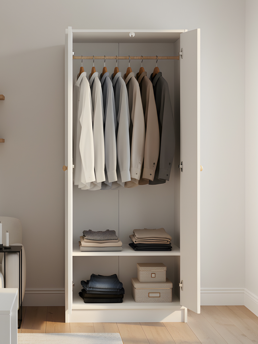 Шкаф для одежды Мальм - отличное дополнение скандинавского интерьера. Двухдверный распашной шкаф со штангой и вместительной полкой создаст порядок в любой комнате, будь то прихожая, спальня, гостиная, ванная или детская комната. Конструкция шкафа включает в себя деревянную штангу для одежды на всю ширину шкафа (с возможностью регулировки по высоте), вместительную нишу внизу, 2 распашные двери с доводчиком от BOYARD, ручками из массива сосны и стопорами дверей. Внутреннее пространство белого шкафа можно использовать для хранения вещей одного типа или тематически по назначению. Например, верхнюю секцию шкафа использовать под верхнюю одежду, футболки и майки, нижнюю полку - под носки, перчатки и шарфы, пижамы и домашнюю одежду. Особенностью шкафа является наличие деревянной штанги для одежды с регулировкой по высоте в 5 положениях. Благодаря этому вы сами сможете изменять внутреннее наполнение шкафа, оставляя места для одежды на штанге или для организация пространства под ней. Шкаф распашной для одежды изготовлен белорусским производителем "Диприз" из высококачественного ЛДСП. При изготовлении шкафа использовалось только безопасное для человека ЛДСП толщиной 16 мм в соответствии с европейскими нормами классов содержания формальдегида (не более 10 мг на 100 г). Имеет нежный белый цвет, поэтому мебель всегда будет придавать комнате приятный и светлый внешний вид. Для задней стенки использовалось ДВП белого цвета толщиной 3,2 мм. Шкаф выполнен на высокоточном оборудовании, все кромки изделия обработаны аккуратно, промышленным методом на современных станках, что обеспечивает ее плотное прилегание и прочность древесного слоя при контакте с влагой, устойчивость к влажности и деформации. Размеры шкафа в собранном виде (Высота х Ширина х Глубина, см): 170х74х55 см, что позволит удобно хранить как домашнюю одежду и текстиль, так и верхнюю одежду с обувью, не беспокоясь о порядке. Изделие включает 2 распашные двери с ручками из массива сосны (диаметр 34 мм), которые закреплены на петлях Boyard с доводчиком и стопором, что обеспечивает плавное и безопасное использование дверей. Штанга с регулировкой высоты в 5 положениях позволят использовать внутренне пространство шкафа по Вашему желанию, а максимальная допустимая нагрузка на полку составляет до 10 кг. Допустимо крепление шкафа к стене при помощи уголка для большей устойчивости (поставляется в комплекте). Расположив мебель в прихожей, вы сможете организовать хранение обуви, аксессуаров и других необходимых предметов, сохраняя порядок и чистоту в вашем входном пространстве. Шкаф можно использовать с письменным столом и комодом этой же серии для создания современного офиса. Если вы обустраиваете детскую комнату, наше изделие станет прекрасным дополнением к интерьеру, чтобы получился замечательный детский шкаф для вещей и игрушек. Поставьте его в спальню, и получится отличный шкаф пенал для вещей. Отлично дополнит стили интерьера: скандинавский, минимализм, современный, модерн, эко-стиль. Сборка распашного шкафа в домашних условиях не вызовет трудностей за счет понятной инструкции по сборке. Изделие поставляется в разобранном виде вместе со штангой, полным комплектом необходимой фурнитуры. Наша компания обеспечивает надежную упаковку товара с дополнительной защитой для предотвращения повр
