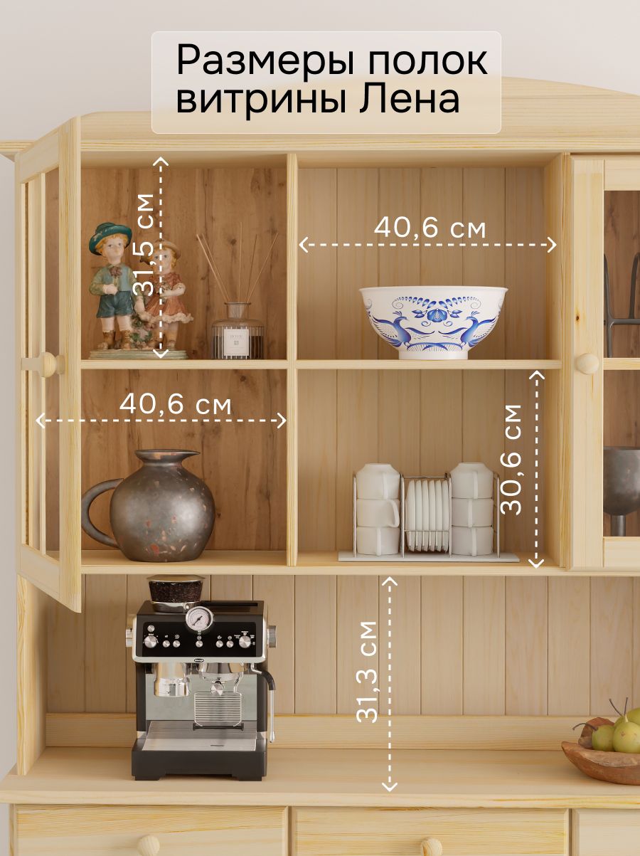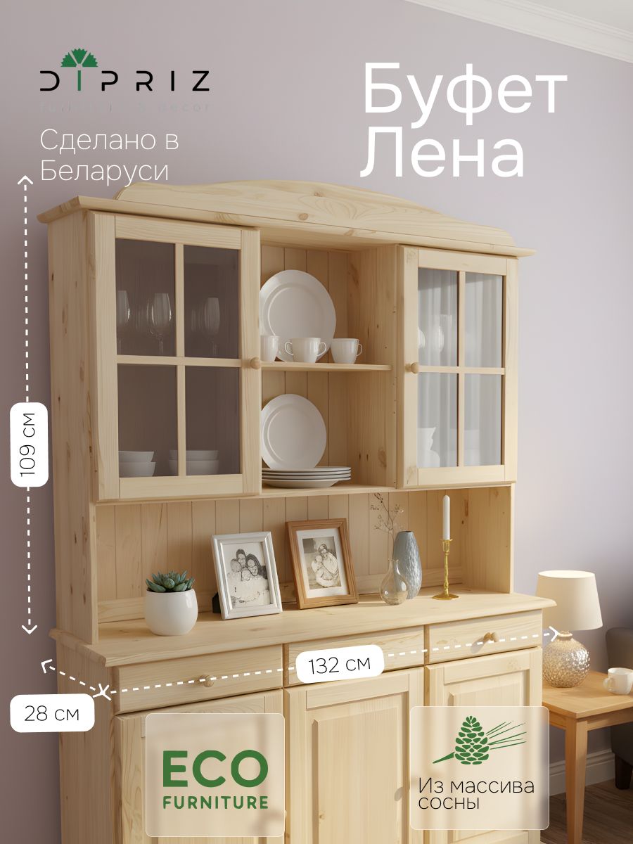 Шкаф Лена (арт.1020730763) в комбинации с тумбой Лена (арт.1020695711) представляет собой модульный буфет, который прекрасно подойдет как для кухни, так и для столовой. Шкаф Лена выполнена из сосны от белорусского производителя "Диприз". Серия Лена представлена в 4-ех разных отделках - без отделки, лакированная, в белом воске и в сером воске с лакированной крышкой. Разнообразие расцветок позволит Вам выбрать буфет наиболее подходящий для Вашей цветовой гаммы. Шкаф органично впишется в интерьер любой кухни, станет незаменимым элементом мебели кухни, станет незаменимым элементом мебели для хранения посуды и других кухонных принадлежностей. В серии представлены напольные и настройки различной отделки и функционала, из которых можно спроектировать любой модульный гарнитур. Шкаф изготовлена корпус и фасады: сосна, заполнение фасадов: стекло.