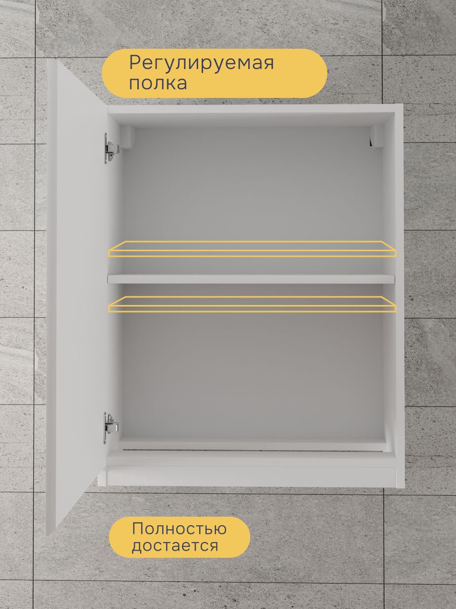 Дверь оснащена петлями с доводчиком от производителя Boyard, что обеспечивает легкость и плавность закрывания. Скрытая ручка с гладкими скосами позволит использовать кухонный модуль с удовольствием, предоставляя легкость доступа и уборки. Задняя стенка выполнена из белого ДВП, полка навесного шкафа выдержит нагрузку до 5-10 кг, что позволяет хранить тяжелые кухонные принадлежности без опасений.