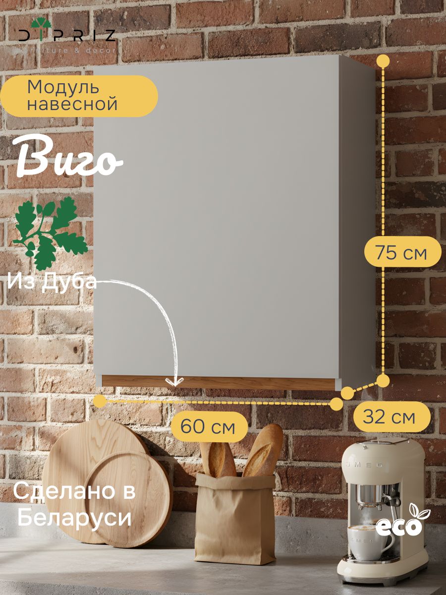 Конструкция кухонного модуля оснащена распашной дверью и вместительной полкой, которая может быть установлена в 3 положениях по высоте. Размеры кухонного шкафа в собранном виде (Ширина х Глубина х Высота, см) - 60х32х75 см, что позволит использовать его как в качестве небольшого подвесного шкафа для кухни, так и для создания полноценного кухонного гарнитура серии Виго.