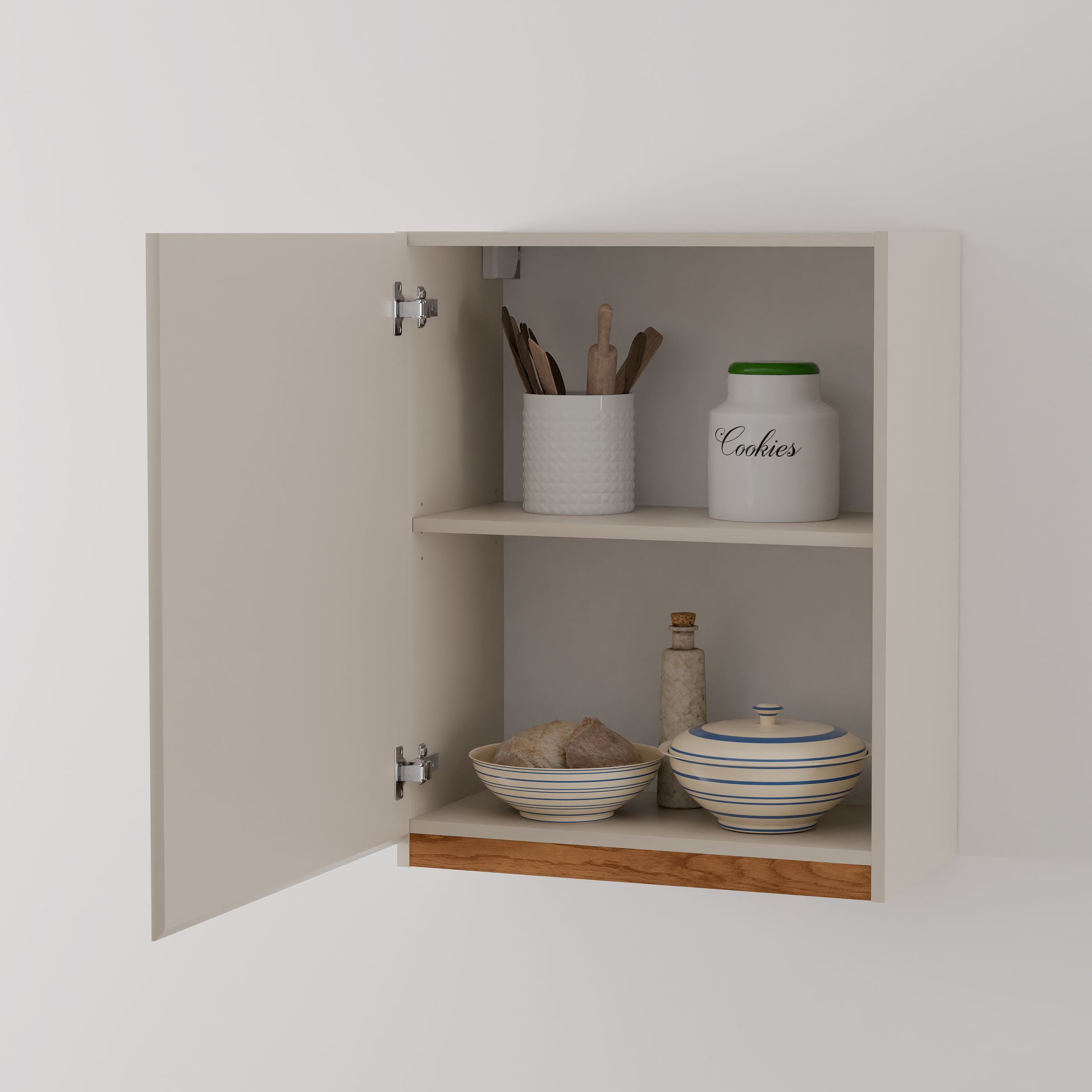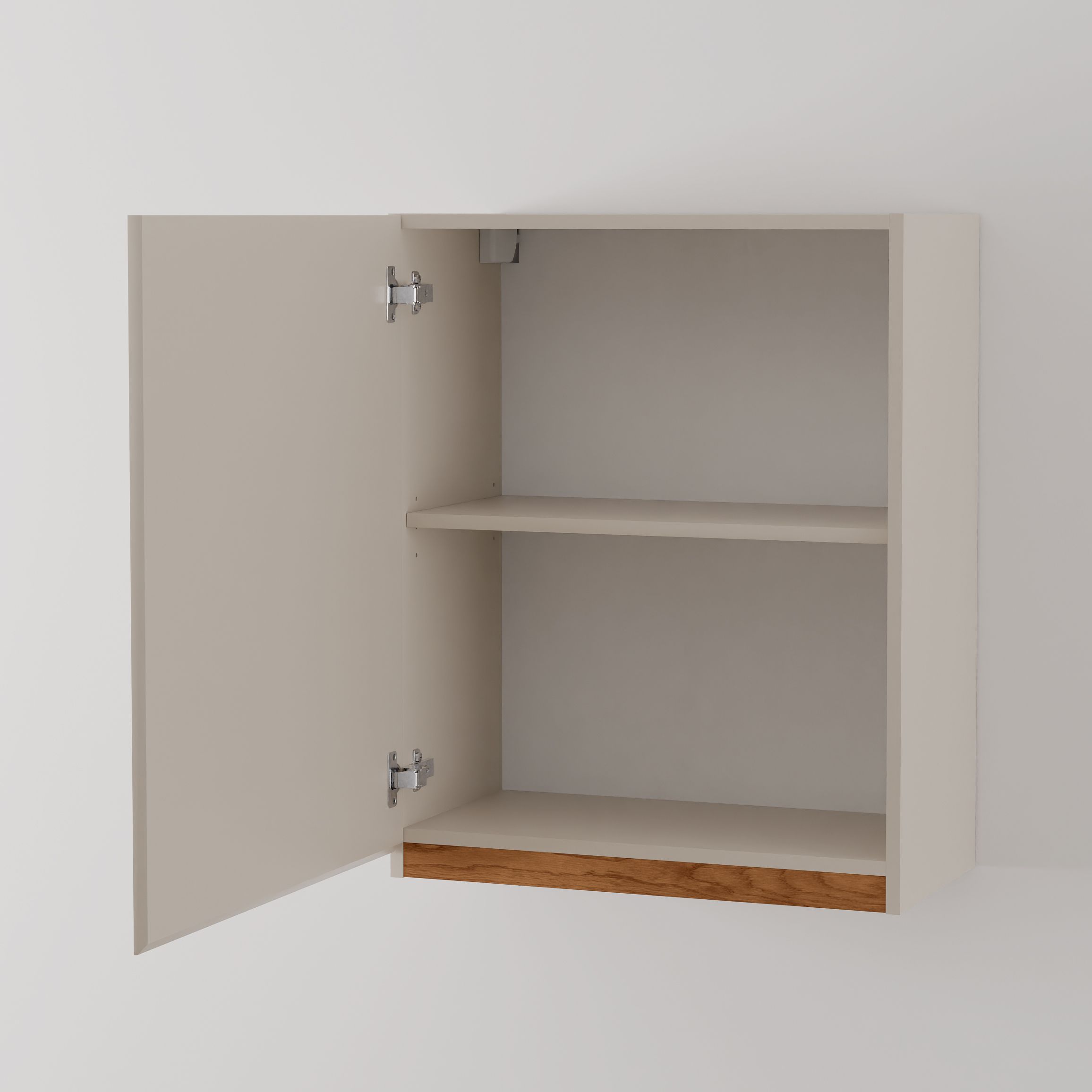 Дверь оснащена петлями с доводчиком от производителя Boyard, что обеспечивает легкость и плавность закрывания. Скрытая ручка с гладкими скосами позволит использовать кухонный модуль с удовольствием, предоставляя легкость доступа и уборки. Задняя стенка выполнена из белого ДВП, полка навесного шкафа выдержит нагрузку до 5-10 кг, что позволяет хранить тяжелые кухонные принадлежности без опасений.