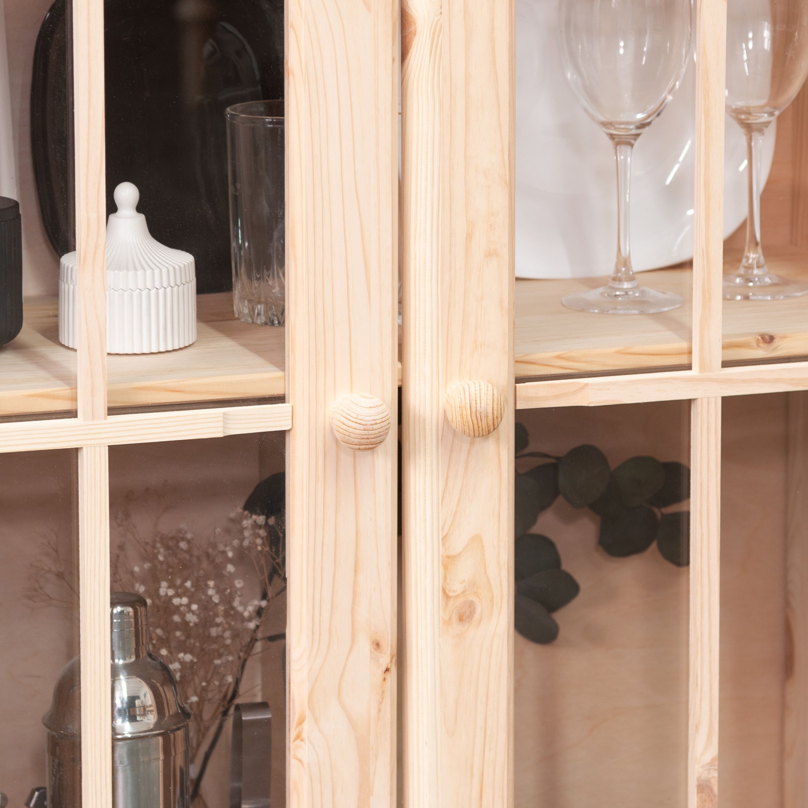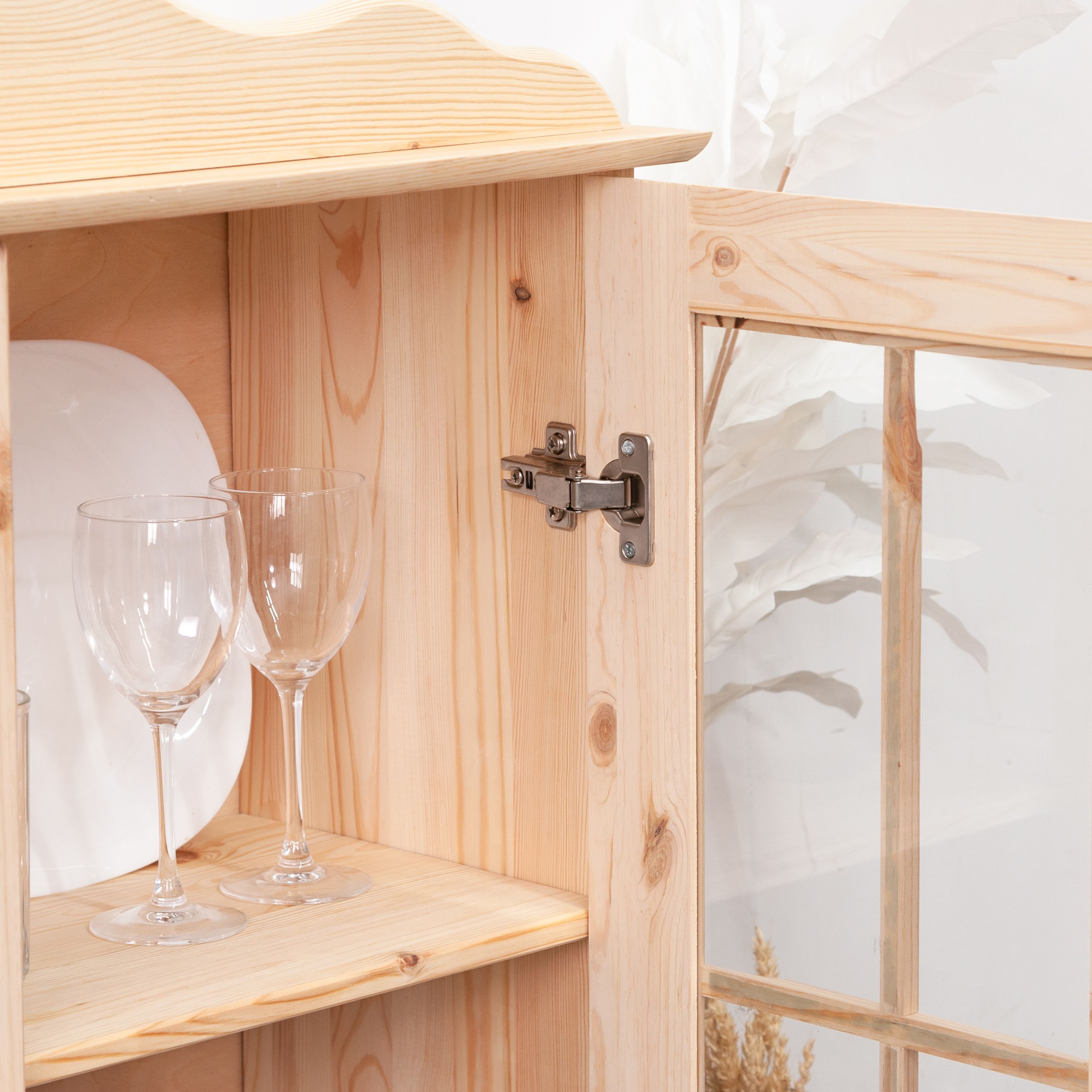 Шкаф из натурального массива сосны в скандинавском стиле с декоративным карнизом и стеклянной дверью создаст атмосферу уюта и элегантности в вашем интерьере.