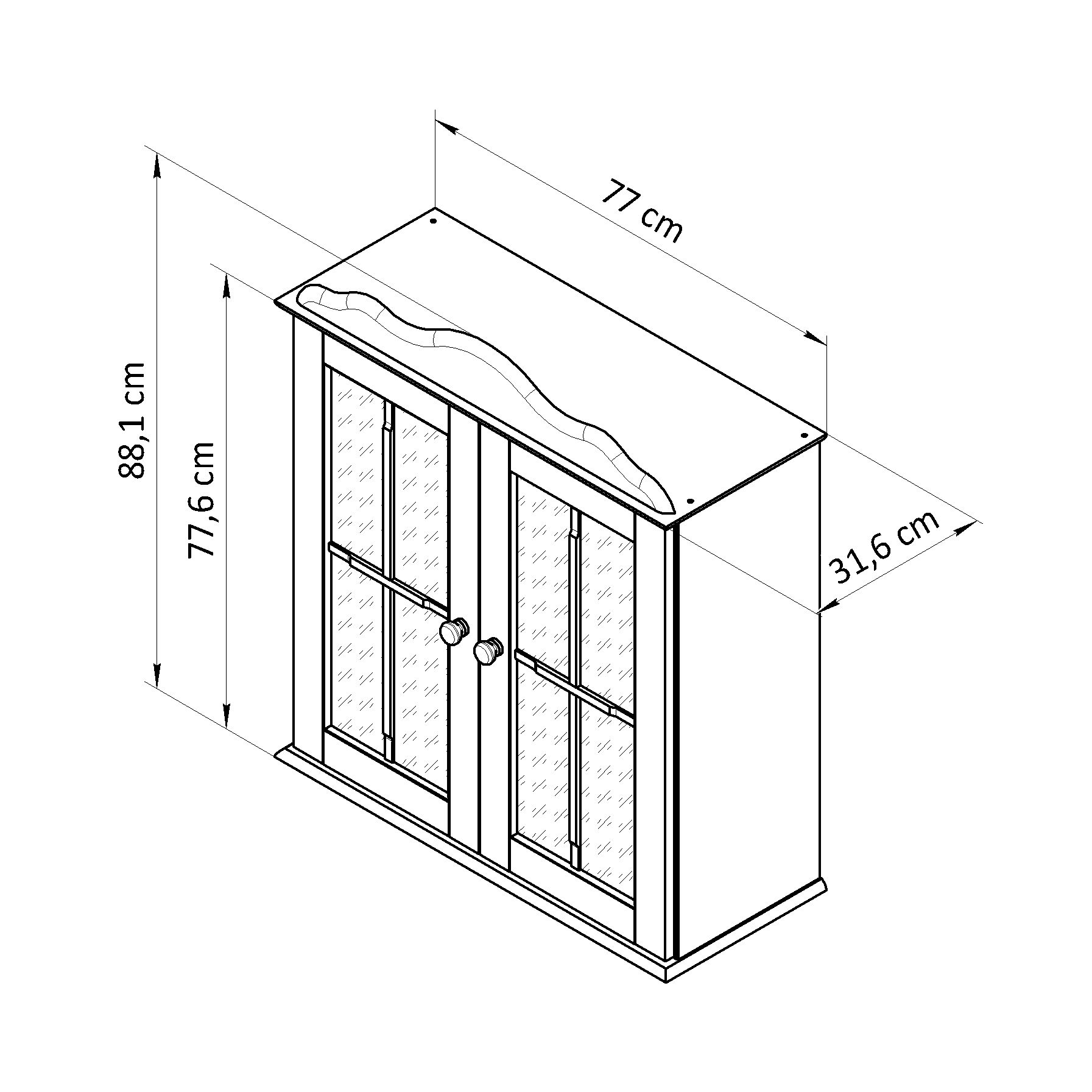 Конструкция шкафа включает в себя 2 двери и 1 съемную полку. Габариты шкафа в собранном виде: Ширина х Глубина х Высота - 77х31.6х88.1 см. Навесной шкаф изготовлен из натурального массива сосны, ручки выполнены из дерева. Внутренние размеры полки (ШхГхВ - 71.5х27х1.4 см), а максимальная допустимая нагрузка на полку составляет до 5 кг, что позволяет разместить в нем любые предметы. Толщина дерева фасада составляет 18 мм; крышки, стенки и полки - 14 мм; толщина стекла в двери - 4 мм; задней стенки - 4 мм. Используются деревянные ручки кнопки 34 мм.