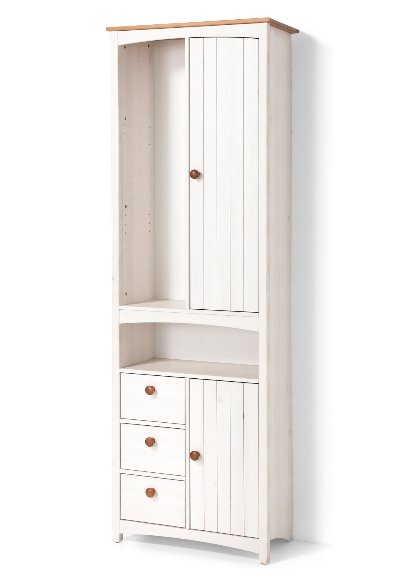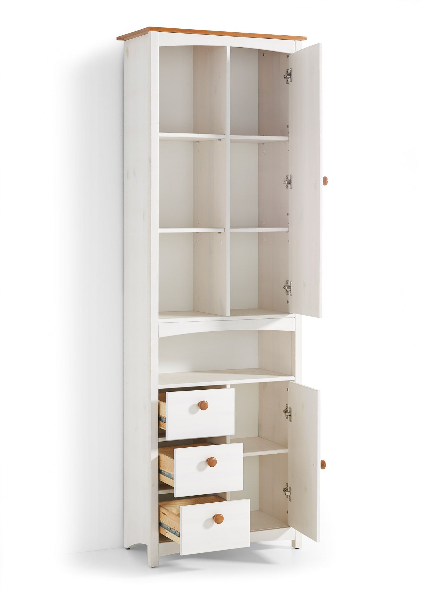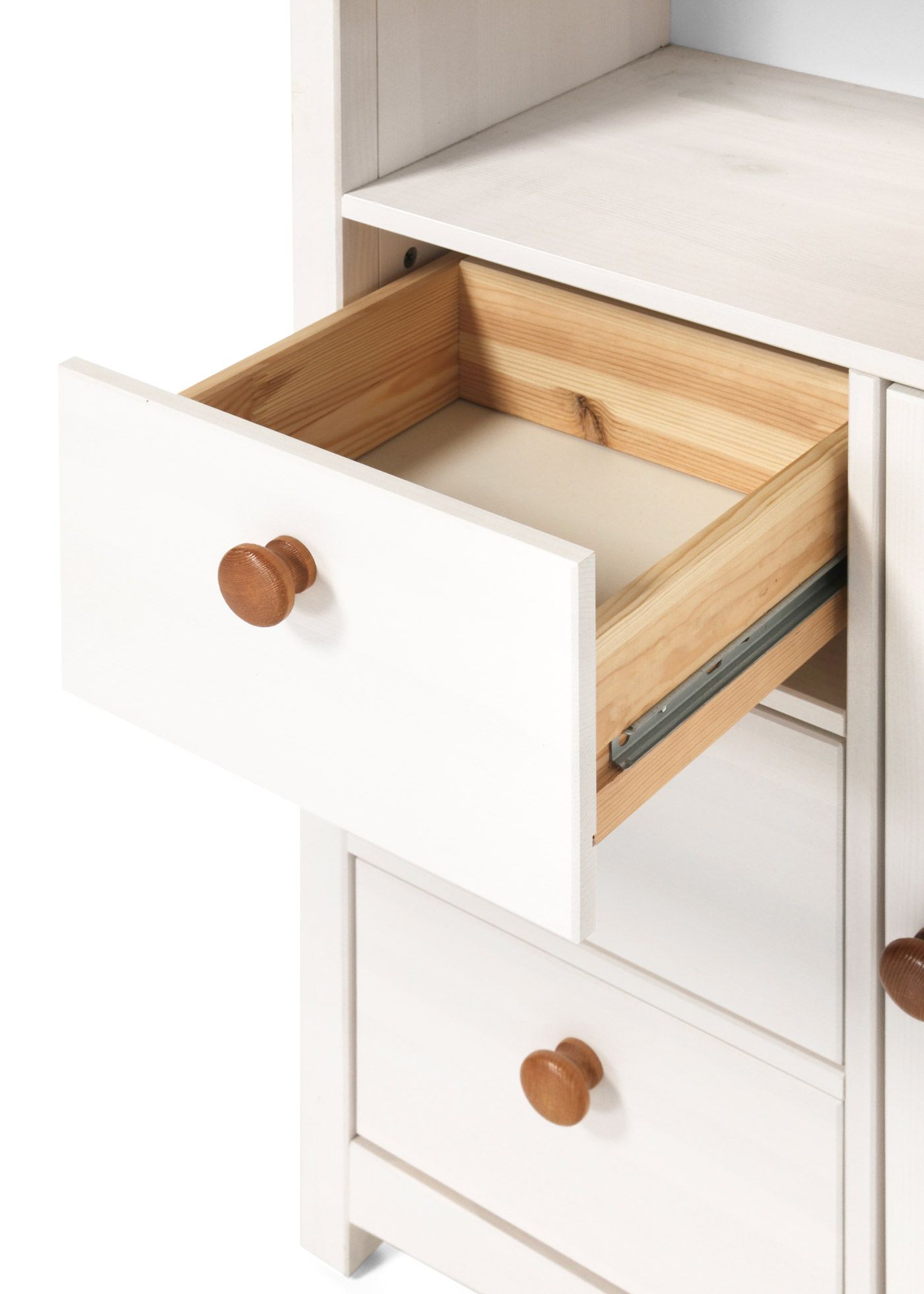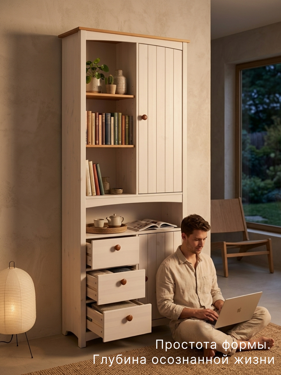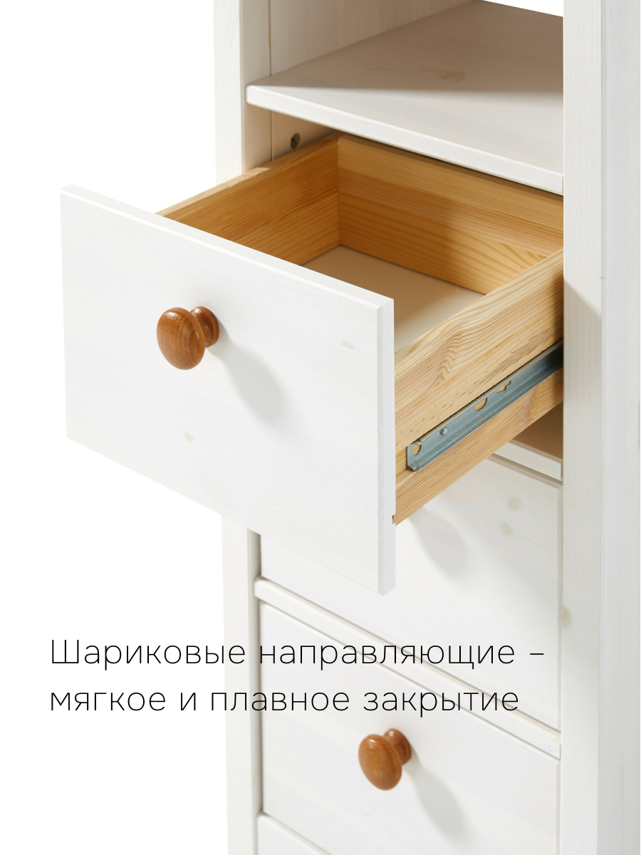 Натуральный массив сосны обеспечивает долговечность и экологичность изделия. Конструкция устойчива, не скрипит и выдерживает повседневные нагрузки. Задняя стенка из белого ДВП, металлические направляющие и качественные петли гарантируют долгий срок службы, а безопасная отделка подчёркивает естественную текстуру дерева, создавая уют и тепло в комнате.