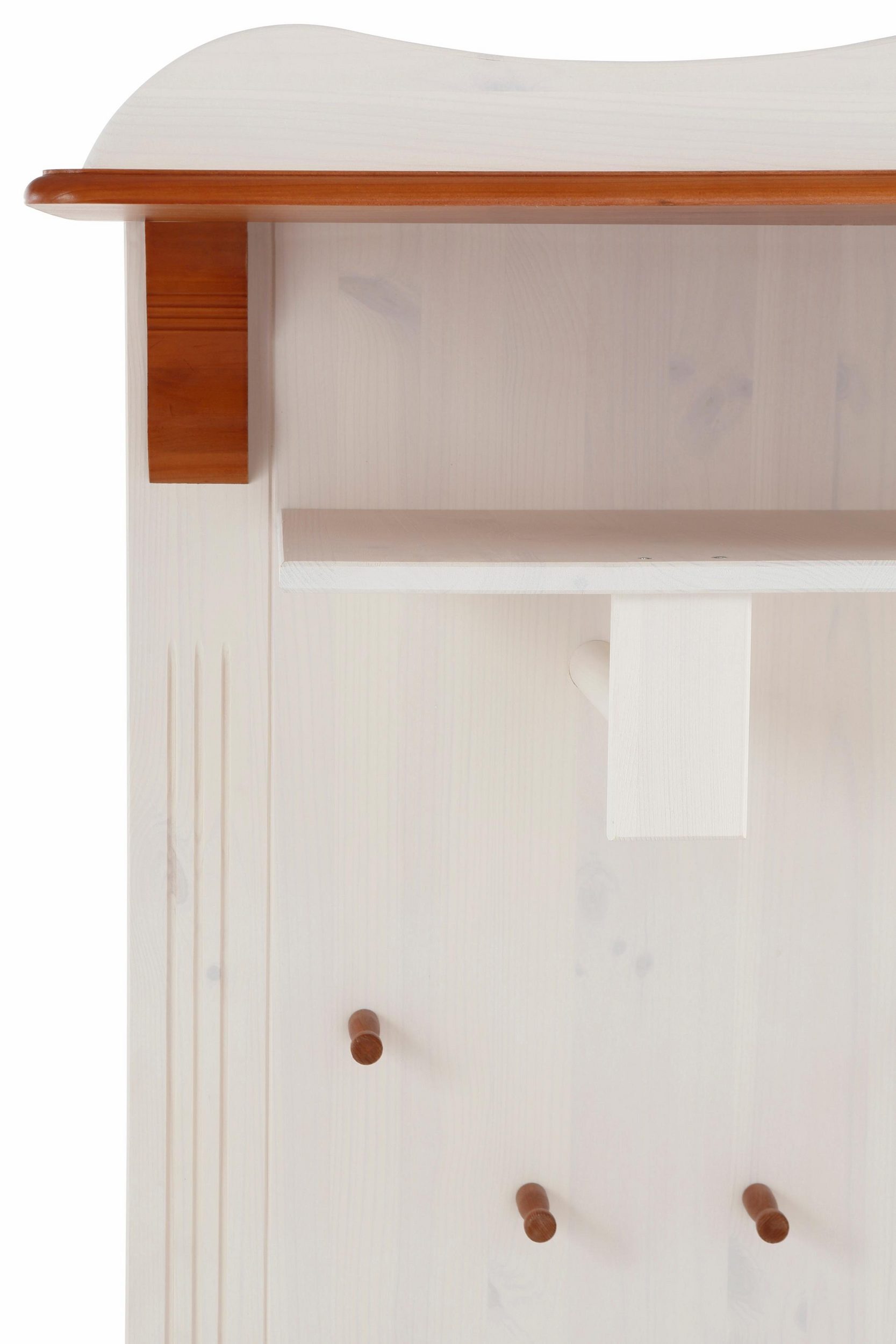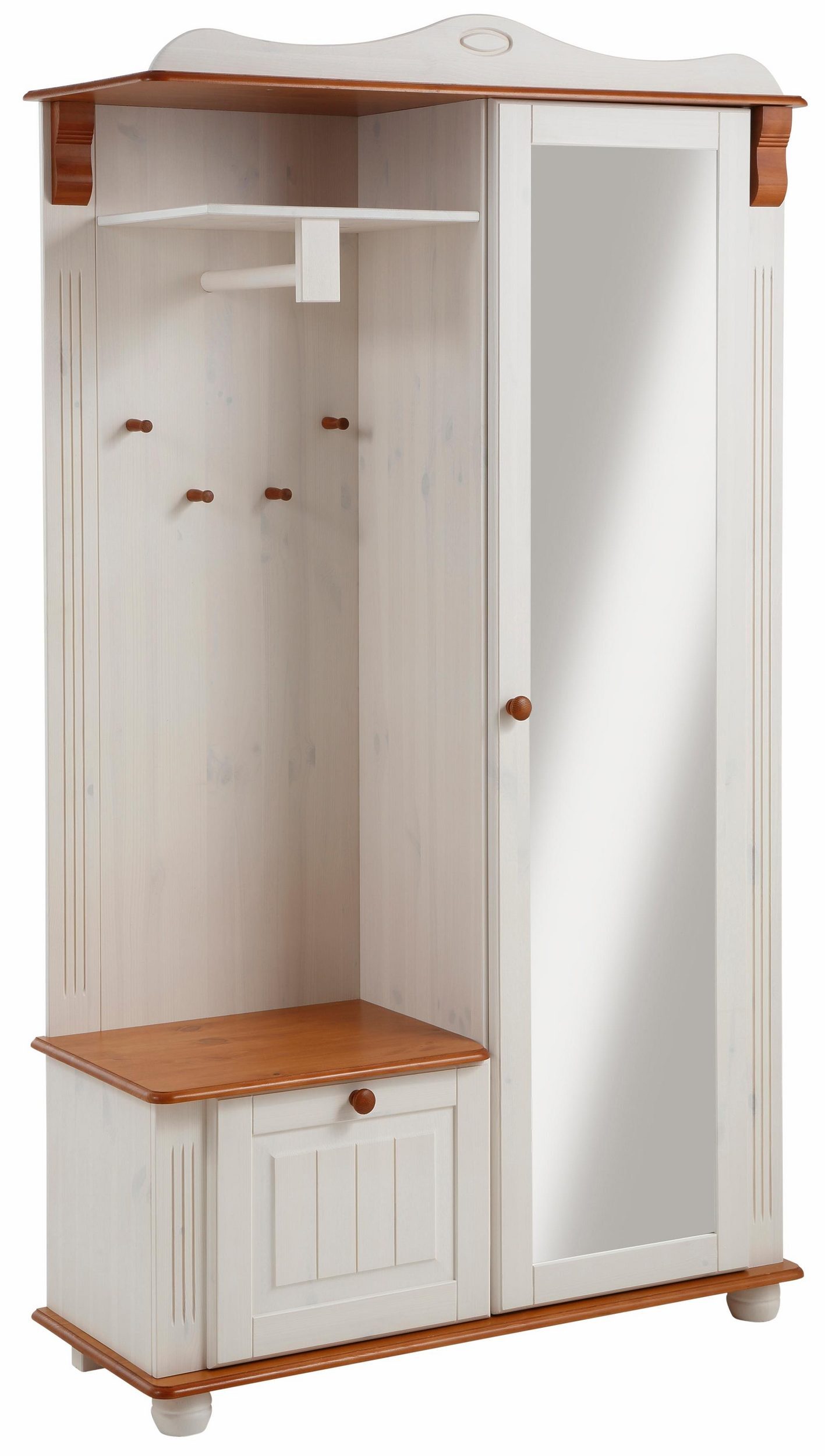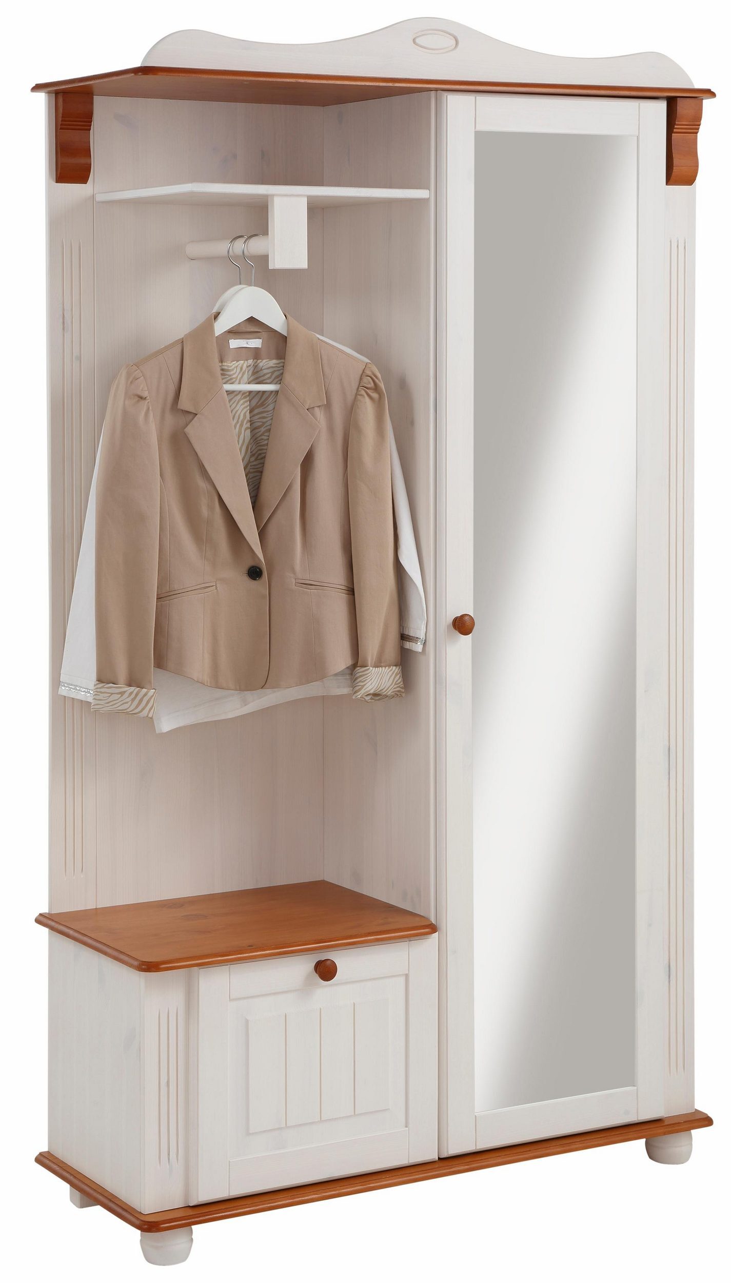 Гардероб Adele изготовлен из массива сосны. На двери расположено зеркало в полный рост. Много места для хранения создается за счет наличия небольшой тумбы-скамьи для обуви, открытых вешалок для одежды и места за дверью. На открытой полочке удобно хранить аксессуары для верхней одежды: шарфики, шапки, перчатки. За дверями можно аккуратно разместить плащи, палито и куртки.