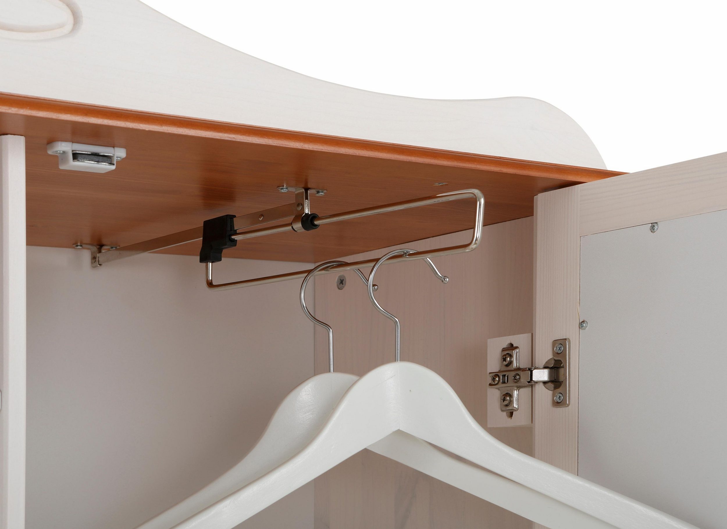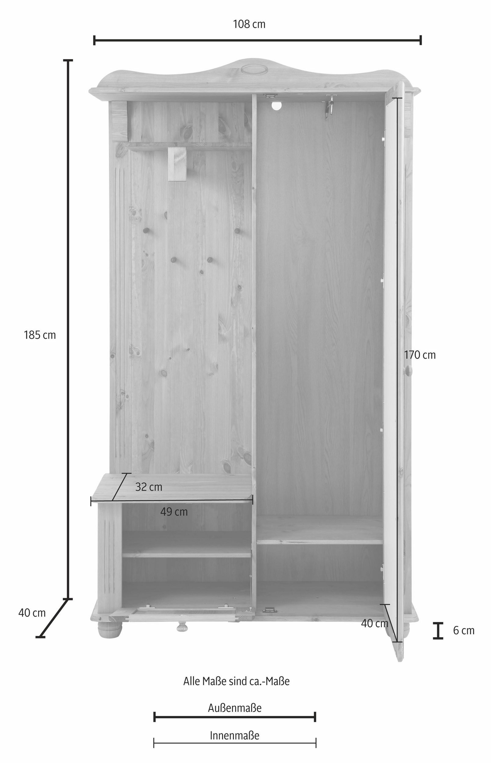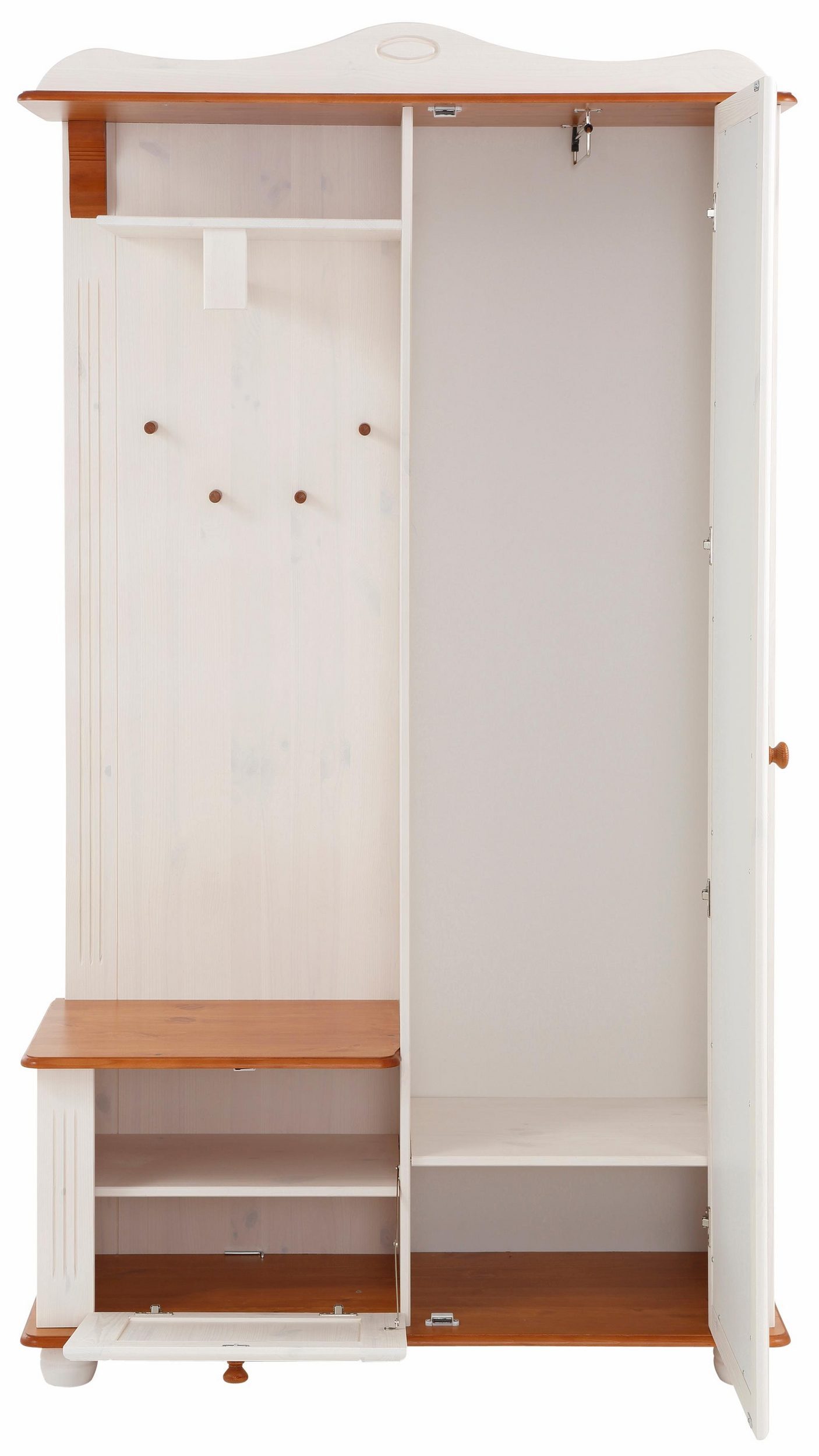Гардероб Adele изготовлен из массива сосны. На двери расположено зеркало в полный рост. Много места для хранения создается за счет наличия небольшой тумбы-скамьи для обуви, открытых вешалок для одежды и места за дверью. На открытой полочке удобно хранить аксессуары для верхней одежды: шарфики, шапки, перчатки. За дверями можно аккуратно разместить плащи, палито и куртки.
