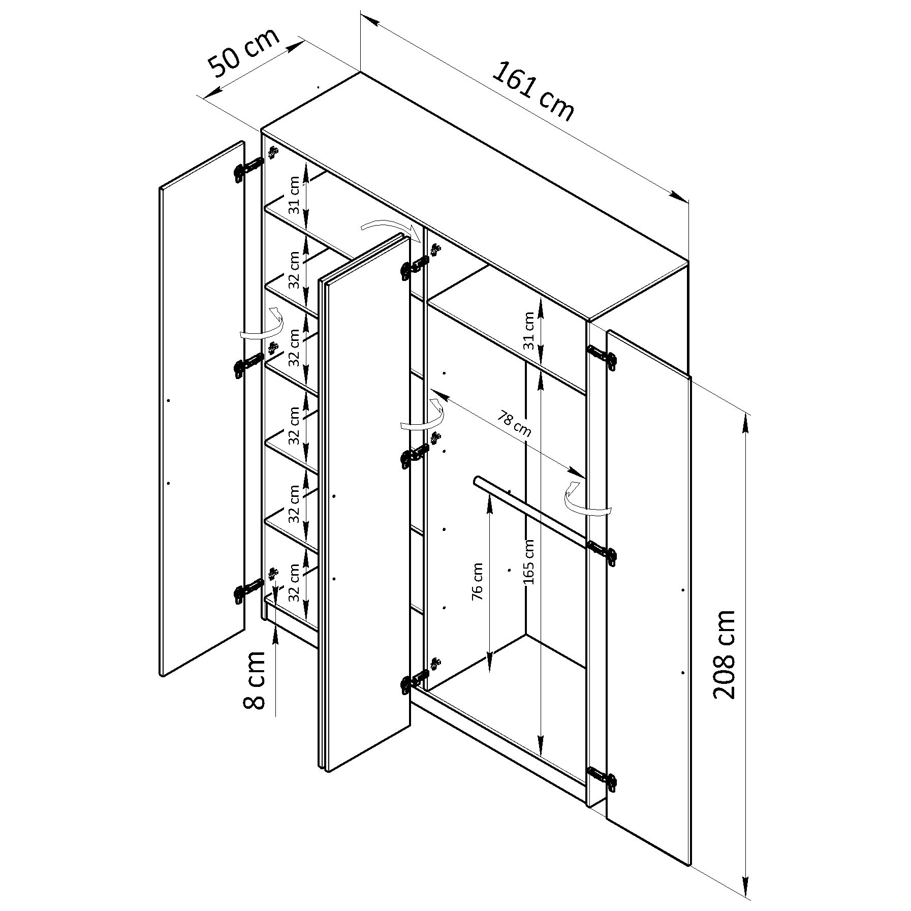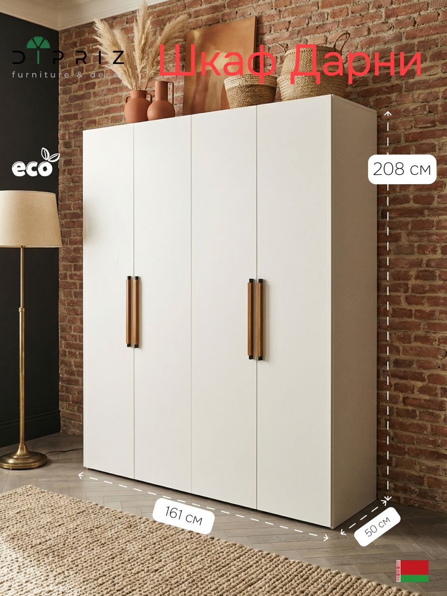 Просторный и вместительный: Большие габариты (ВхШхГ: ~208x161x50 см) позволяют разместить обширный гардероб.