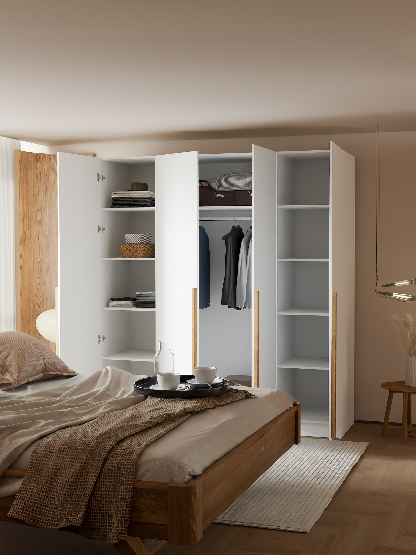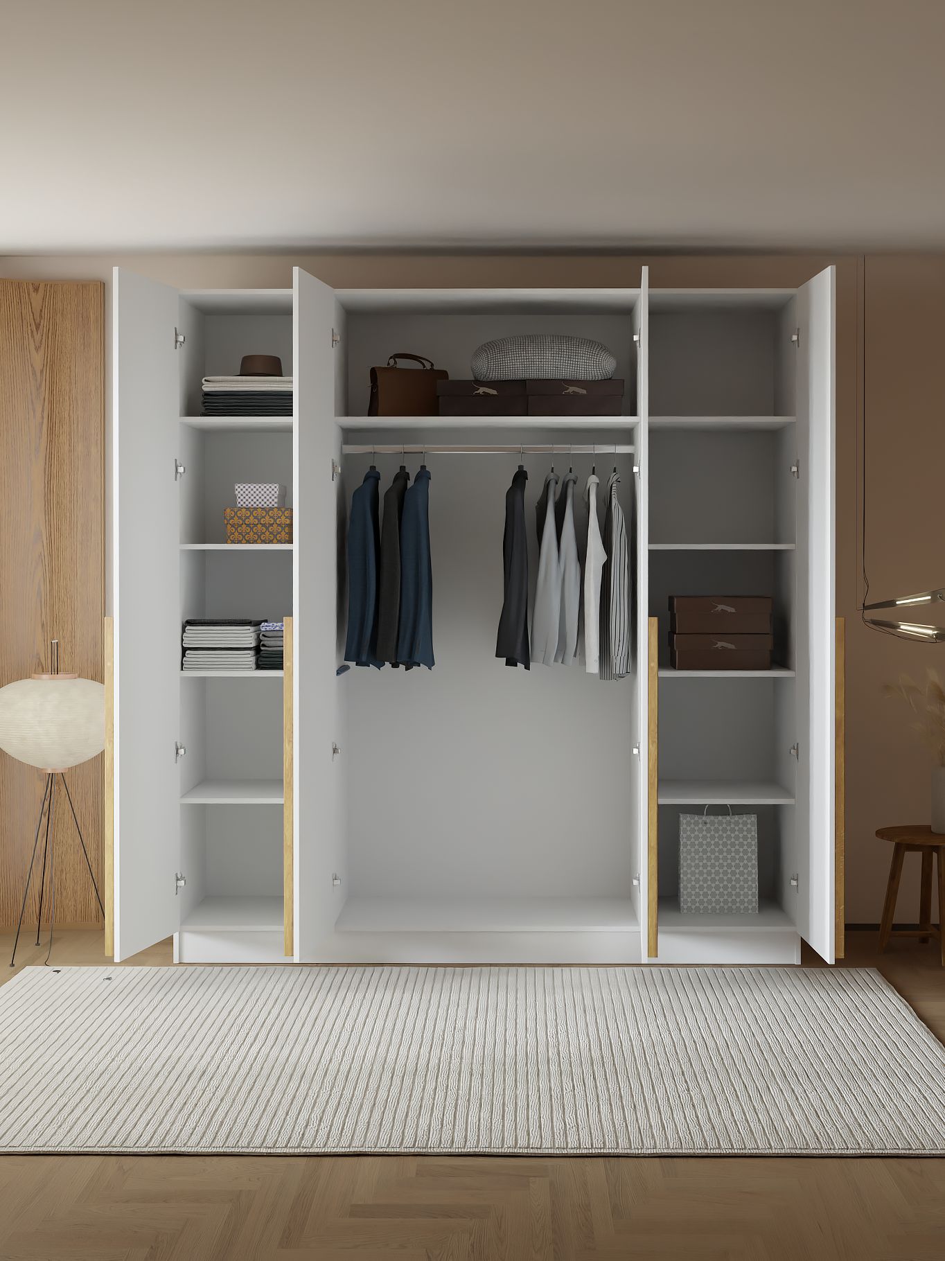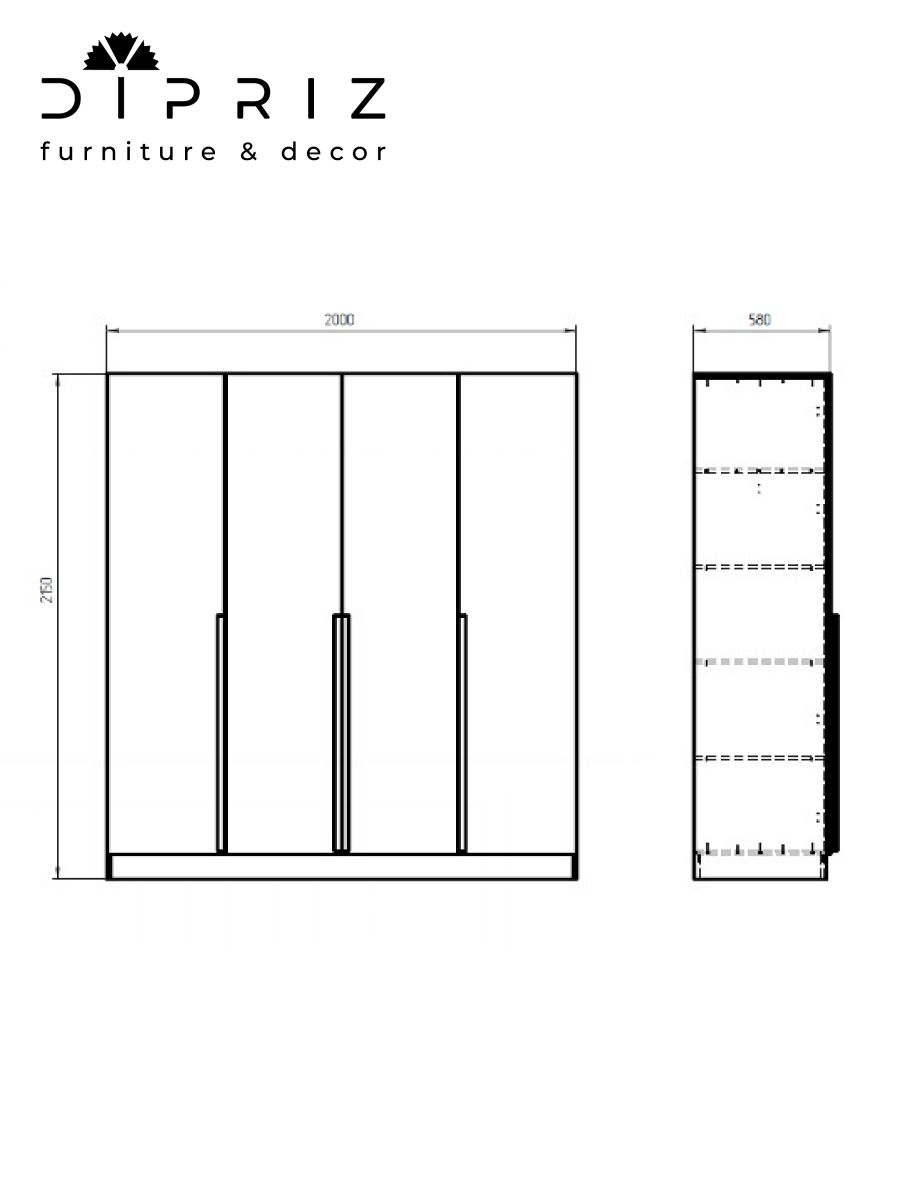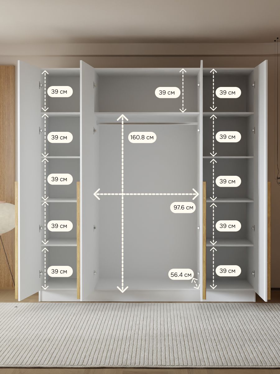 Благодаря габаритам 215×200×58 см шкаф вмещает всё необходимое, при этом оставаясь достаточно компактным для размещения в спальне, гардеробной или прихожей. Внутреннее пространство удобно организовано: отделения с полками и штангой позволяют хранить как сложенные, так и висящие вещи.