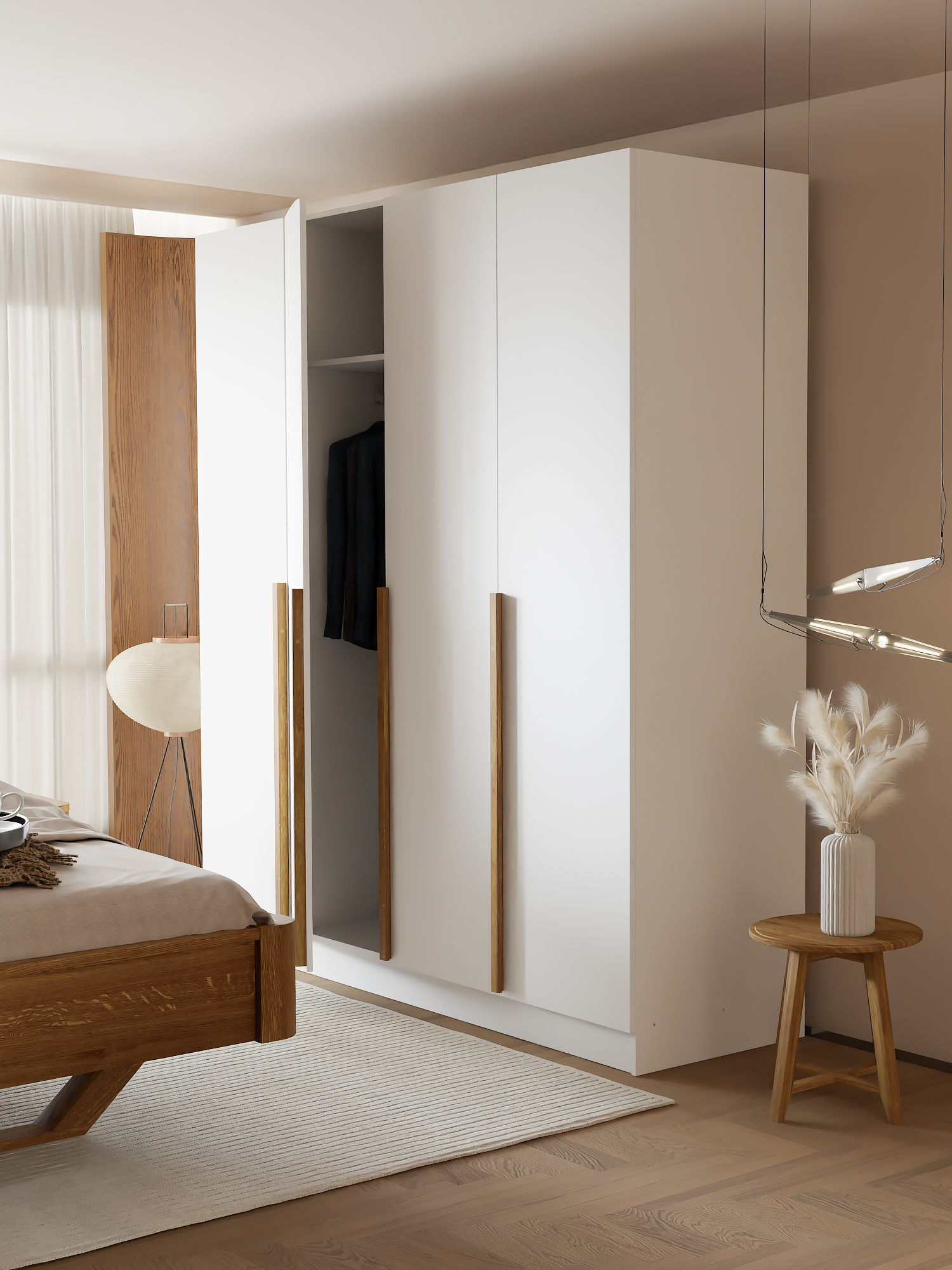 Просторный и функциональный шкаф "Джамбо" станет надёжным решением для хранения одежды, белья и других вещей. Выполнен из качественного ЛДСП, устойчивого к царапинам и истиранию, а стильные ручки из массива дуба добавляют изделию тёплый акцент и подчёркивают природную эстетику.