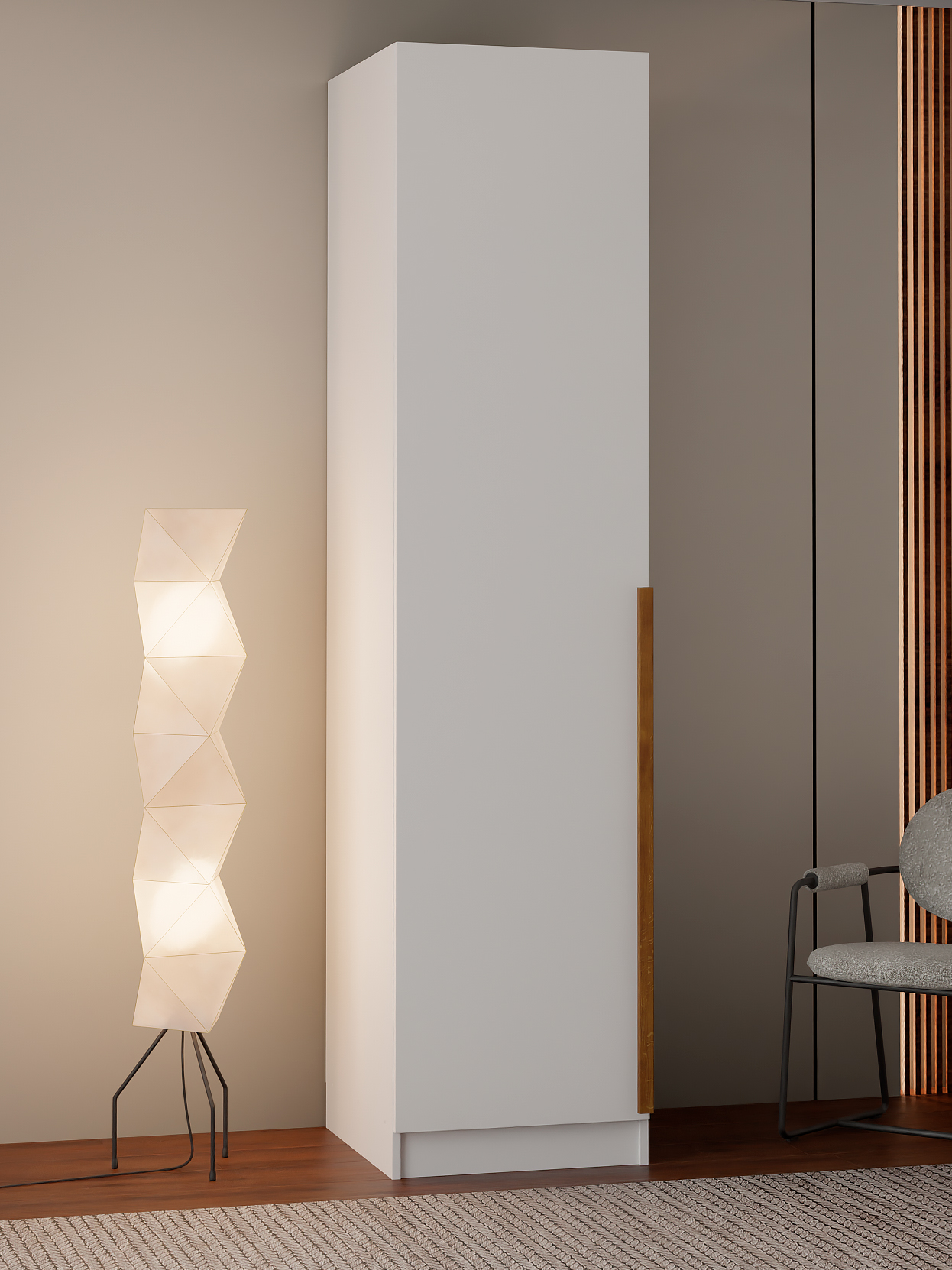 Особое внимание привлекают ручки. Они выполнены из массива дуба, начинаются от верха дверей и спускаются чуть ниже середины. Это не просто элемент дизайна — это акцент, который делает шкаф уникальным. Прикосновение к дубовым ручкам дарит тепло и комфорт, а их форма продумана так, чтобы открывать двери было удобно даже кончиками пальцев.