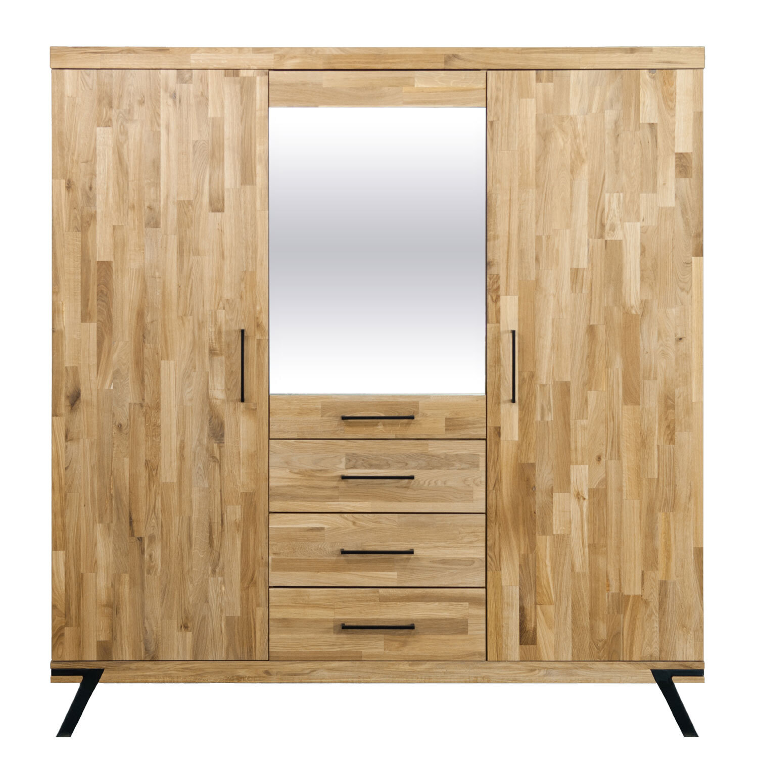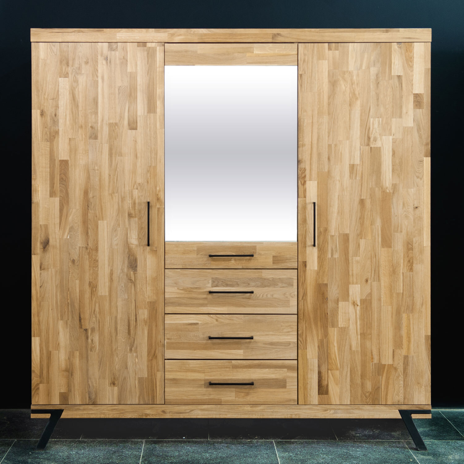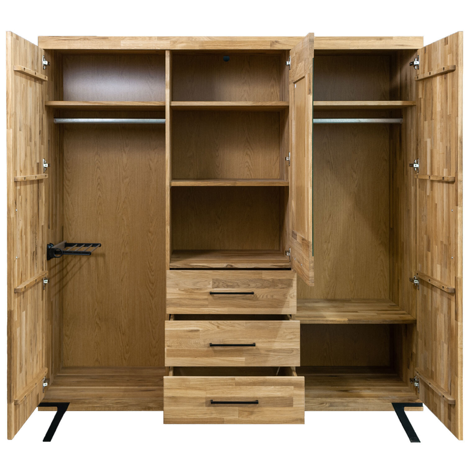 Шкаф из премиальной коллекции Флеверс изготовлен из экологичного материала - из массива дуба. Это очень крепкое и твердое дерево, которое более устойчиво к негативному внешнему воздействию, чем более мягкие породы дерева, как, например, сосна. Мебель из массива славится своей статусностью и долгими сроками службы. Благодаря масляному покрытию, нам удалось сохранить тактильно естественную текстуру и натуральный внешний вид.Шкаф с 3-мя распашными фасадами и 3-мя выдвижными ящиками устанавливается на металлические ножки высотой 19 см. Благодаря такой высоте под ним легко проводить уборку. За распашными фасадами находятся полки, штанги для вешалок и откидная брючница. Для большего комфорта мы добавили зеркало на фасад.Тщательно подобранная фурнитура гарантирует надёжный и долгий срок эксплуатации. Для распашных фасадов мы использовали накладные петли HETTICH с доводчиками, которые обеспечивают тихое и плавное закрытие. На ящики установлены скрытые направляющие с доводчиками частичного выдвижения. Также мы предусмотрели крепления к стене для надежной фиксации.В комплекте идёт два вида ручек на Ваш выбор: 1 - металлические ручки скобы; 2 - ручки из массива.Для поддержания единой стилистики интерьера шкаф можно сочетать с другими элементами коллекции Флеверс. Шкаф с уникальным дизайном впишется во многие стили интерьера (стиль лофт, стиль минимализм, современный стиль) и подчеркнёт изысканный вкус хозяев. Он подойдет для офиса- для хранения документов и для хранения мелочей, для спальни - как место для хранения одежды, для хранения украшений и хранения косметики, Для прихожей - для хранения обуви и для хранения вещей.