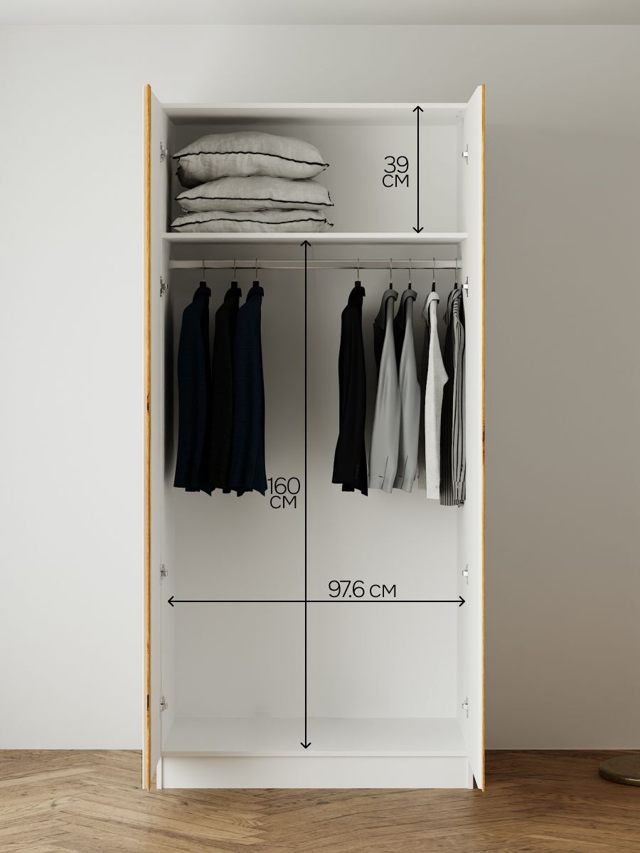 Благодаря своим габаритам шкаф вмещает всё необходимое, при этом оставаясь достаточно компактным для размещения в спальне, гардеробной или прихожей. Внутреннее пространство удобно организовано: отделения с полками и штангой позволяют хранить как сложенные, так и висящие вещи.
