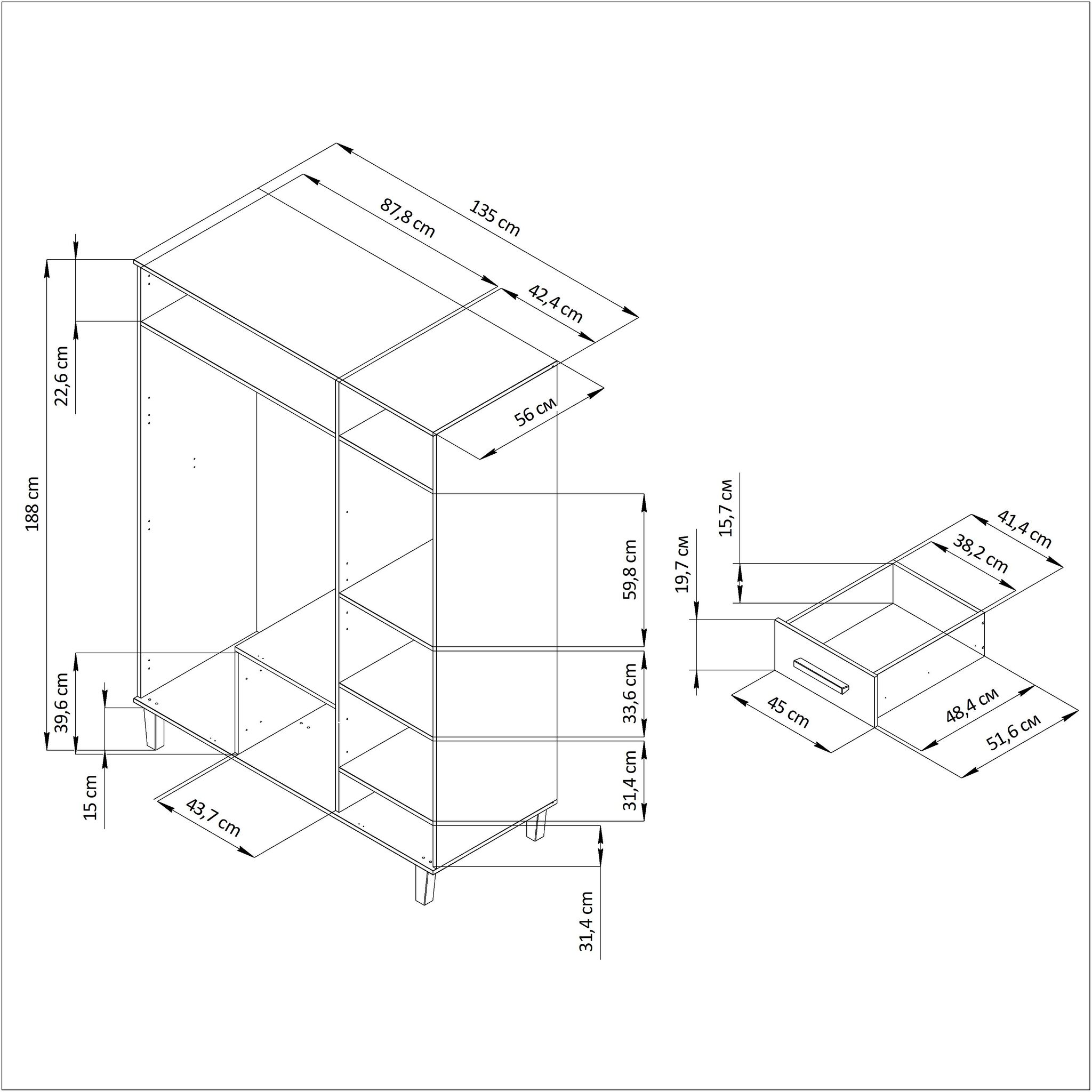 Внутренняя система хранения шкафа разработана с учетом ваших потребностей. За правой дверью расположены четыре съемные полки. Важно то, что расстояние между ними можно регулировать в зависимости от размеров ваших вещей, что обеспечивает оптимальное использование пространства. Это позволит вам организовать хранение так, как вам удобно — от одежды до игрушек и аксессуаров.