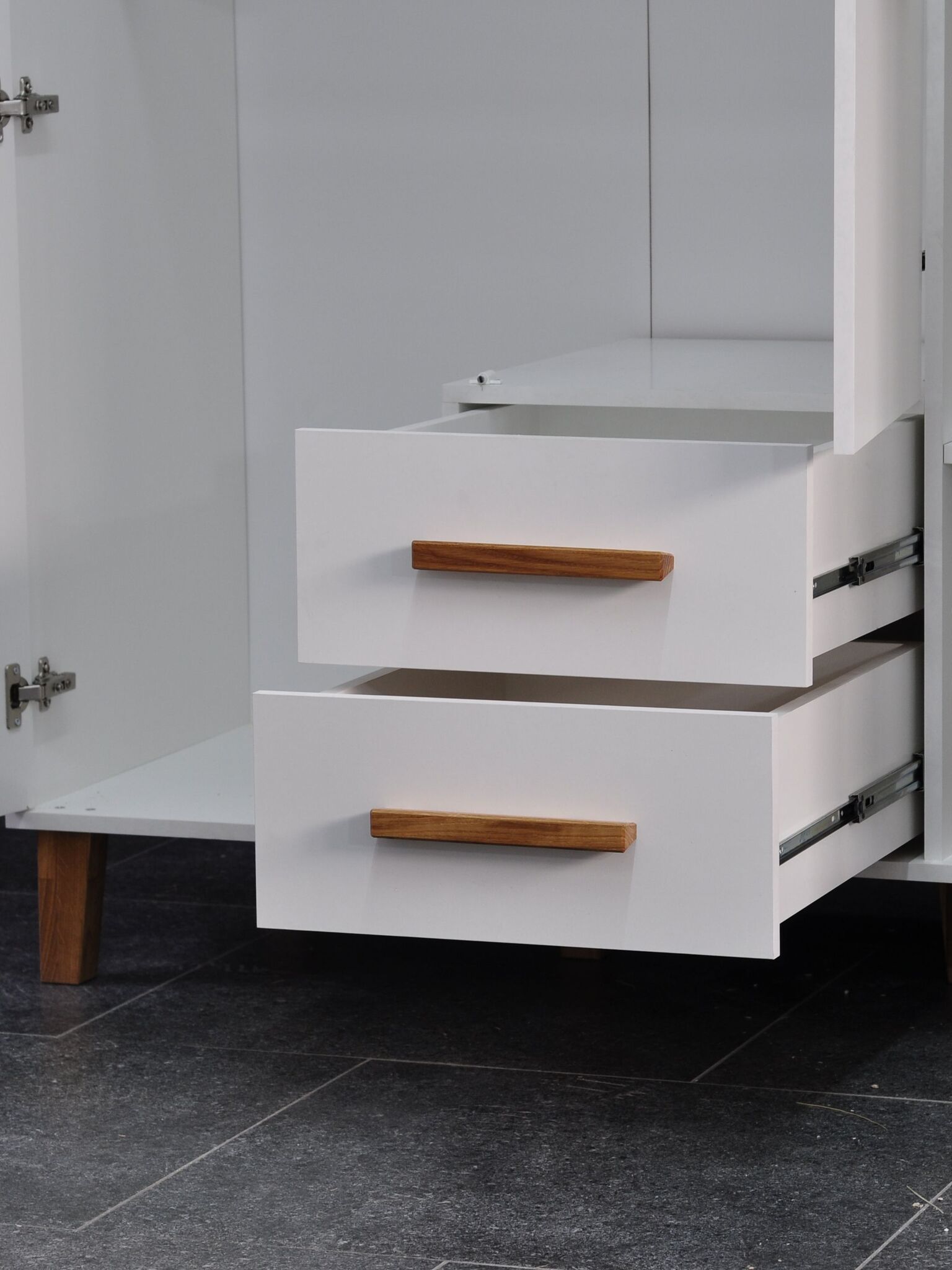 Шкаф изготовлен из высококачественных материалов, ЛДСП и ДВП, обеспечивая долговечность и надежность. Ножки и ручки, выполненные из массива дуба и покрыты лаком, что добавляет природную красоту и утонченность изделию. Для ящиков использовались шариковые направляющие, что создает плавное скольжение и продлевает срок эксплуатации.