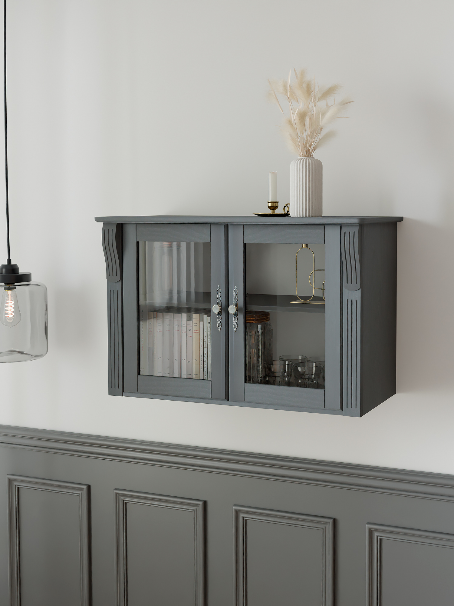 Натуральное дерево с благородным покрытием шкаф навесной выполнен из массива сосны, покрыт серым воском на водной основе. Такая обработка подчеркивает природную текстуру дерева и обеспечивает защиту от царапин и механических повреждений.