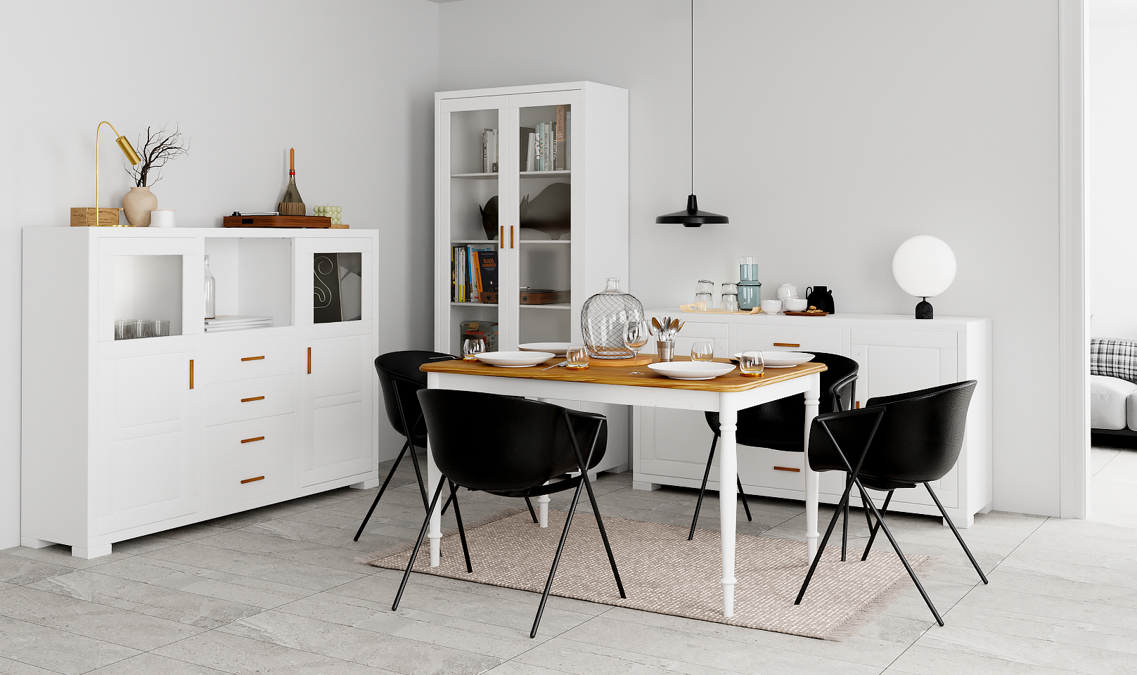Универсальная белая витрина высотой 204 см — стильное решение для просторной гостиной или комнаты, где собирается вся семья.
