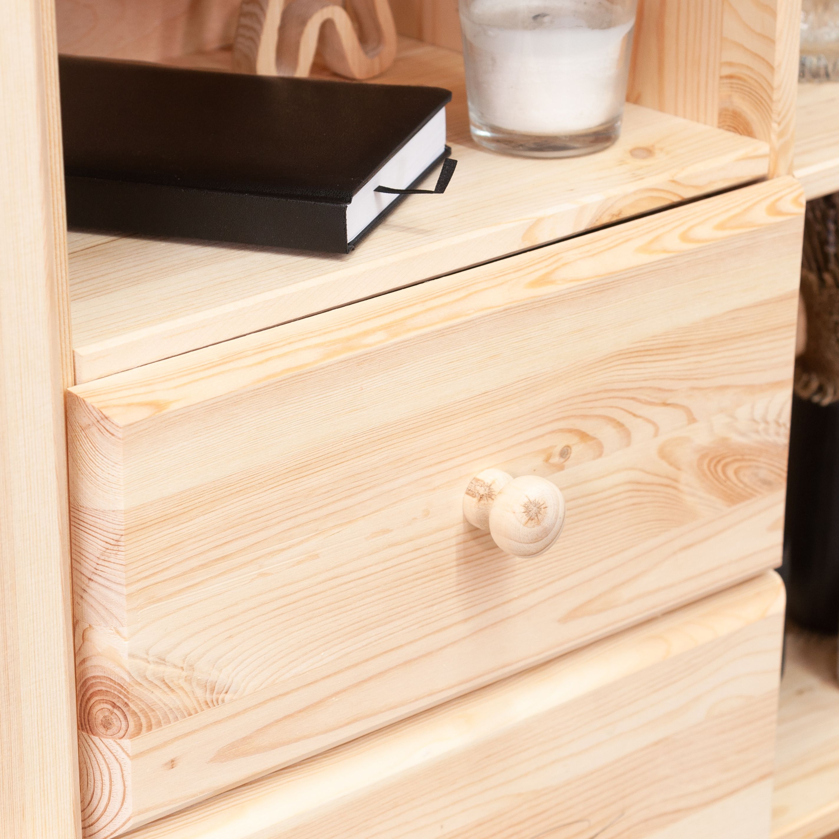 Поверхность и края изделия тщательно отшлифованы, что предотвратит случайные удары или повреждения. Шкаф покрыт прозрачным натуральным лаком на водной основе, благодаря чему приятный хвойный запах и полезные свойства дерева сохранены. Мебель имеет нежный бежевый оттенок, который подойдет для размещения в любой комнате. Фаски шкафа были сглажены с целью предотвращения случайных ударов или зацепов.