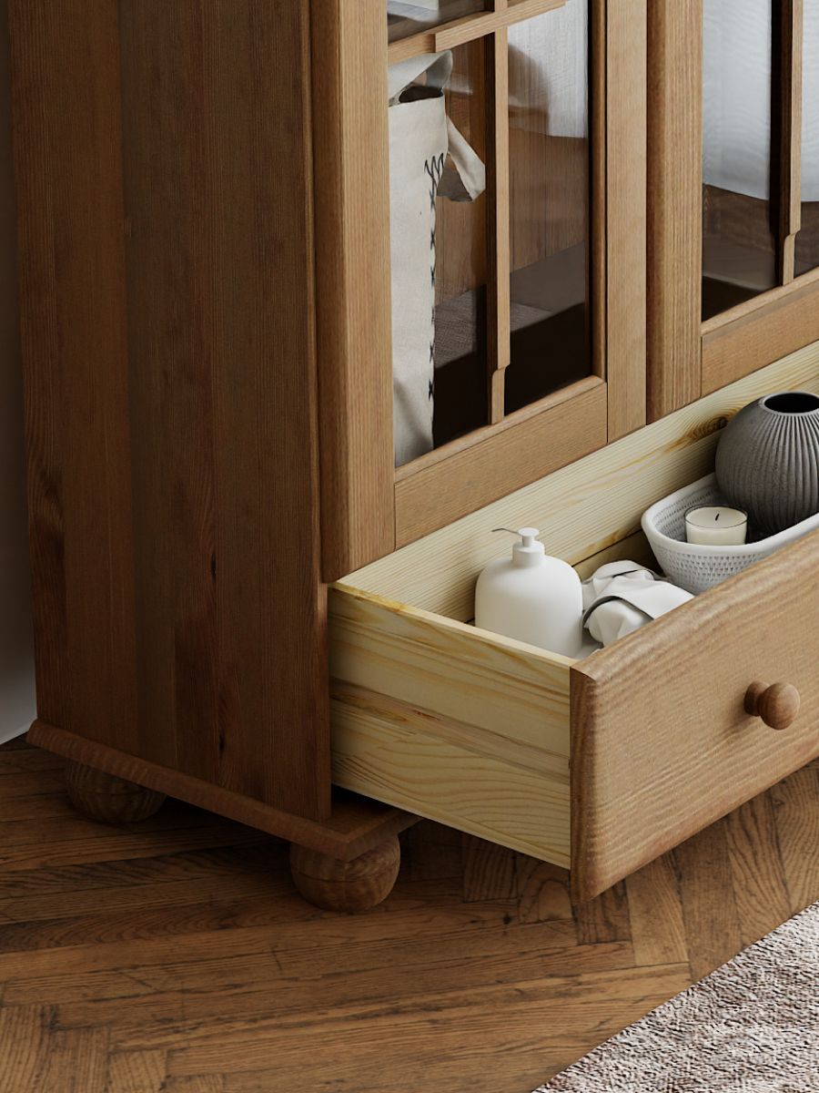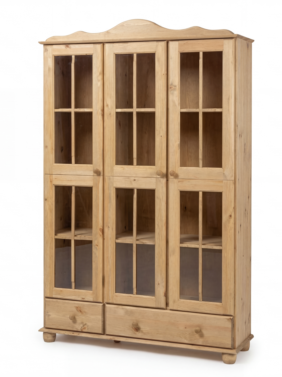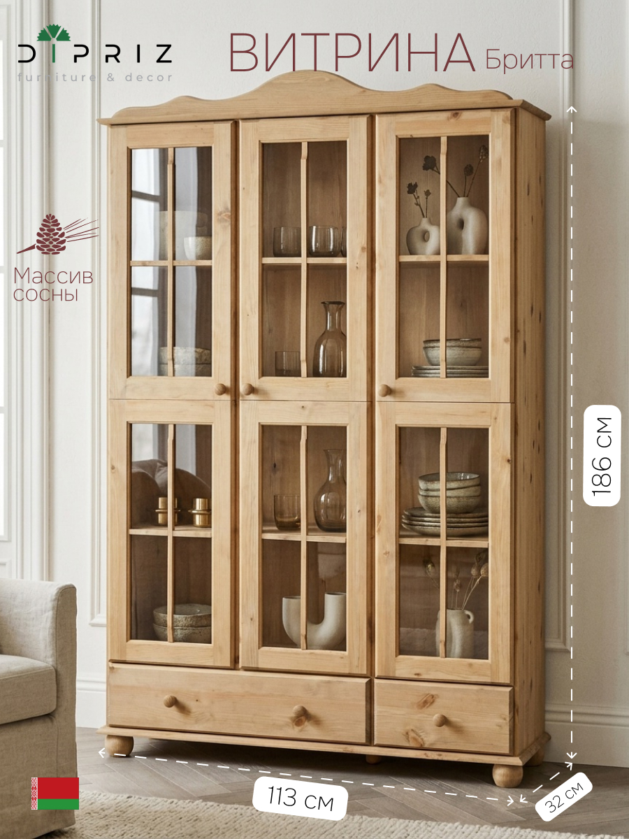 Шкаф с витриной изготовлена из натурального дерева сосны от белорусского производителя мебели "Диприз". Шкаф с витриной отличается элегантным современным дизайном, который легко сочетается с любым стилем и декором! Двери витрины оснащены стеклянными вставками. На деревянных полках найдут свое место различные скульптуры и книги, также можно разместить стаканы, чашки и другую посуду, так и для домашней библиотеки или личных вещей. Шкаф с витриной будет отлично смотреться в вашем загородном доме. Материал задней стенки буфета витрины - ДВП золотой крафт, дно ящика - ДВП белое, остальное - сосна. Размер ящиков - 297*246*142,8(М), 663*246*142,8(Б). Толщина дерева двери и фасада ящика - 18мм, остальное - 14мм. Комплектация составляет: 8 полок и 2 ящика.