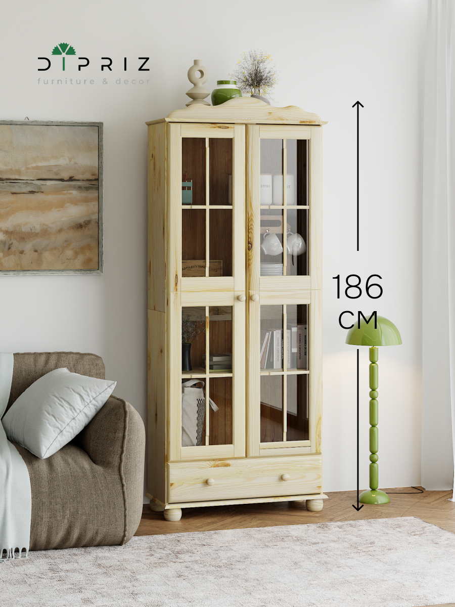 Шкаф с витриной изготовлена из натурального дерева сосны от белорусского производителя мебели "Диприз". Шкаф с витриной отличается элегантным современным дизайном, который легко сочетается с любым стилем и декором! Двери витрины оснащены стеклянными вставками. На деревянных полках найдут свое место различные скульптуры и книги, также можно разместить стаканы, чашки и другую посуду, так и для домашней библиотеки или личных вещей. Шкаф с витриной будет отлично смотреться в вашем загородном доме. Материал задней стенки и дно ящика - фанера, остальное - сосна. Размер ящиков - 663*246*142,8. Толщина дерева двери и фасада ящика - 18мм, остальное - 14мм. Комплектация составляет: 4 полки и 1 ящик.