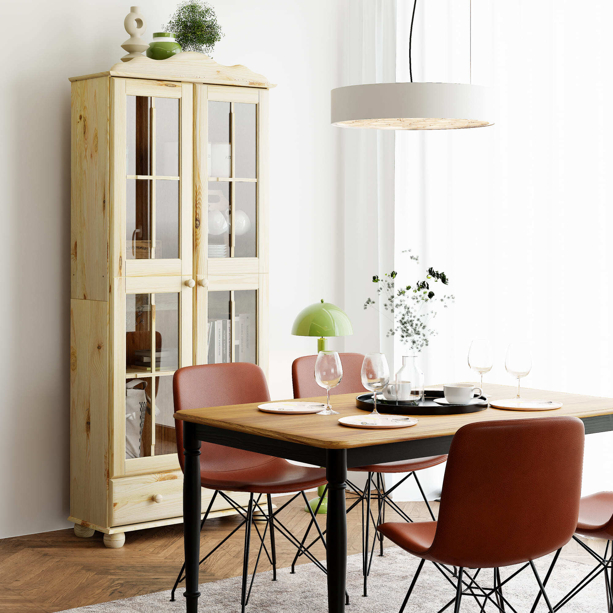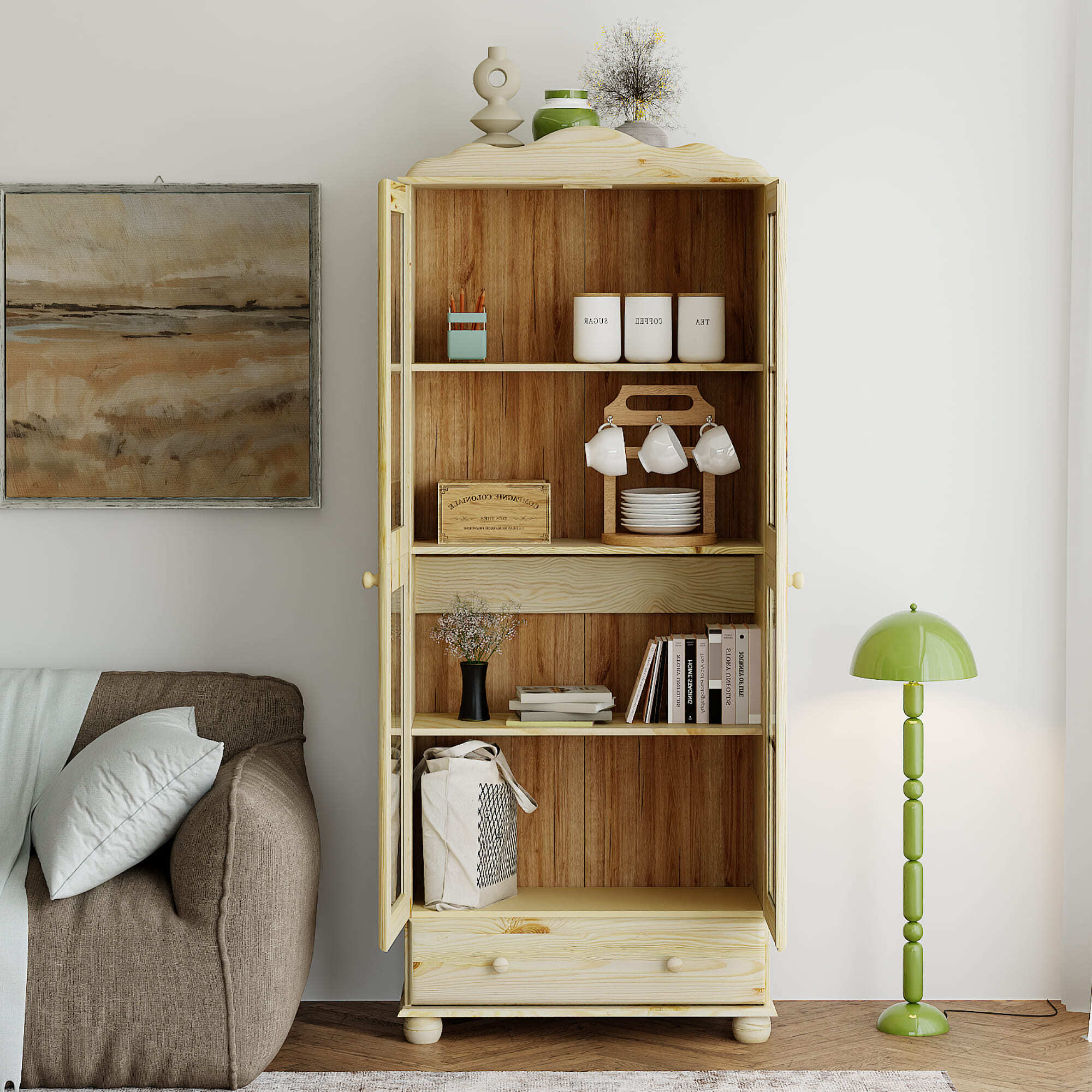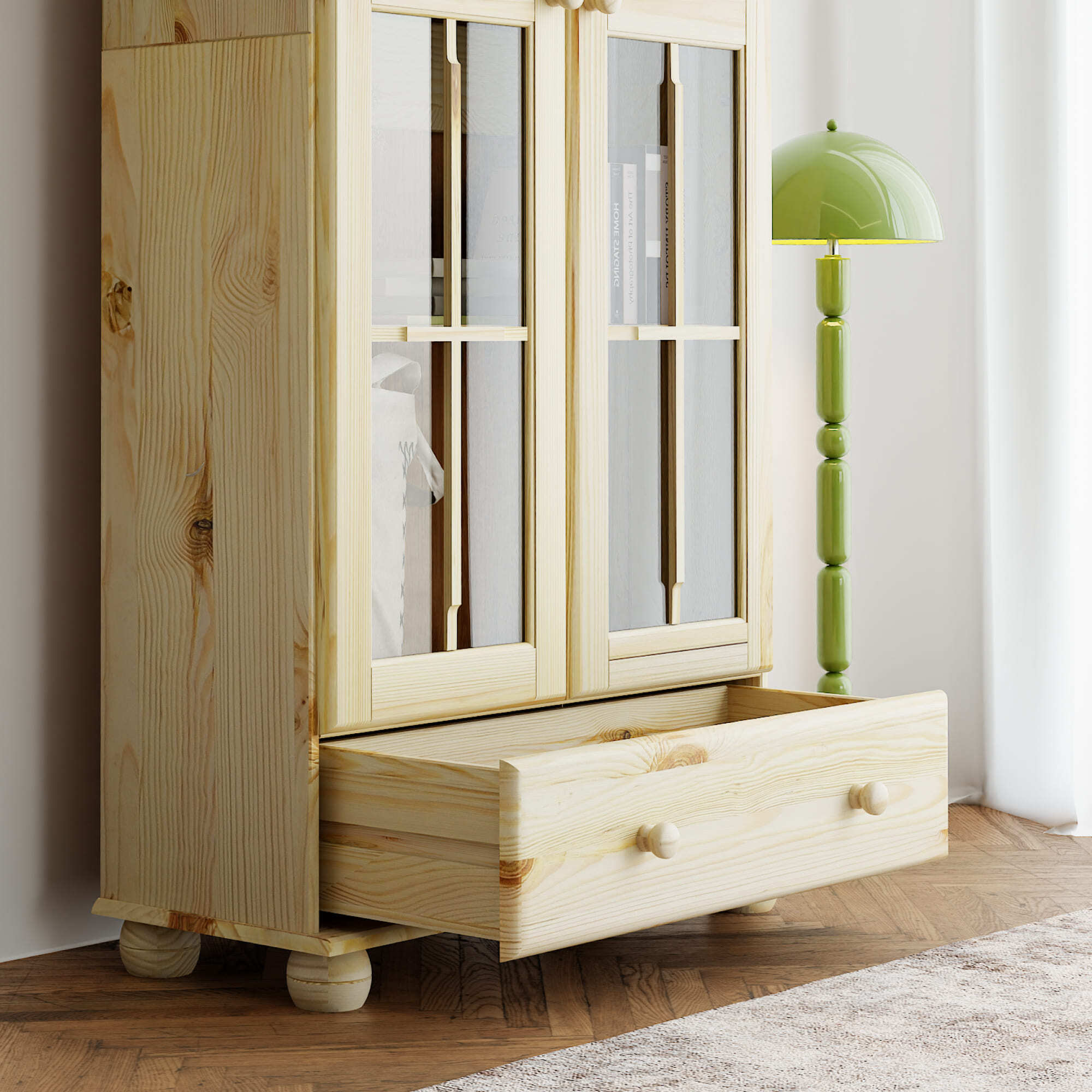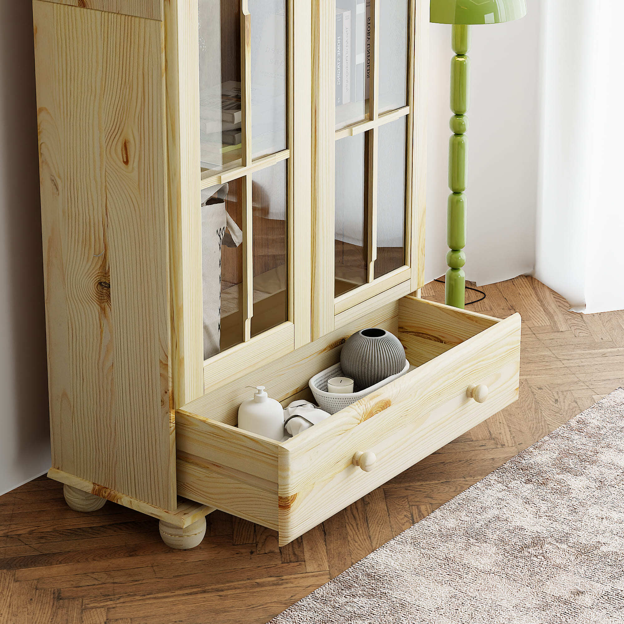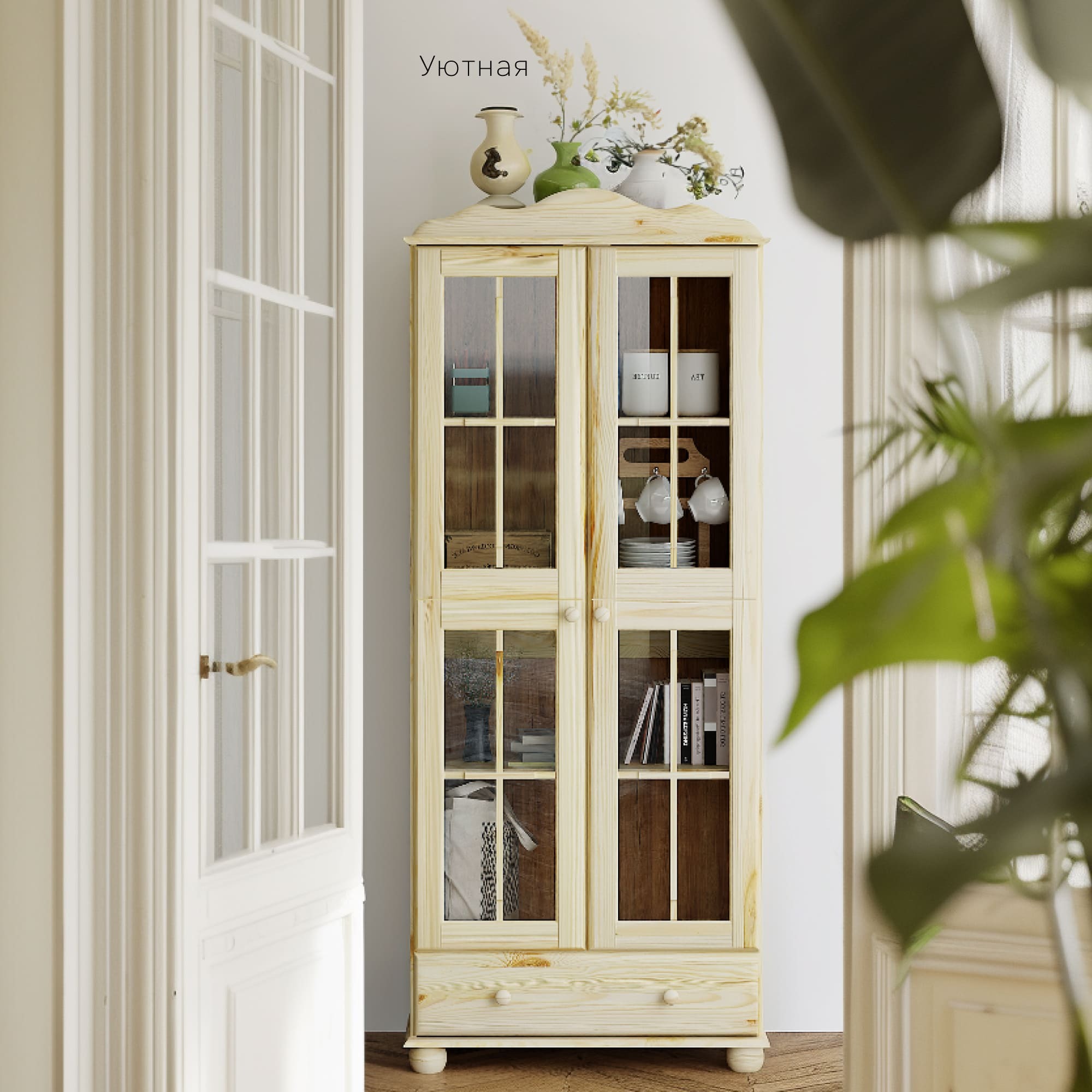 Шкаф с витриной изготовлена из натурального дерева сосны от белорусского производителя мебели "Диприз". Шкаф с витриной отличается элегантным современным дизайном, который легко сочетается с любым стилем и декором! Двери витрины оснащены стеклянными вставками. На деревянных полках найдут свое место различные скульптуры и книги, также можно разместить стаканы, чашки и другую посуду, так и для домашней библиотеки или личных вещей. Шкаф с витриной будет отлично смотреться в вашем загородном доме. Материал задней стенки и дно ящика - фанера, остальное - сосна. Размер ящиков - 663*246*142,8. Толщина дерева двери и фасада ящика - 18мм, остальное - 14мм. Комплектация составляет: 4 полки и 1 ящик.