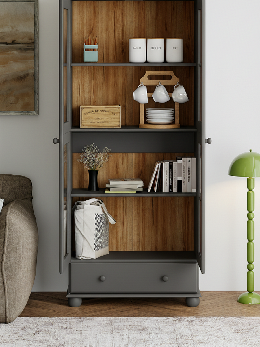 Шкаф-витрина «Бритта» серого цвета от белорусского производителя мебели Диприз — стильный и функциональный сервант для посуды и хранения ваших любимых вещей. Изготовлен из натурального дерева сосны с матовым покрытием, что обеспечивает прочность, долговечность и экологичность. Элегантный современный дизайн шкафа хорошо сочетается с любым интерьером — от классики до современного стиля.