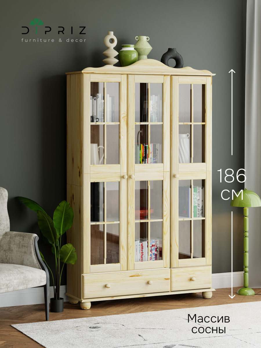 Шкаф с витриной изготовлена из натурального дерева сосны от белорусского производителя мебели "Диприз". Шкаф с витриной отличается элегантным современным дизайном, который легко сочетается с любым стилем и декором! Двери витрины оснащены стеклянными вставками. На деревянных полках найдут свое место различные скульптуры и книги, также можно разместить стаканы, чашки и другую посуду, так и для домашней библиотеки или личных вещей. Шкаф с витриной будет отлично смотреться в вашем загородном доме. Материал задней стенки и дно ящика - фанера, остальное - сосна. Размер ящиков - 297*246*142,8(М), 663*246*142,8(Б). Толщина дерева двери и фасада ящика - 18мм, остальное - 14мм. Комплектация составляет: 4 полки и 1 ящик.