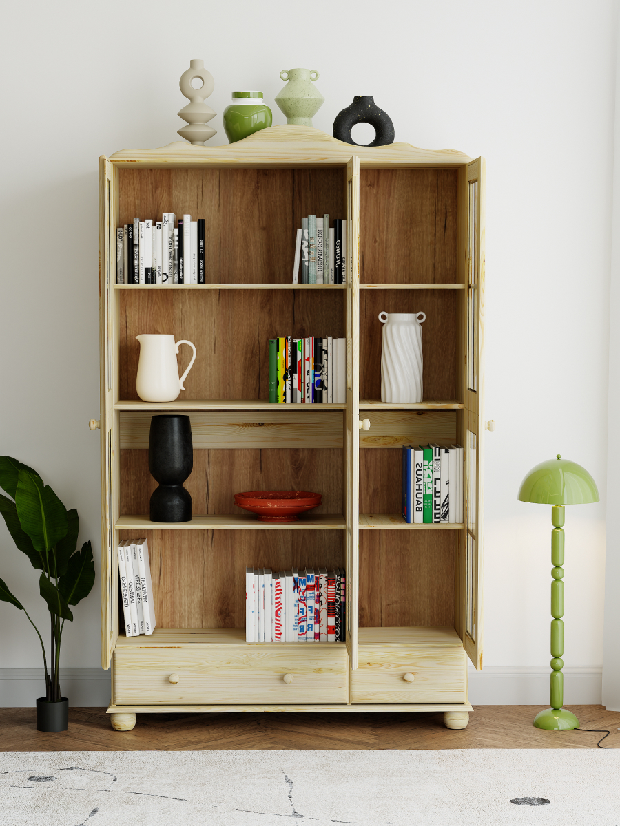 Шкаф с витриной изготовлена из натурального дерева сосны от белорусского производителя мебели "Диприз". Шкаф с витриной отличается элегантным современным дизайном, который легко сочетается с любым стилем и декором! Двери витрины оснащены стеклянными вставками. На деревянных полках найдут свое место различные скульптуры и книги, также можно разместить стаканы, чашки и другую посуду, так и для домашней библиотеки или личных вещей. Шкаф с витриной будет отлично смотреться в вашем загородном доме. Материал задней стенки и дно ящика - фанера, остальное - сосна. Размер ящиков - 297*246*142,8(М), 663*246*142,8(Б). Толщина дерева двери и фасада ящика - 18мм, остальное - 14мм. Комплектация составляет: 4 полки и 1 ящик.