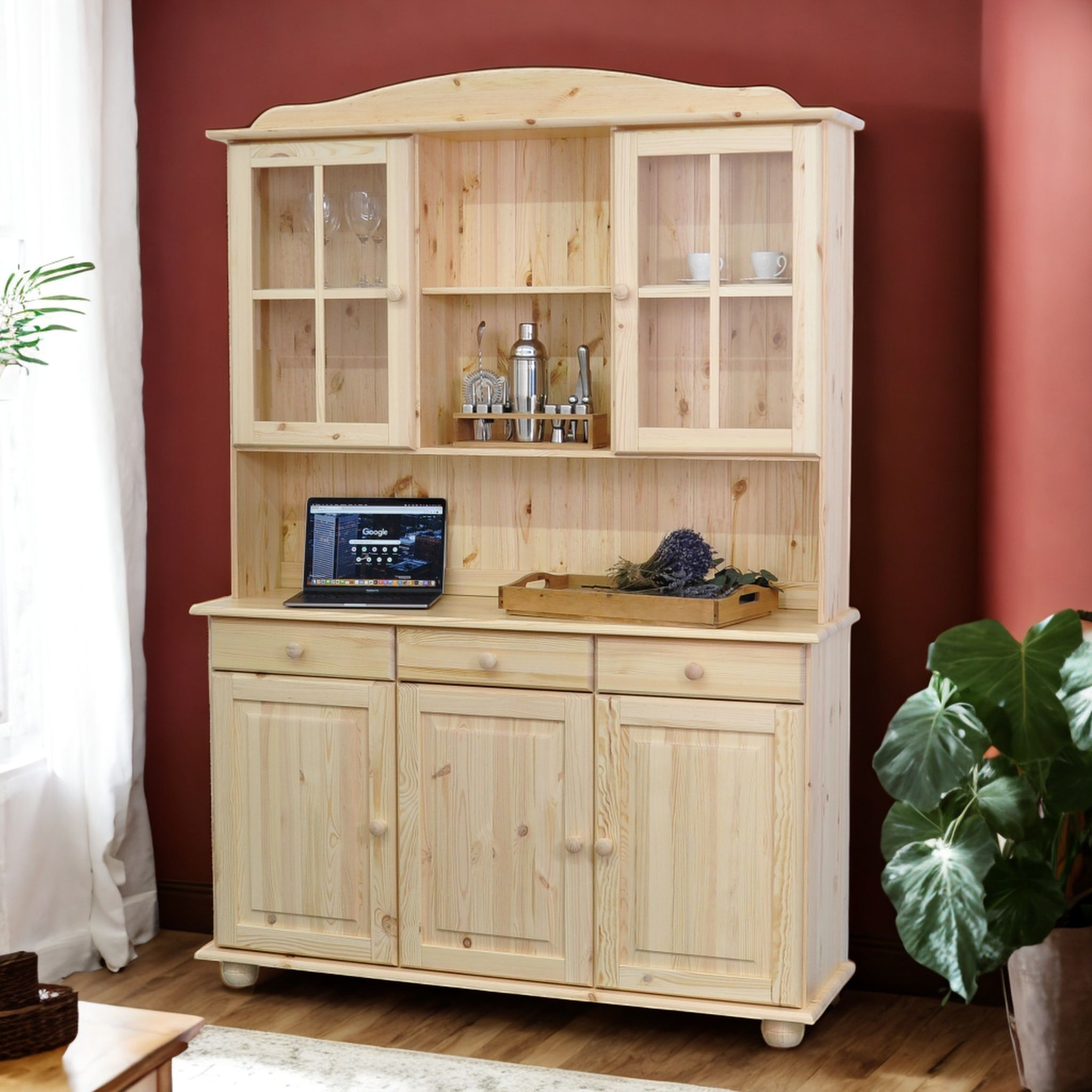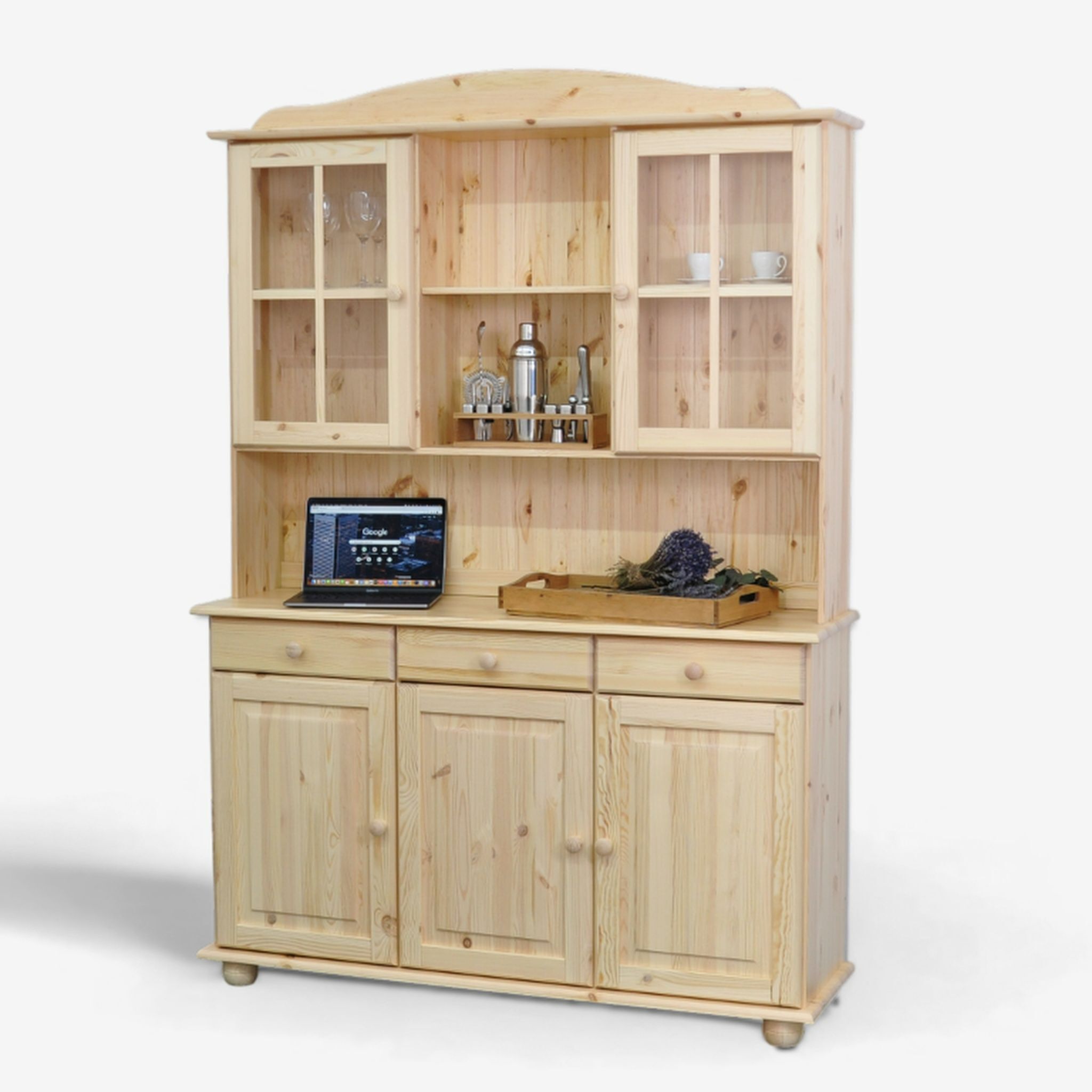 Шкаф-витрина "Лена" изготовлен из массива сосны белорусской компанией "Диприз". Корпус и фасады выполнены из массива сосны, а задняя стенка и дно ящика - из белого ДВП. Мы заботимся о вашем здоровье и окружающей среде, поэтому используем только экологически чистые материалы. Витрина тщательно отшлифована и готова для нанесения любого покрытия или краски для дерева. Вы можете легко адаптировать её под ваш индивидуальный стиль и цветовую гамму интерьера.