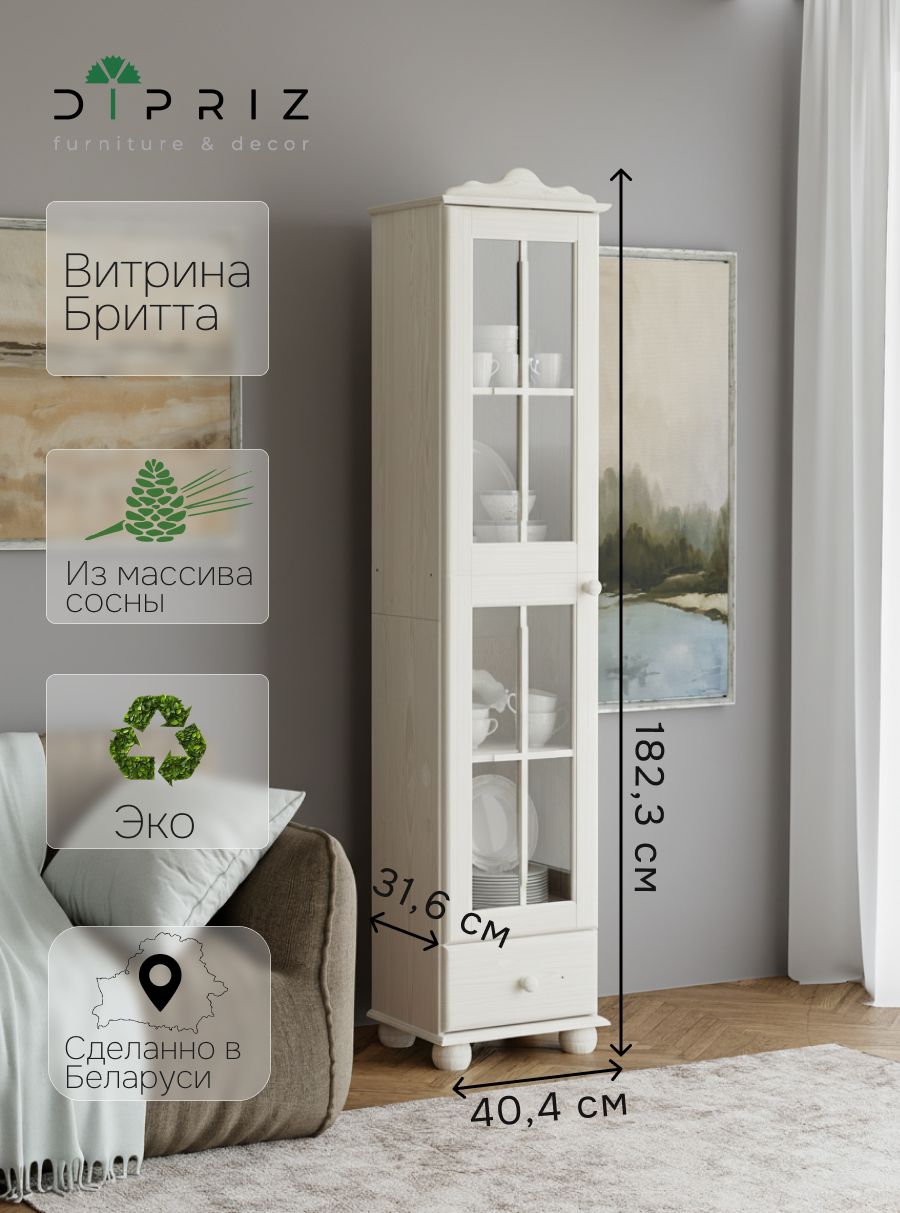 Шкаф витрина для посуды покрыт экологически чистым белым воском на водной основе. Шкаф с витриной отличается элегантным современным дизайном, который легко сочетается с любым стилем и декором! Этот шкаф с витриной создаст тепло и уют в спальне, детской или гостиной. Сервант шкаф для посуды от "Диприз" предоставляет вам уникальную возможность придать ему индивидуальный характер.
